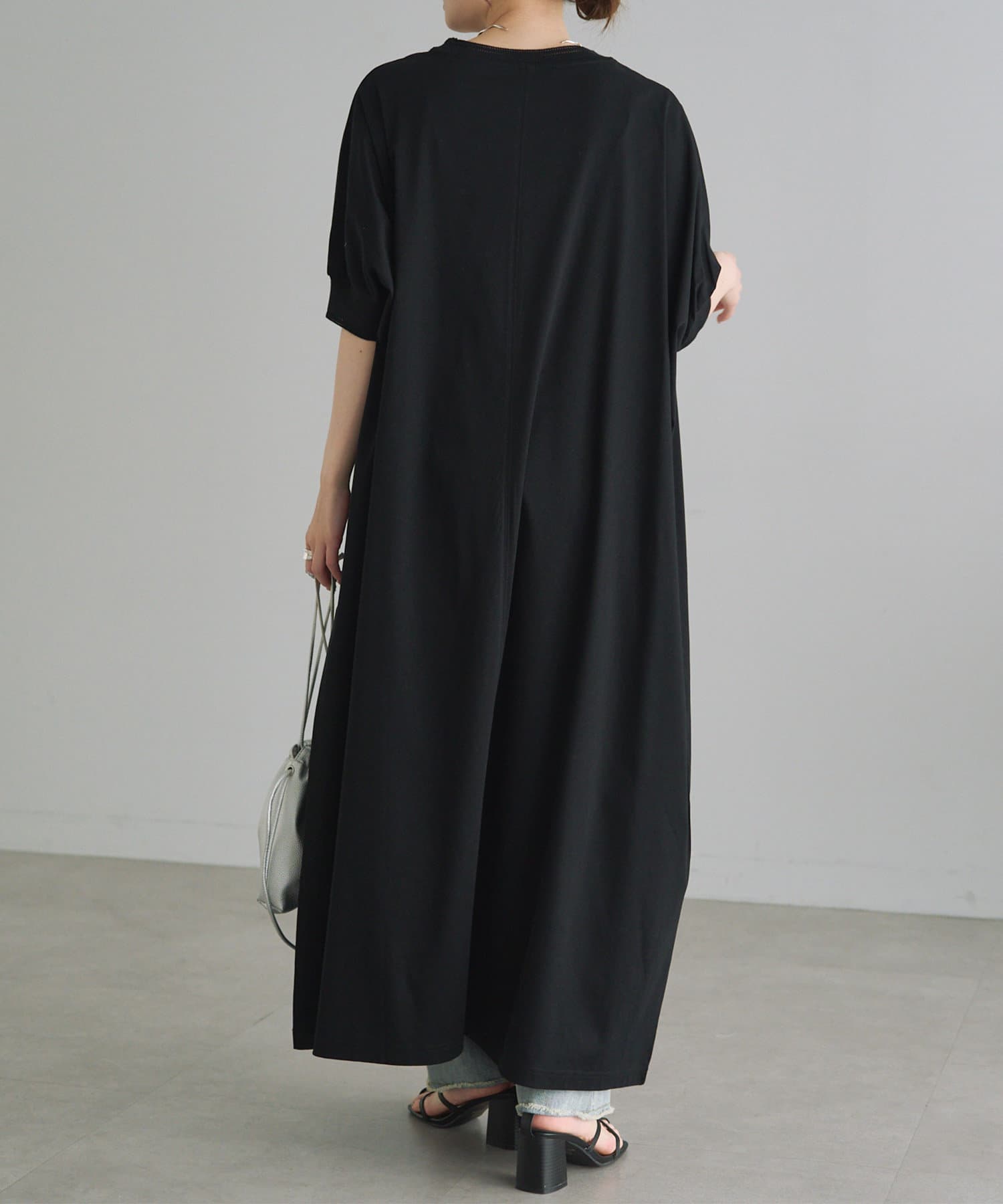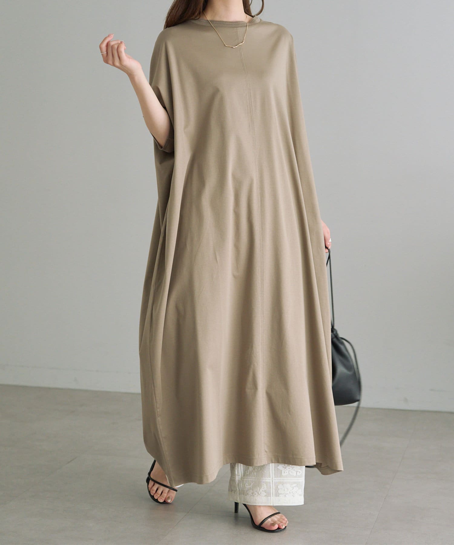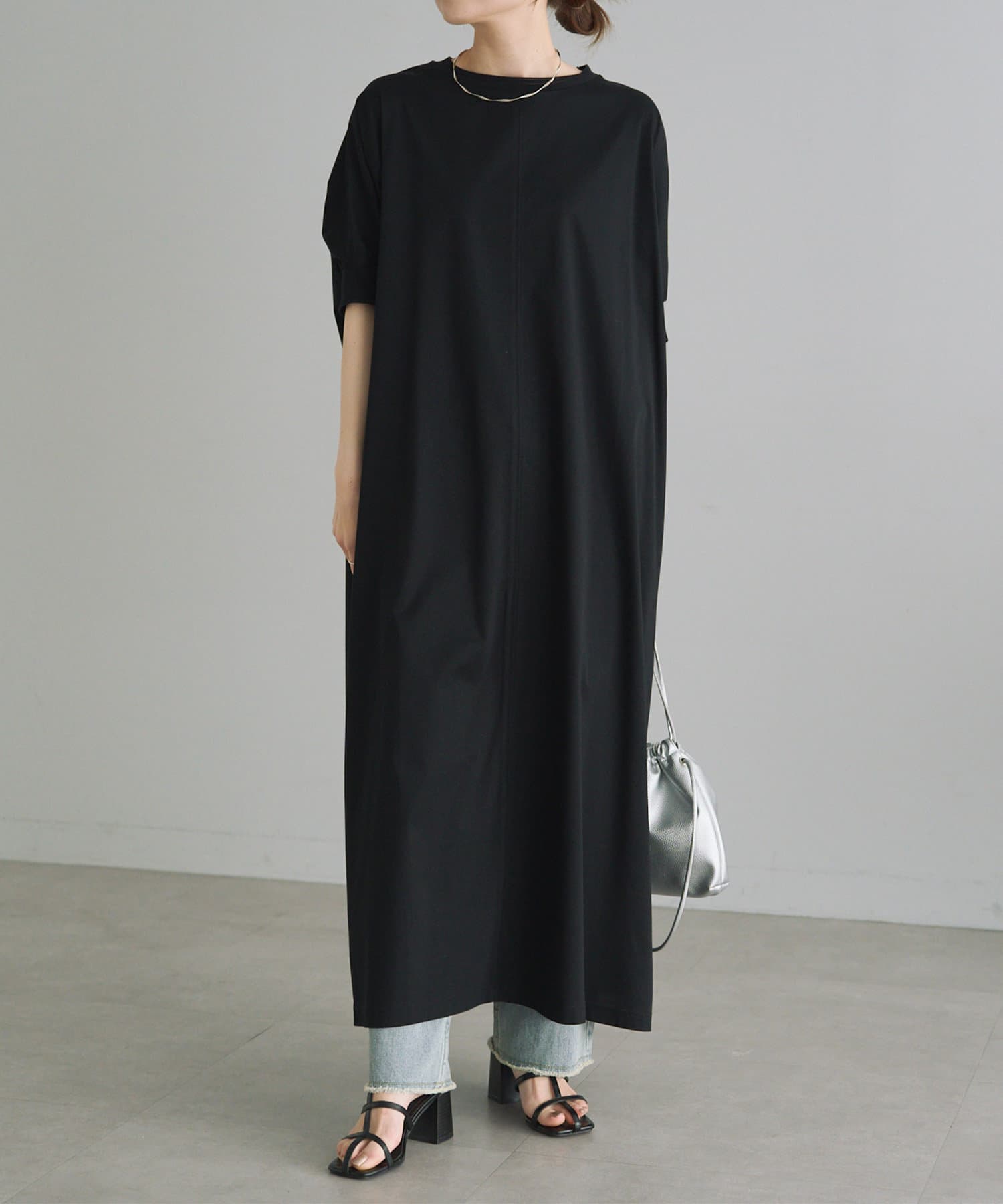 ゆとりを持たせたワイドシルエットでボディラインを拾わないのもうれしいポイント。