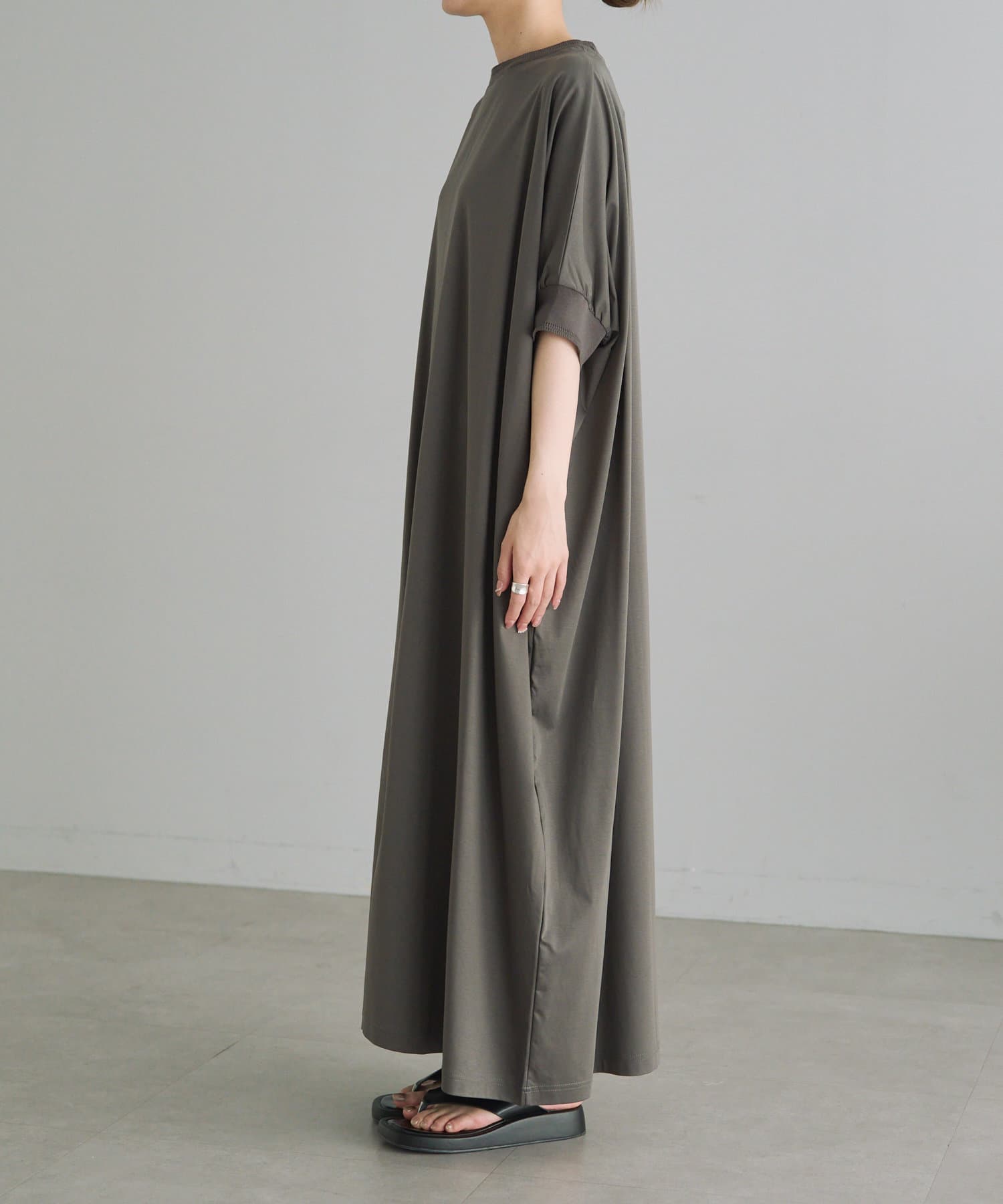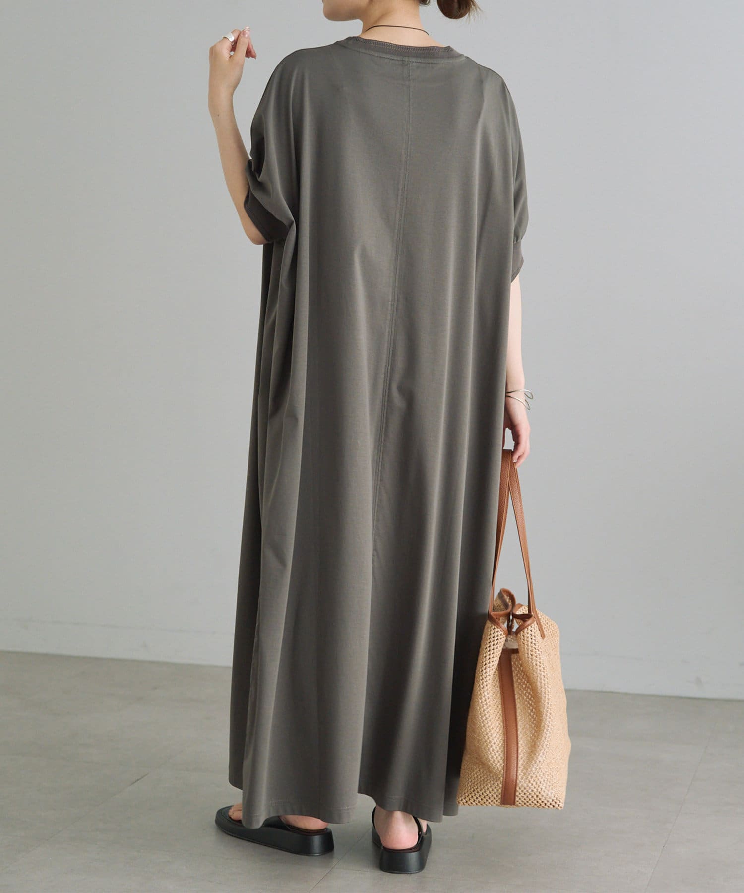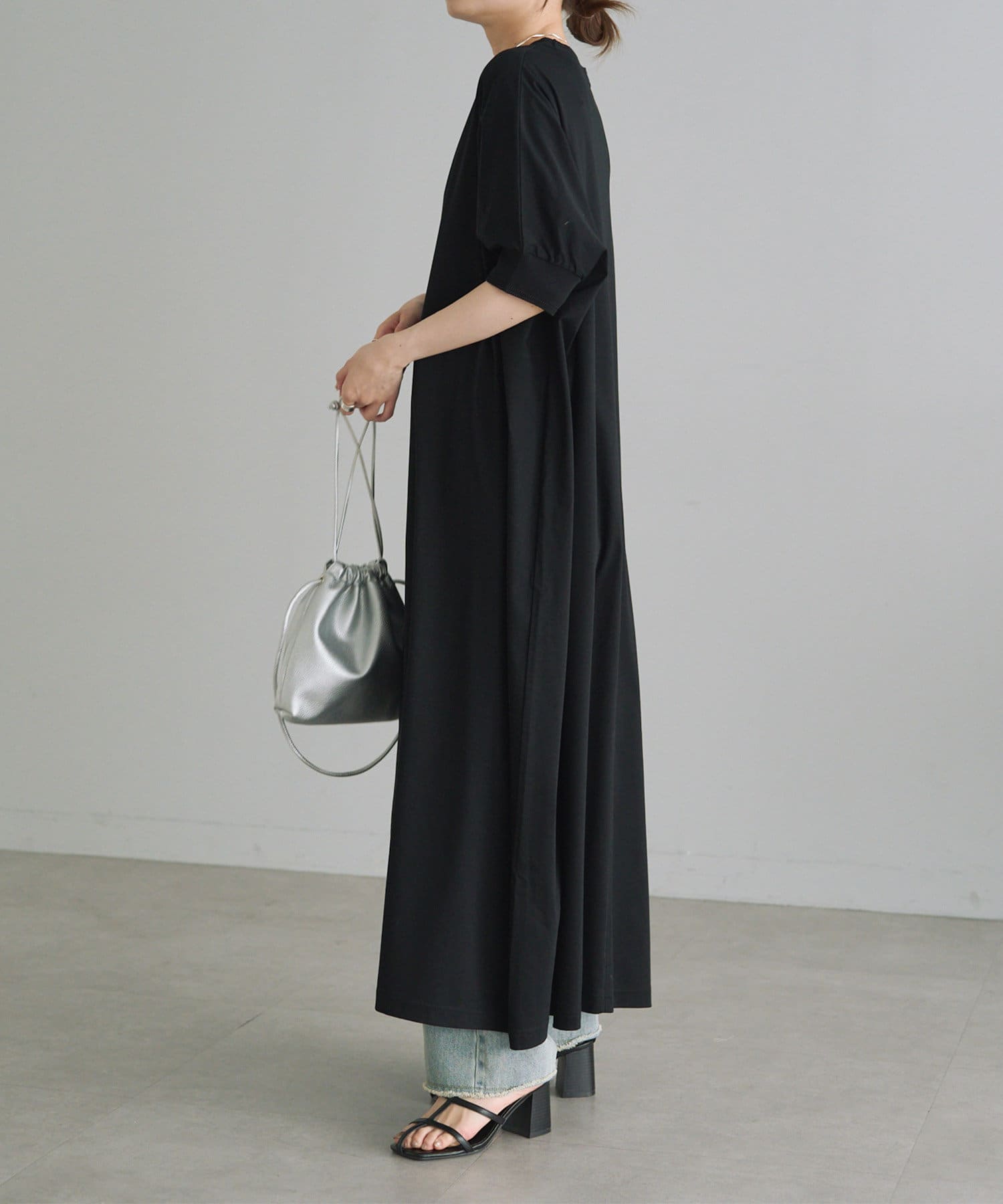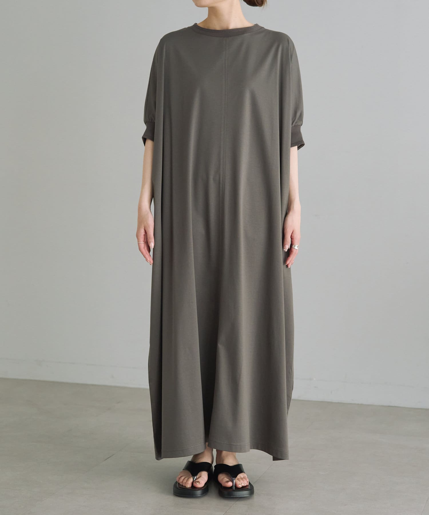 ゆとりを持たせたワイドシルエットでボディラインを拾わないのもうれしいポイント。
