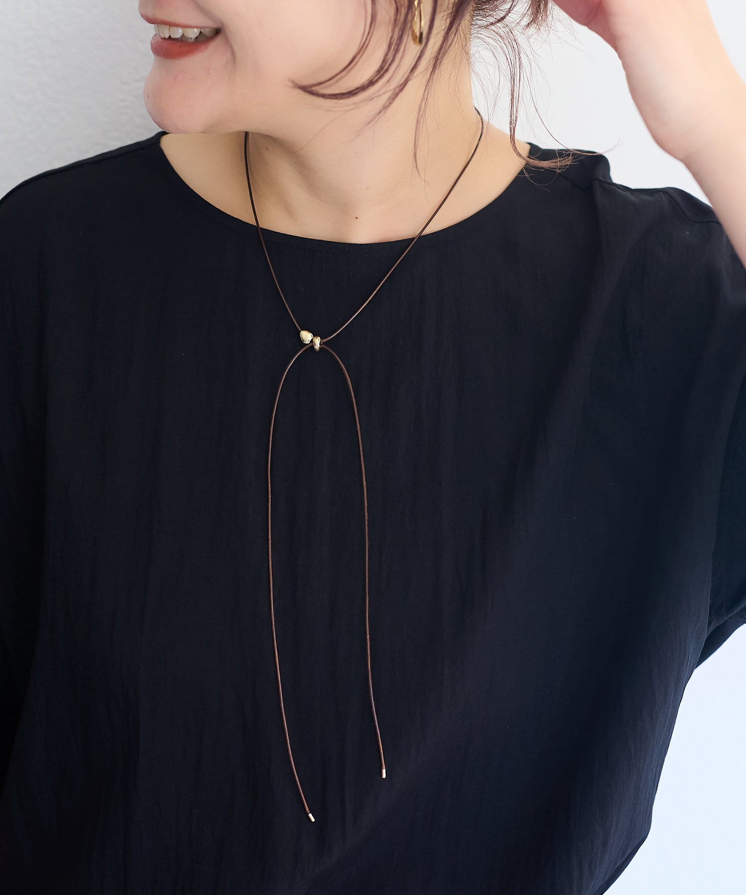 前に垂らしてラリエットネックレス風なつけ方から、コードを後ろに流す使い方も◎