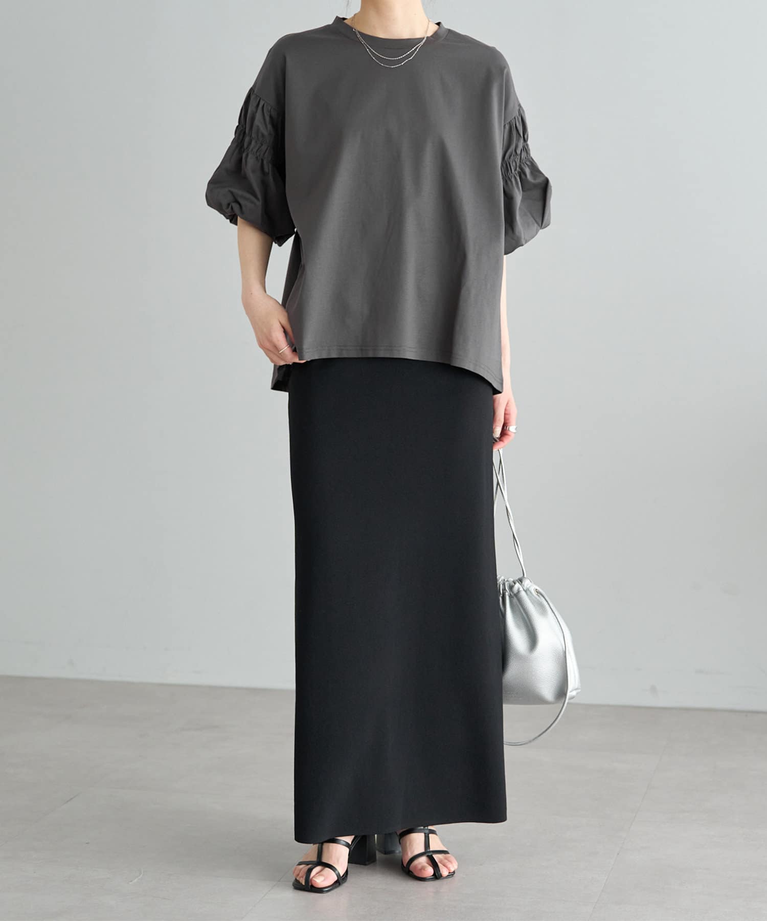 フレアスカートやワンピースなどフェミニンなアイテムとも好相性です。