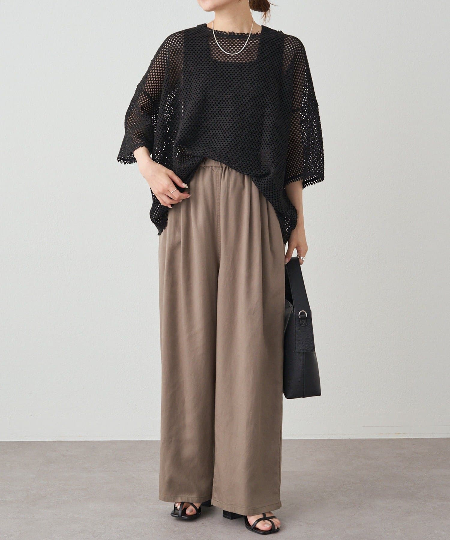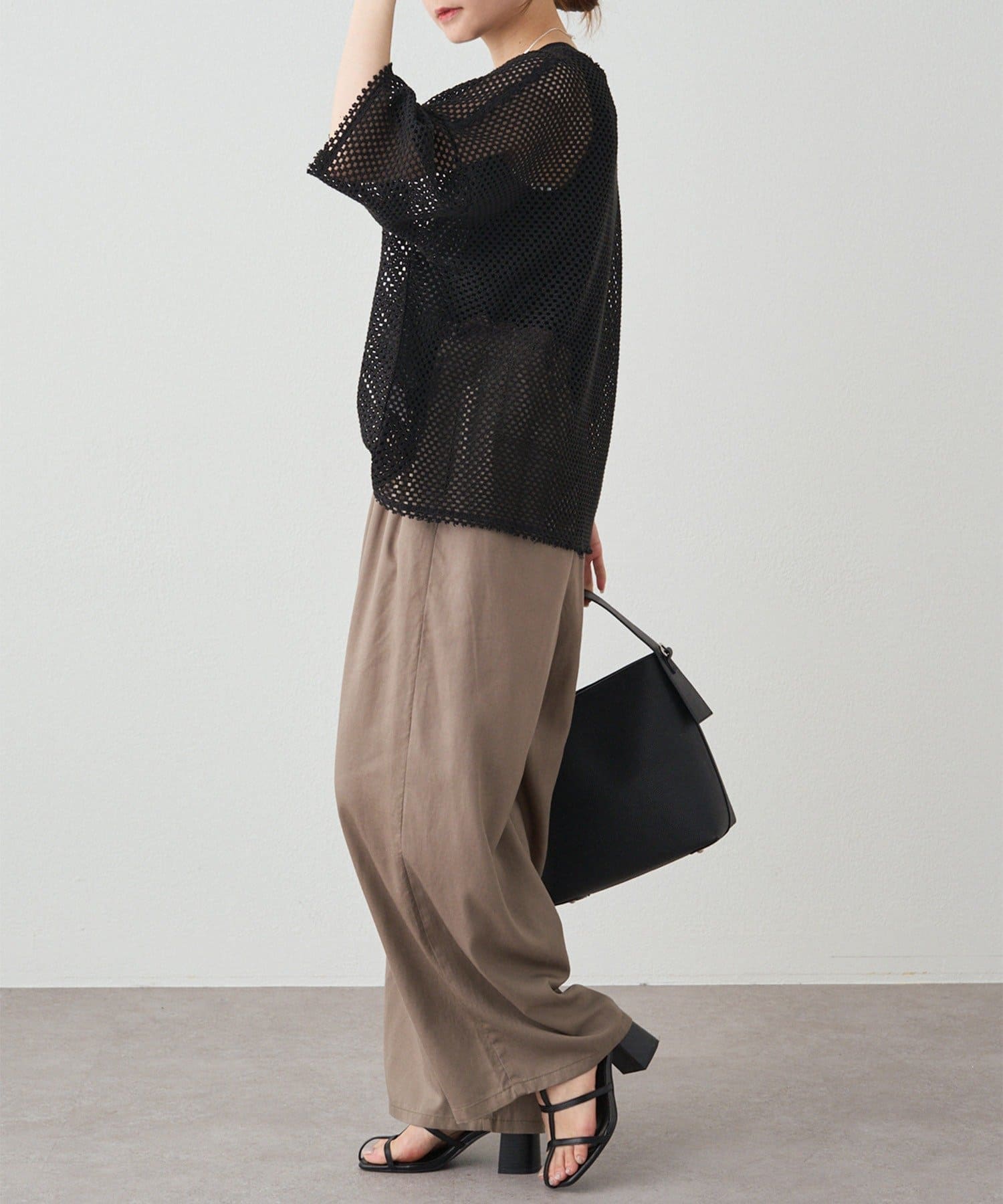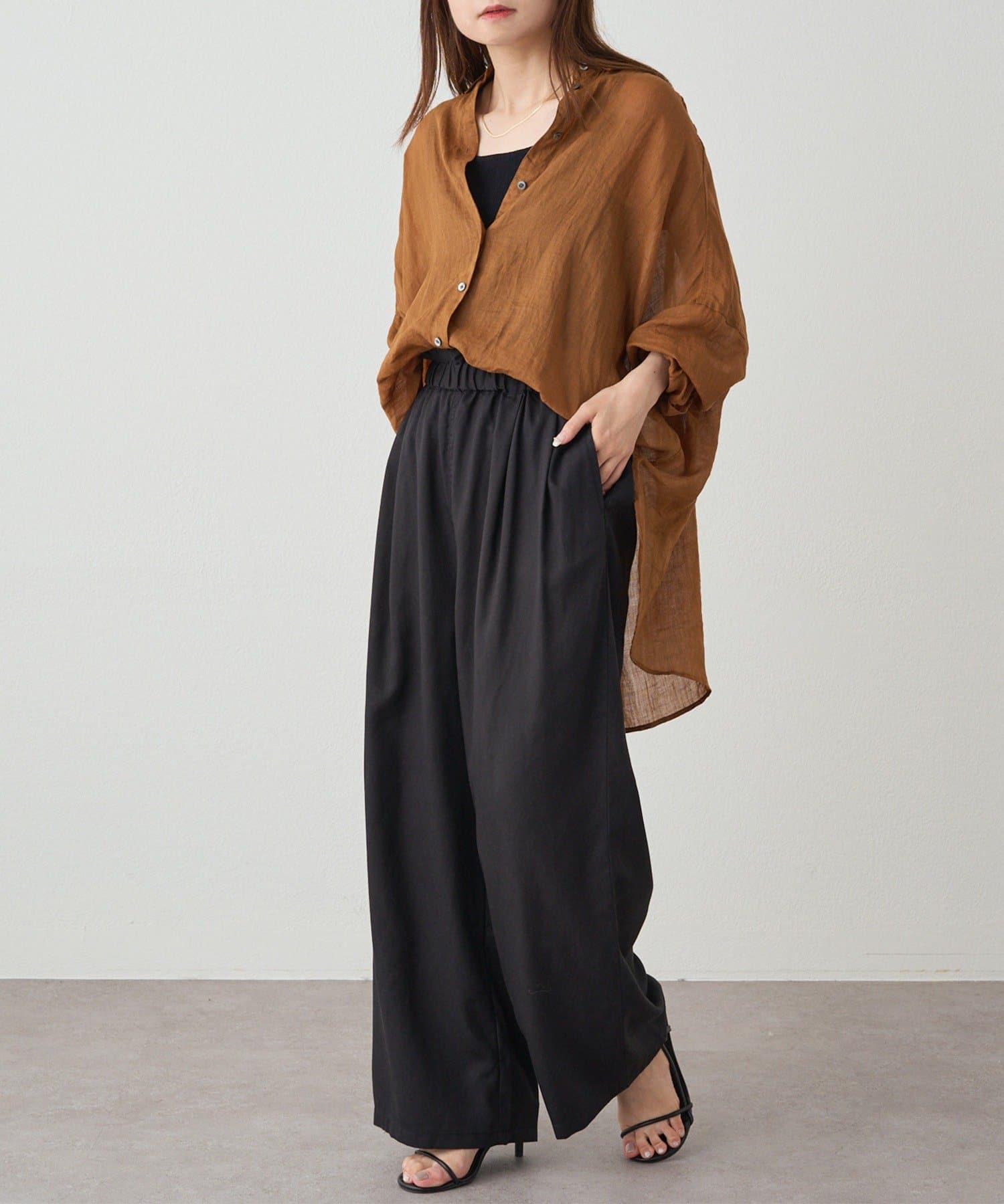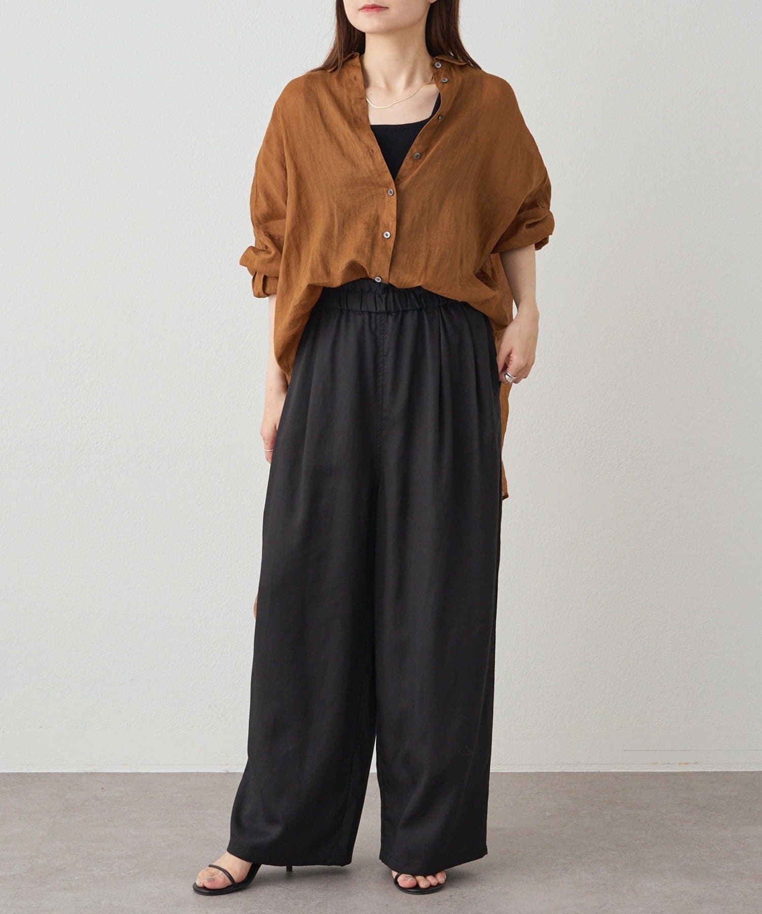 リネンテンセルの素材が女性らしいワイドパンツ。