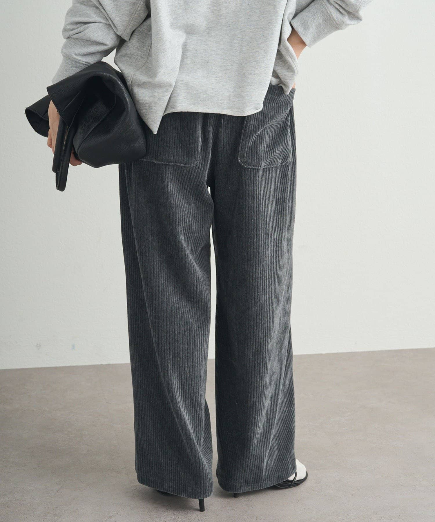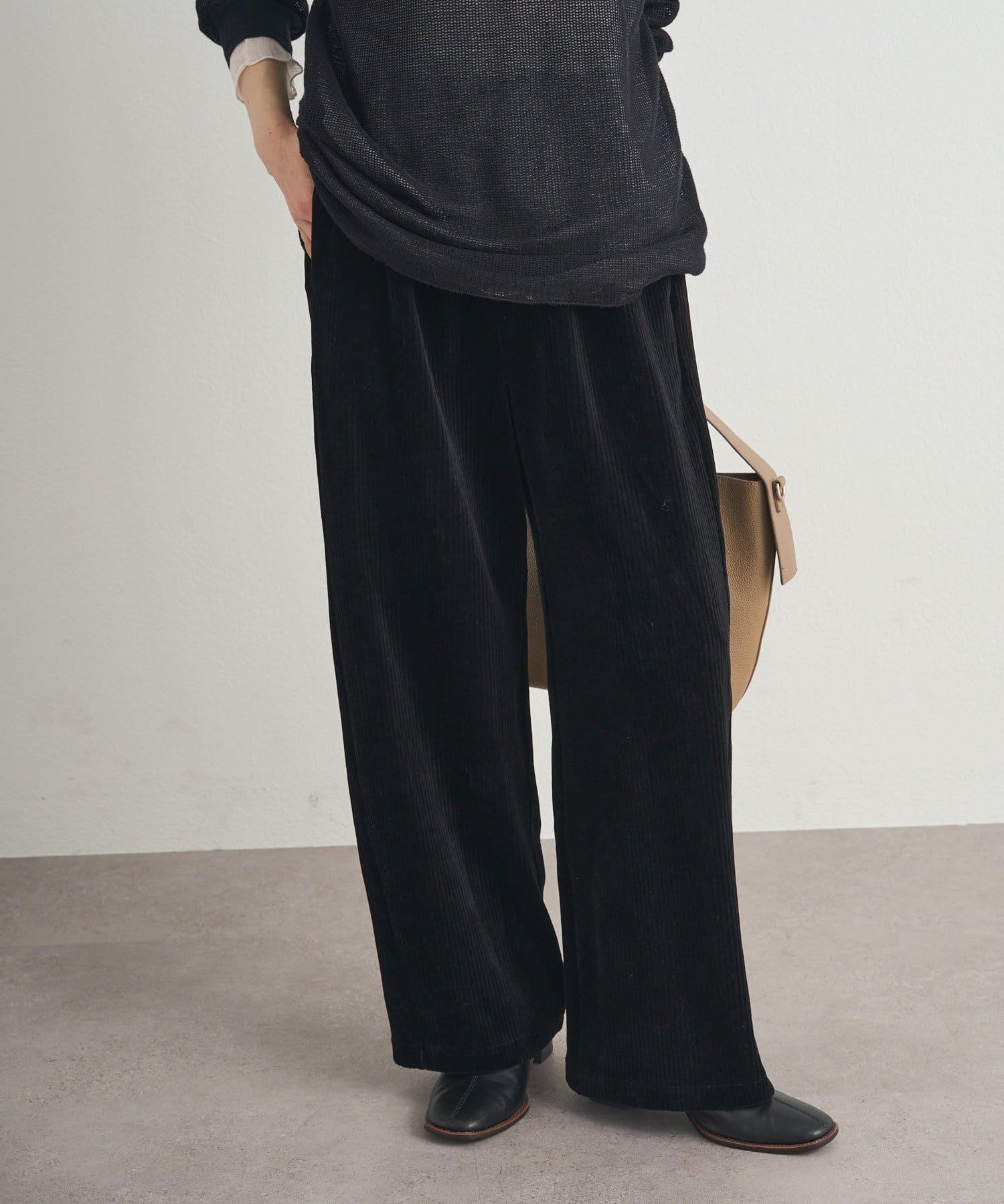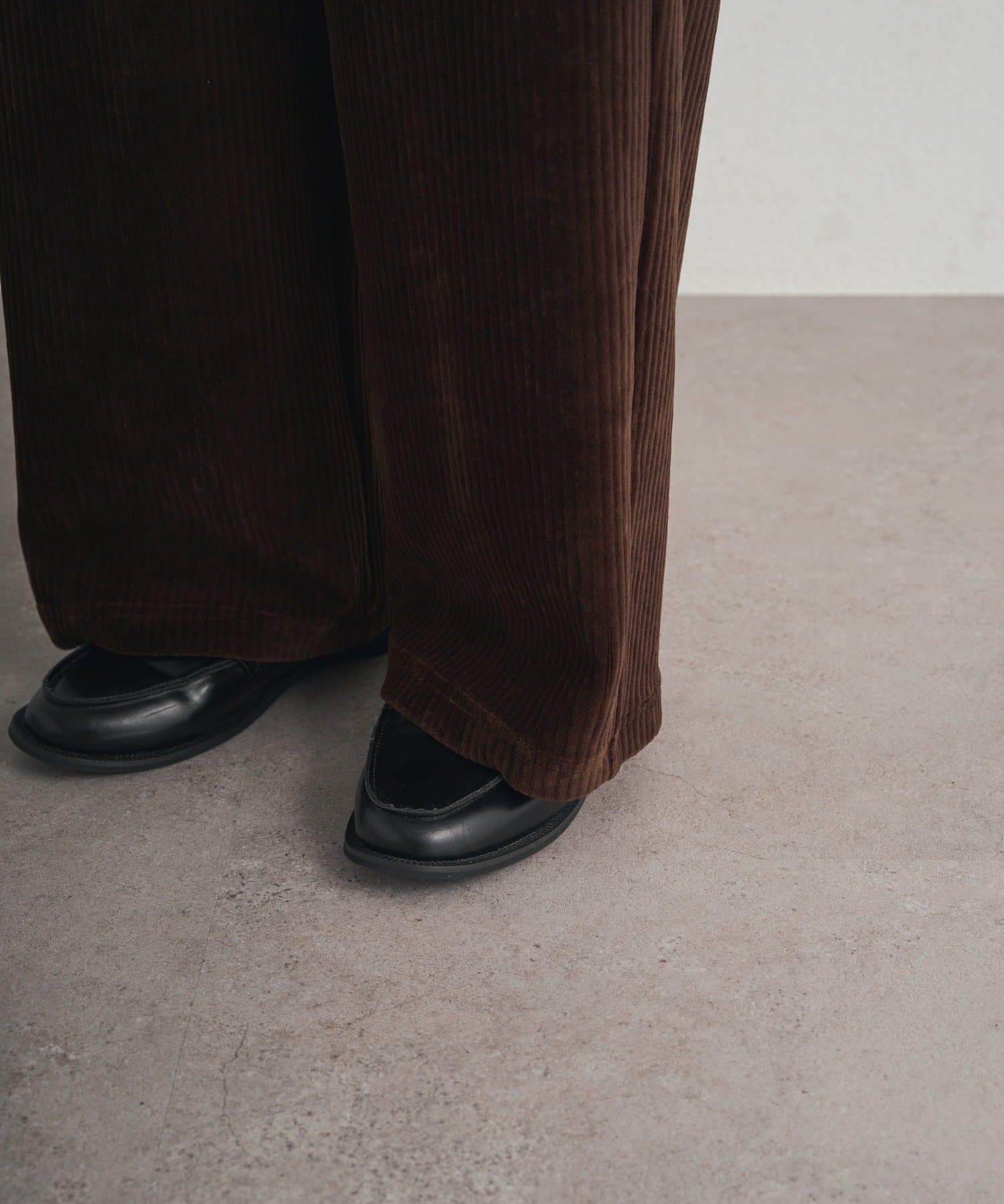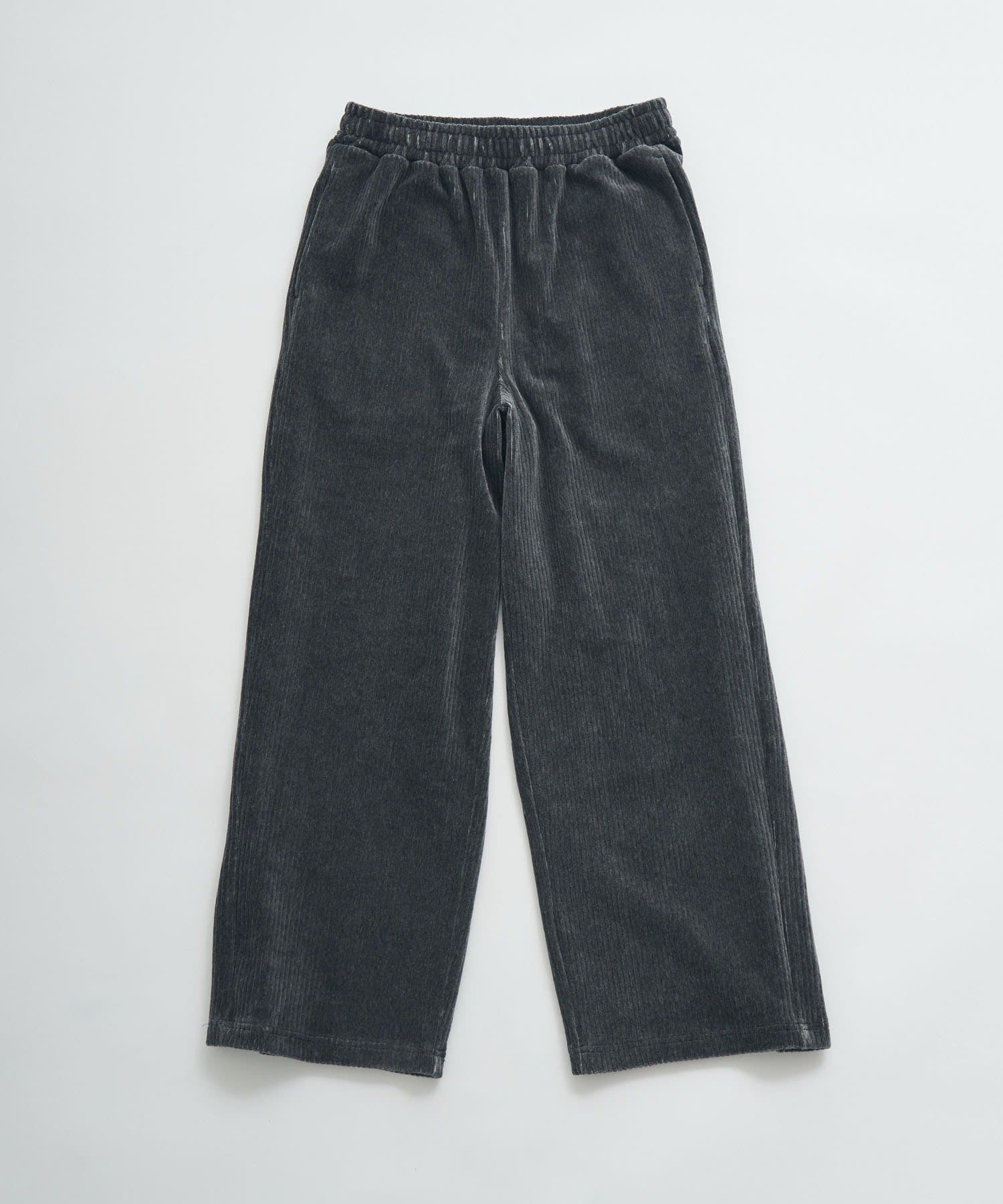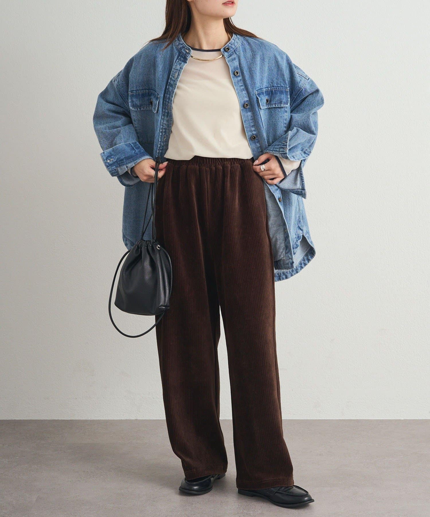 直線的なパンツシルエットとコーデュロイの畝により縦見え効果が生まれ、
