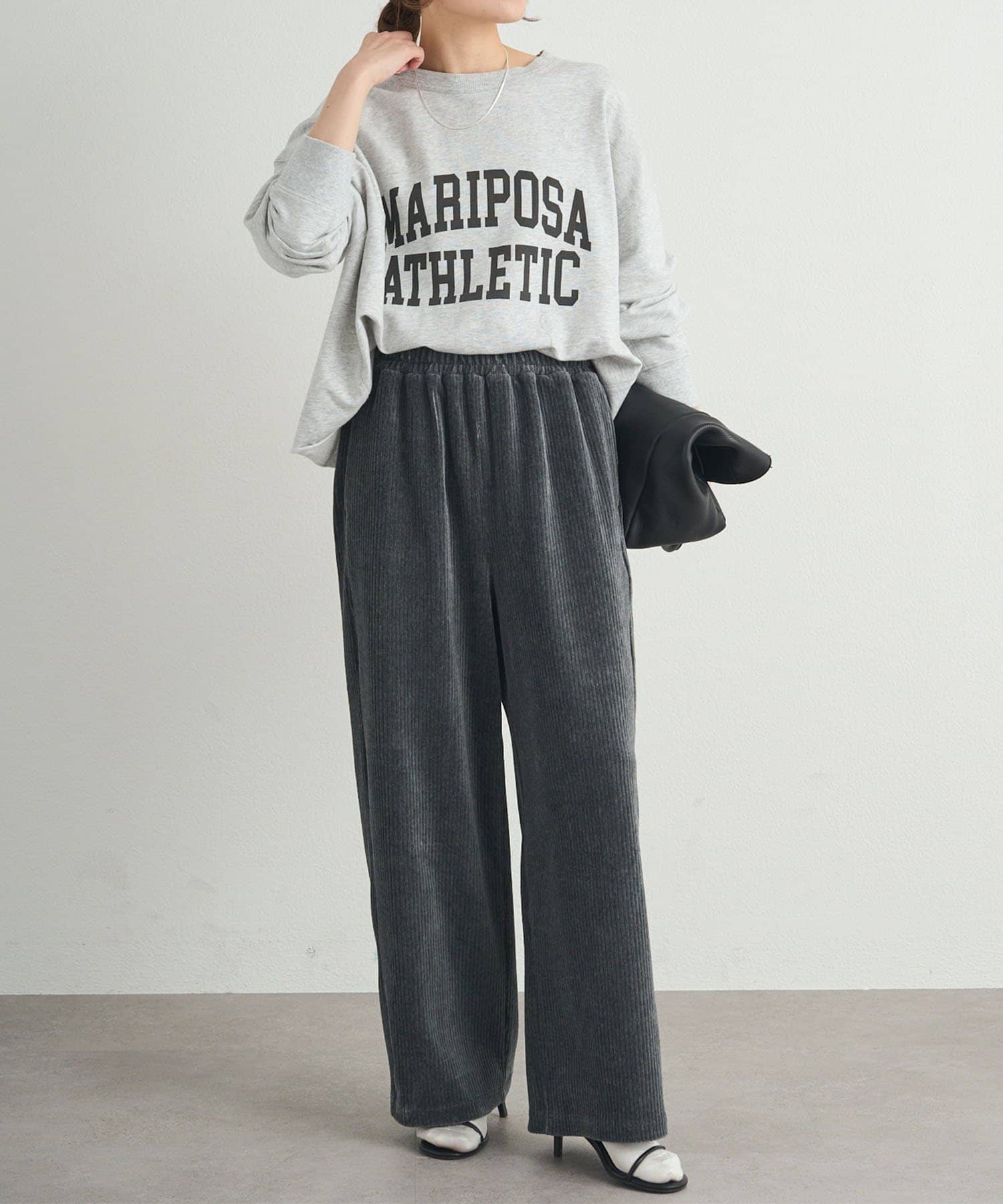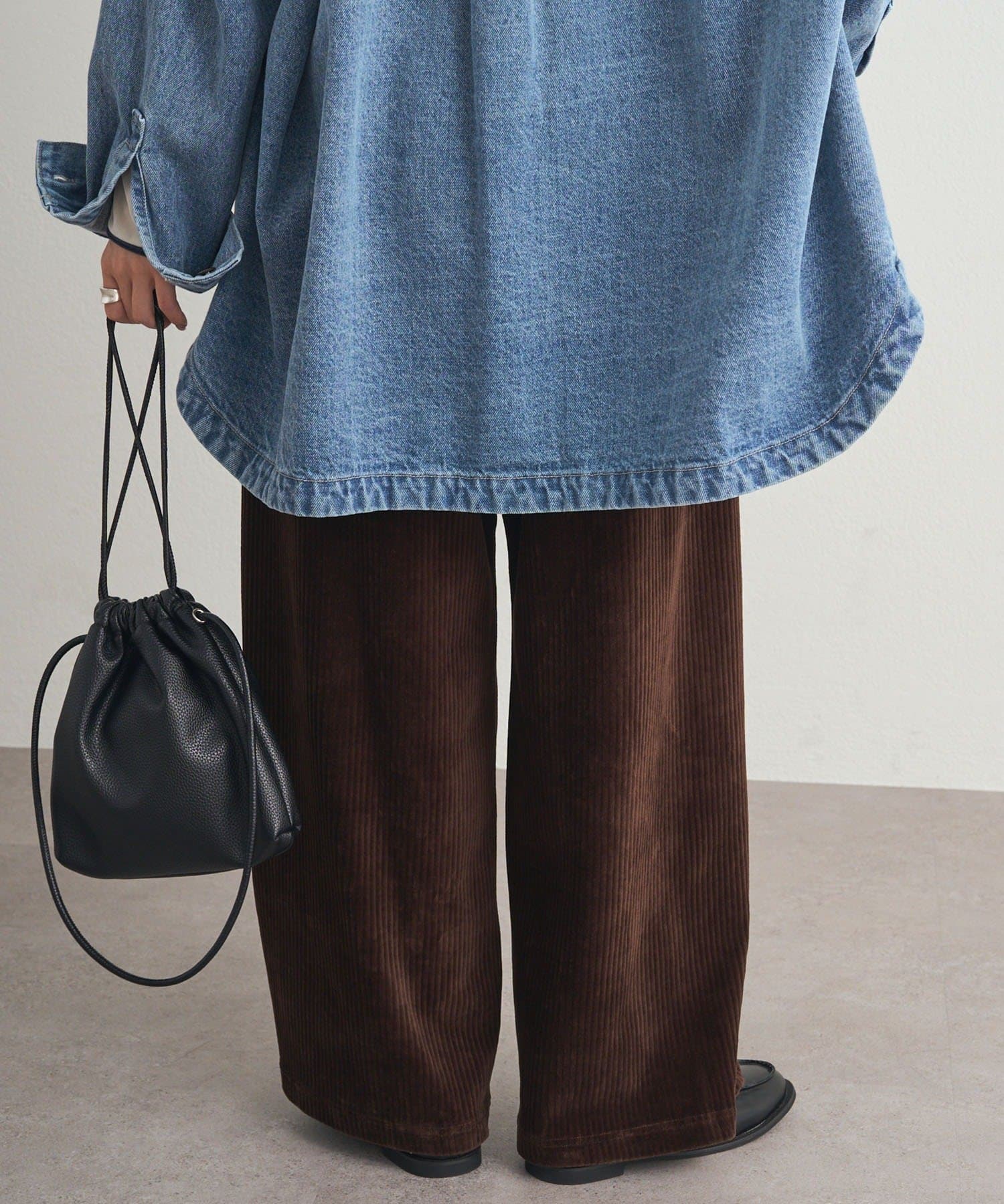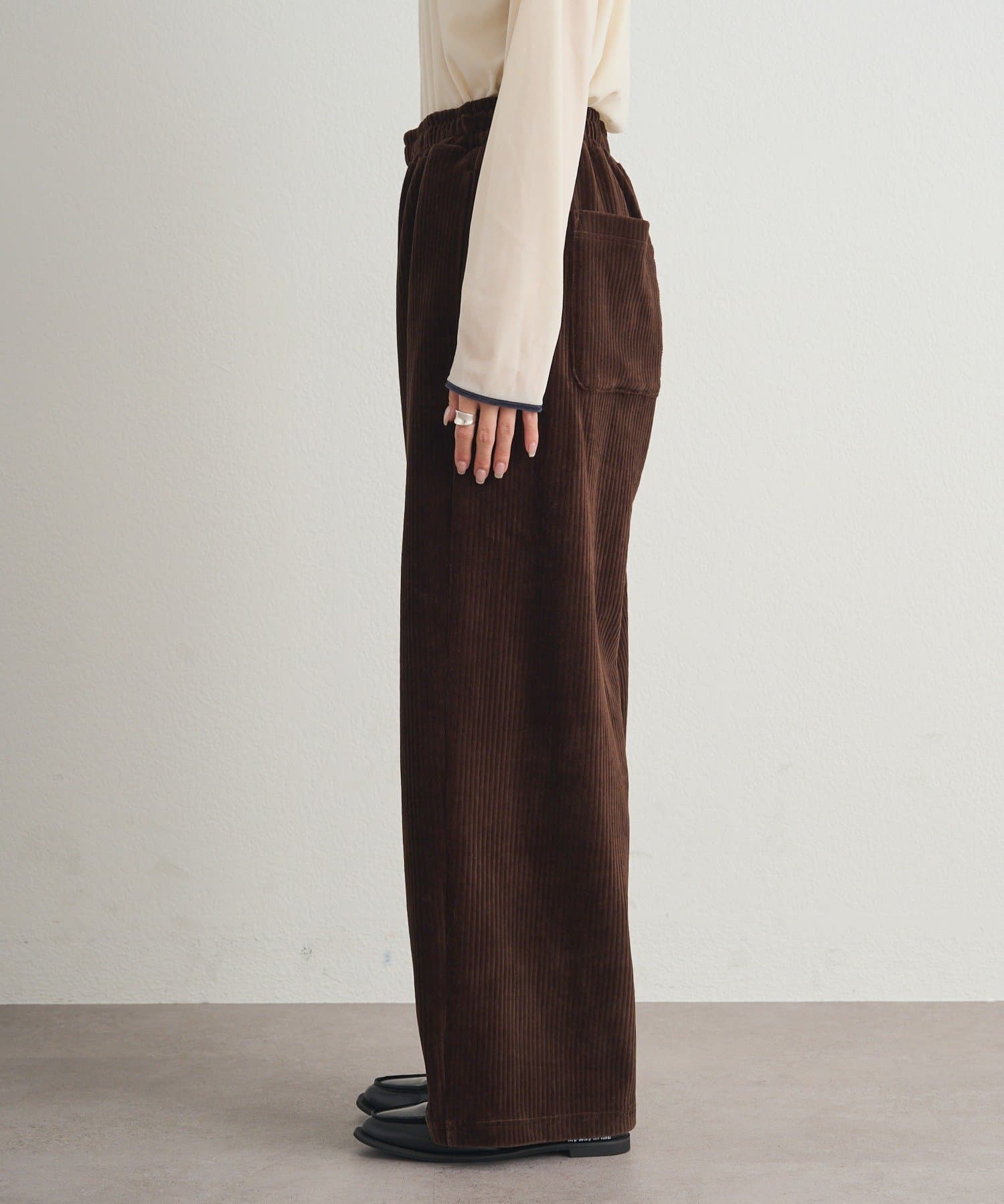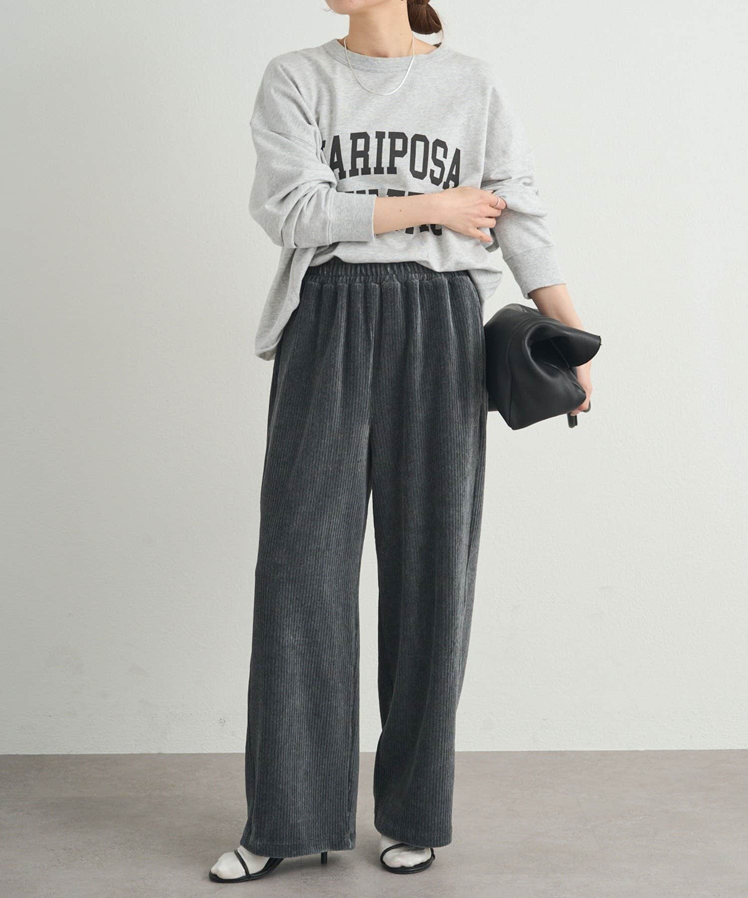 直線的なパンツシルエットとコーデュロイの畝により縦見え効果が生まれ、