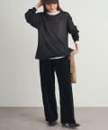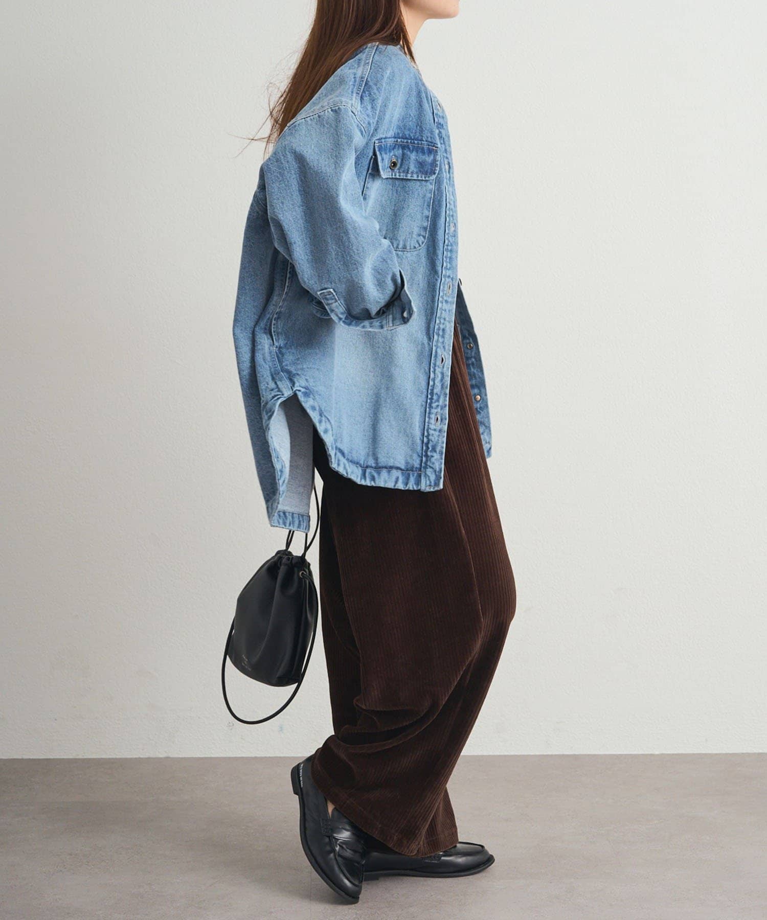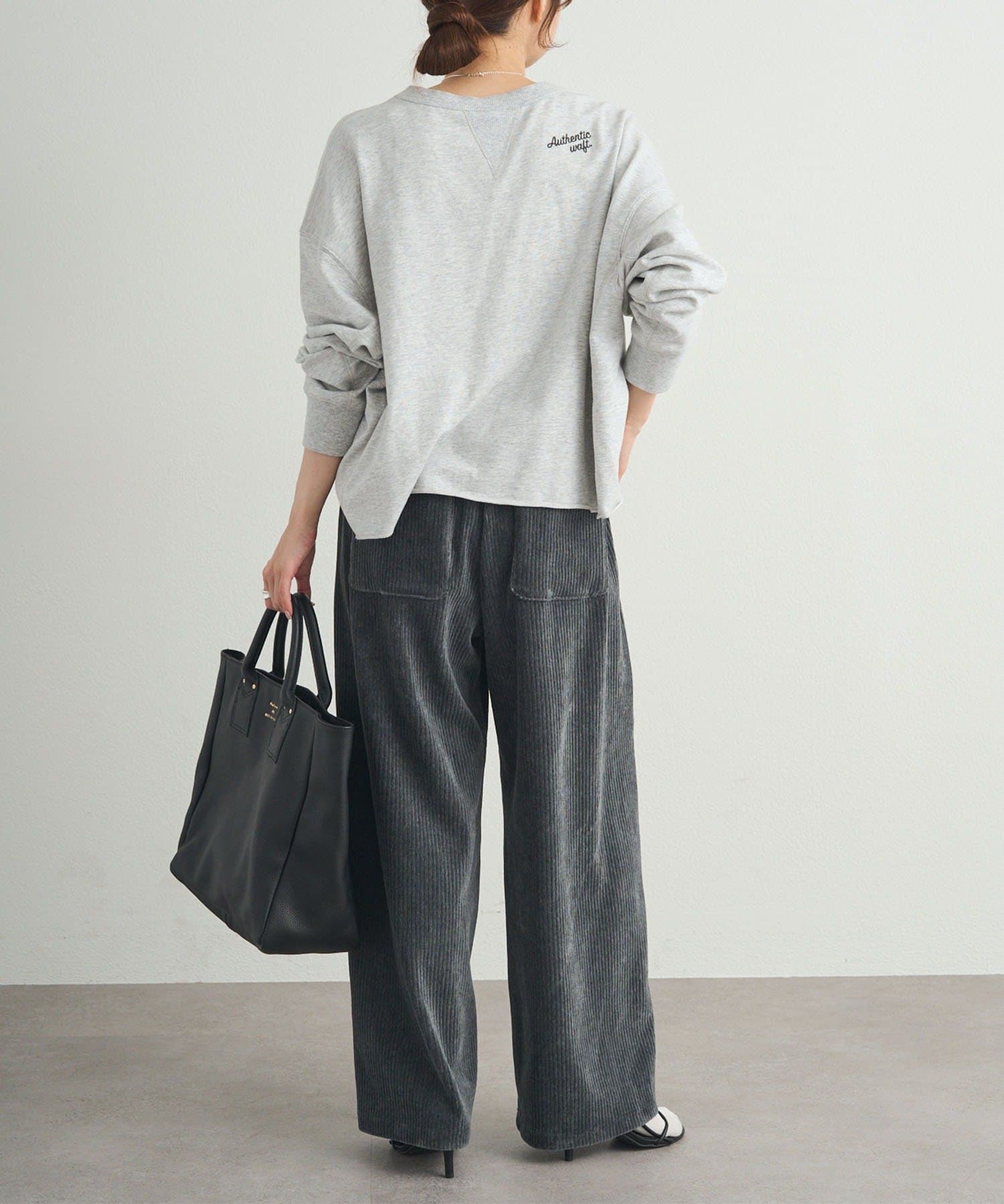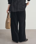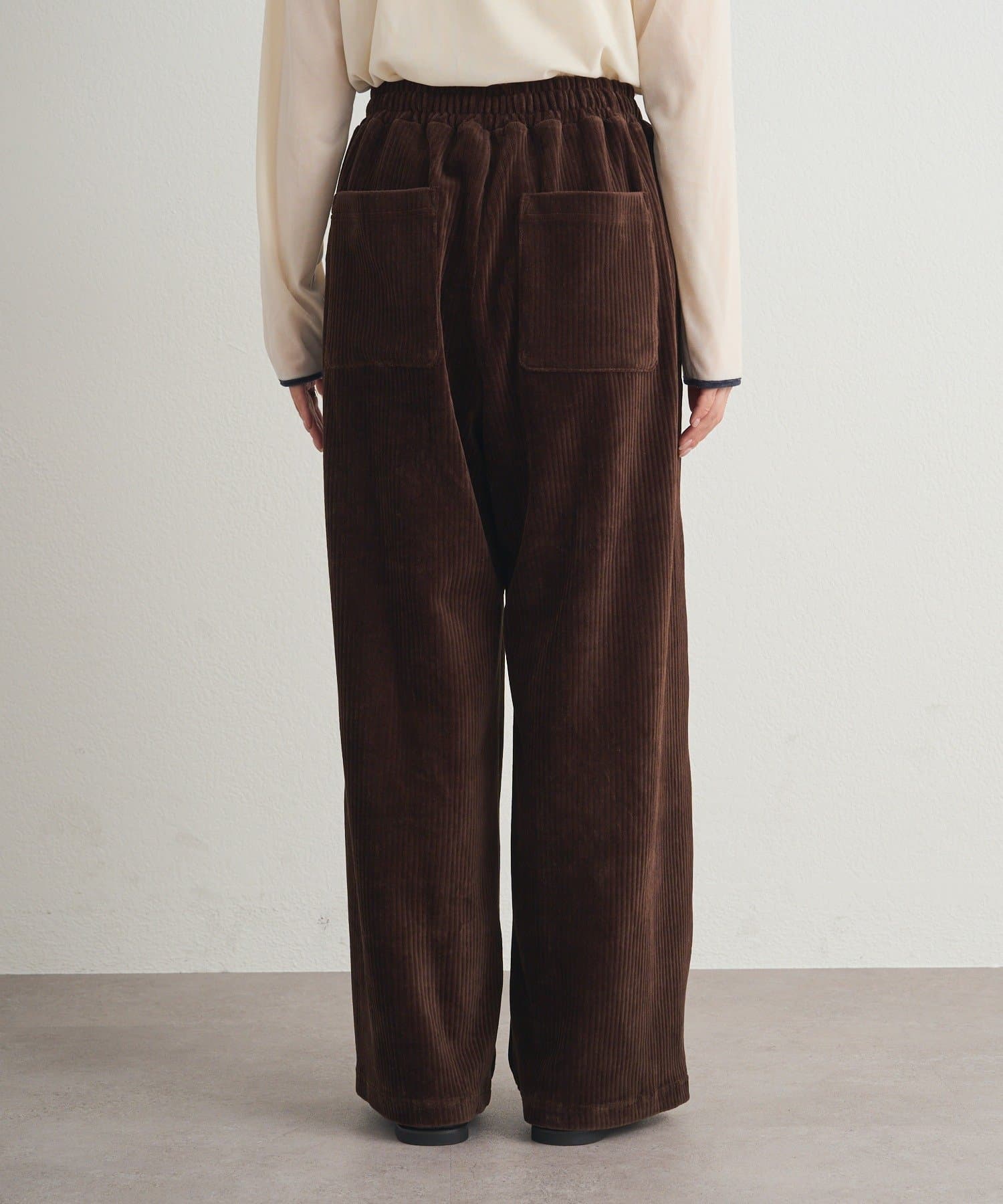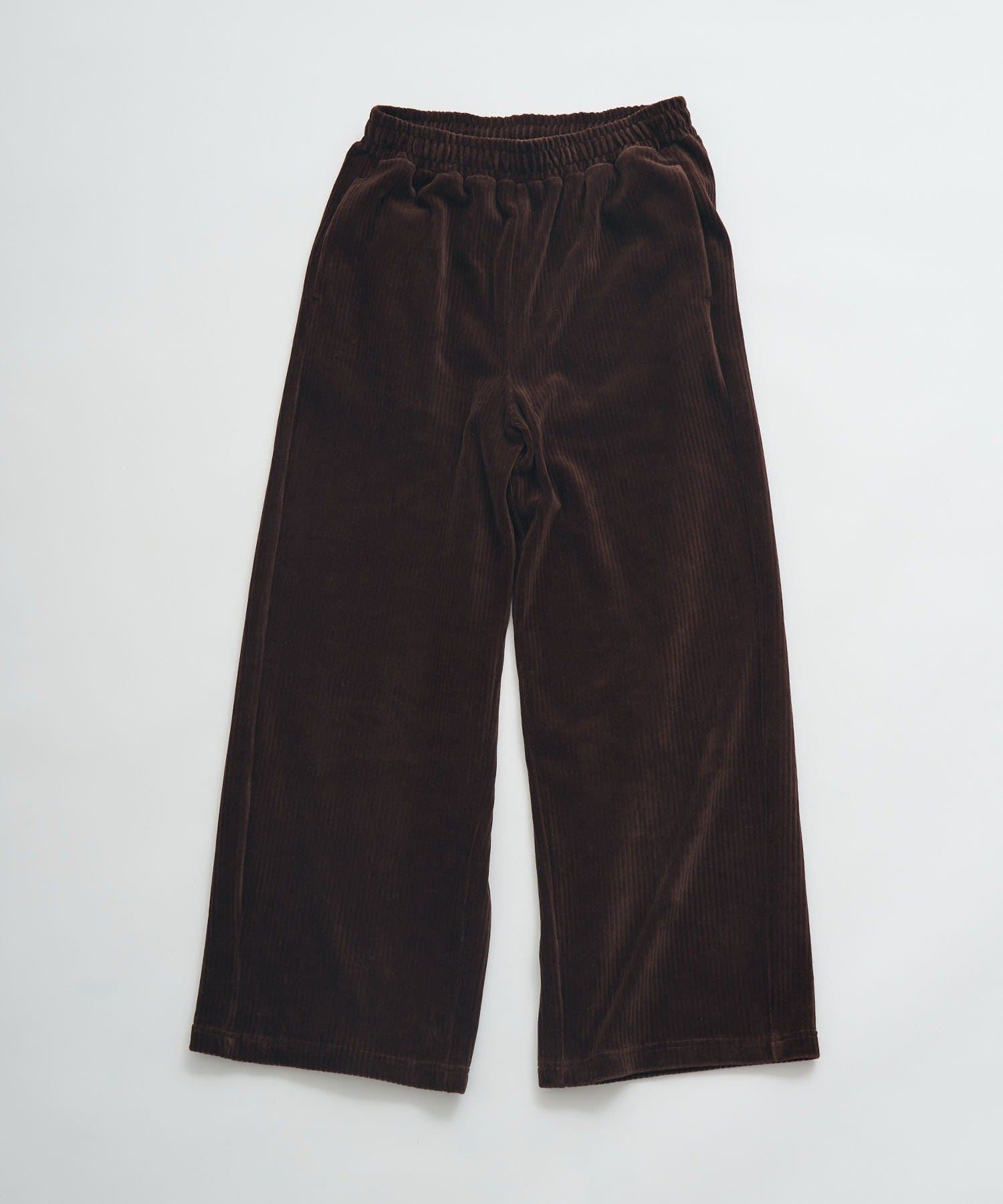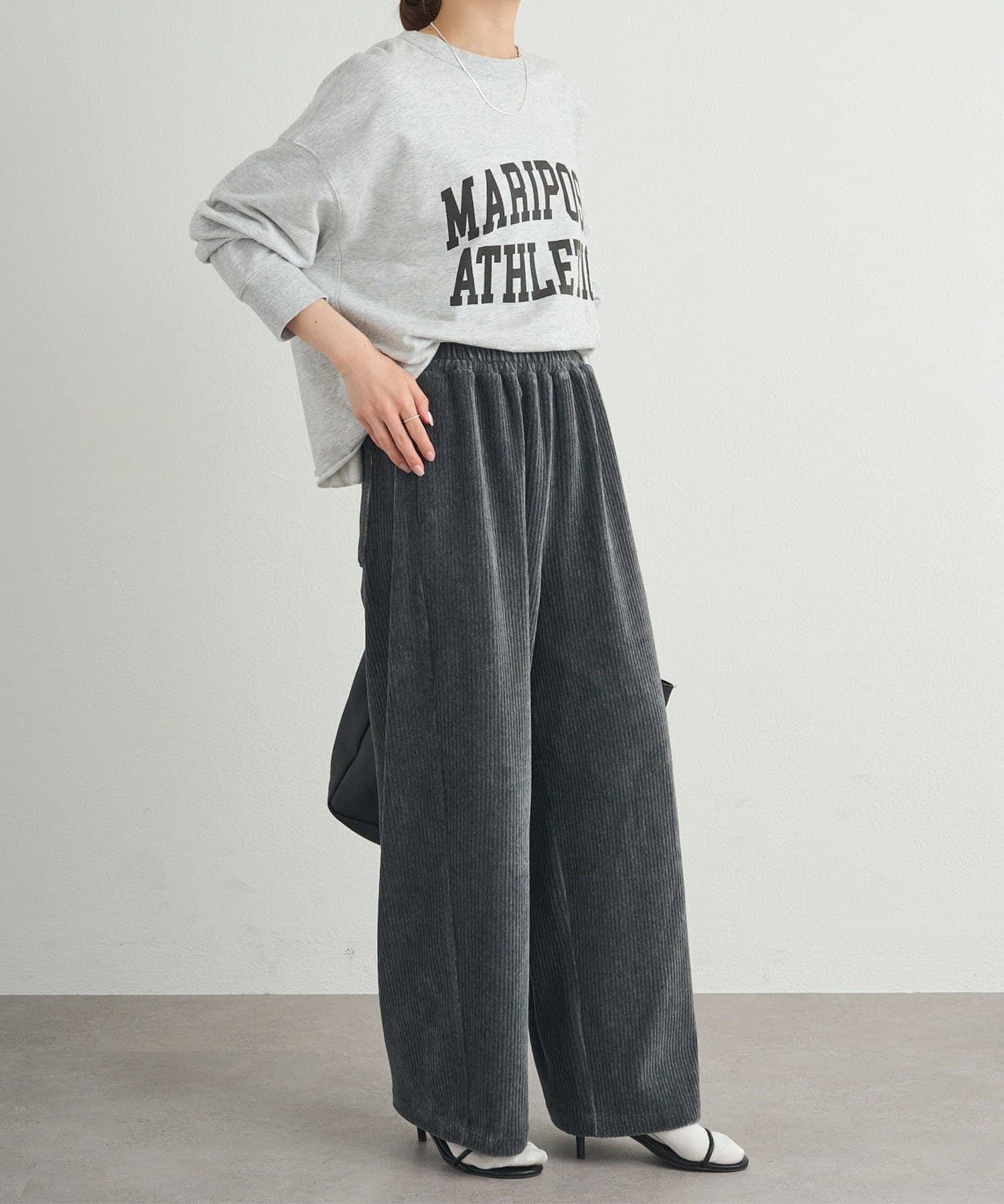 直線的なパンツシルエットとコーデュロイの畝により縦見え効果が生まれ、