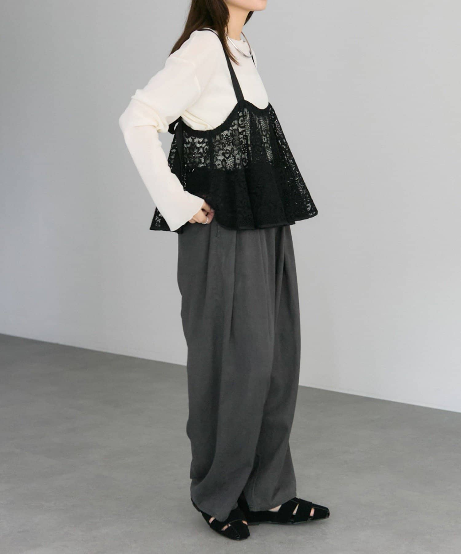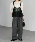 カーゴパンツやカーブシルエットのボトムなどカジュアルでボリュームのあるアイテム合わせも女性らしい雰囲気に。