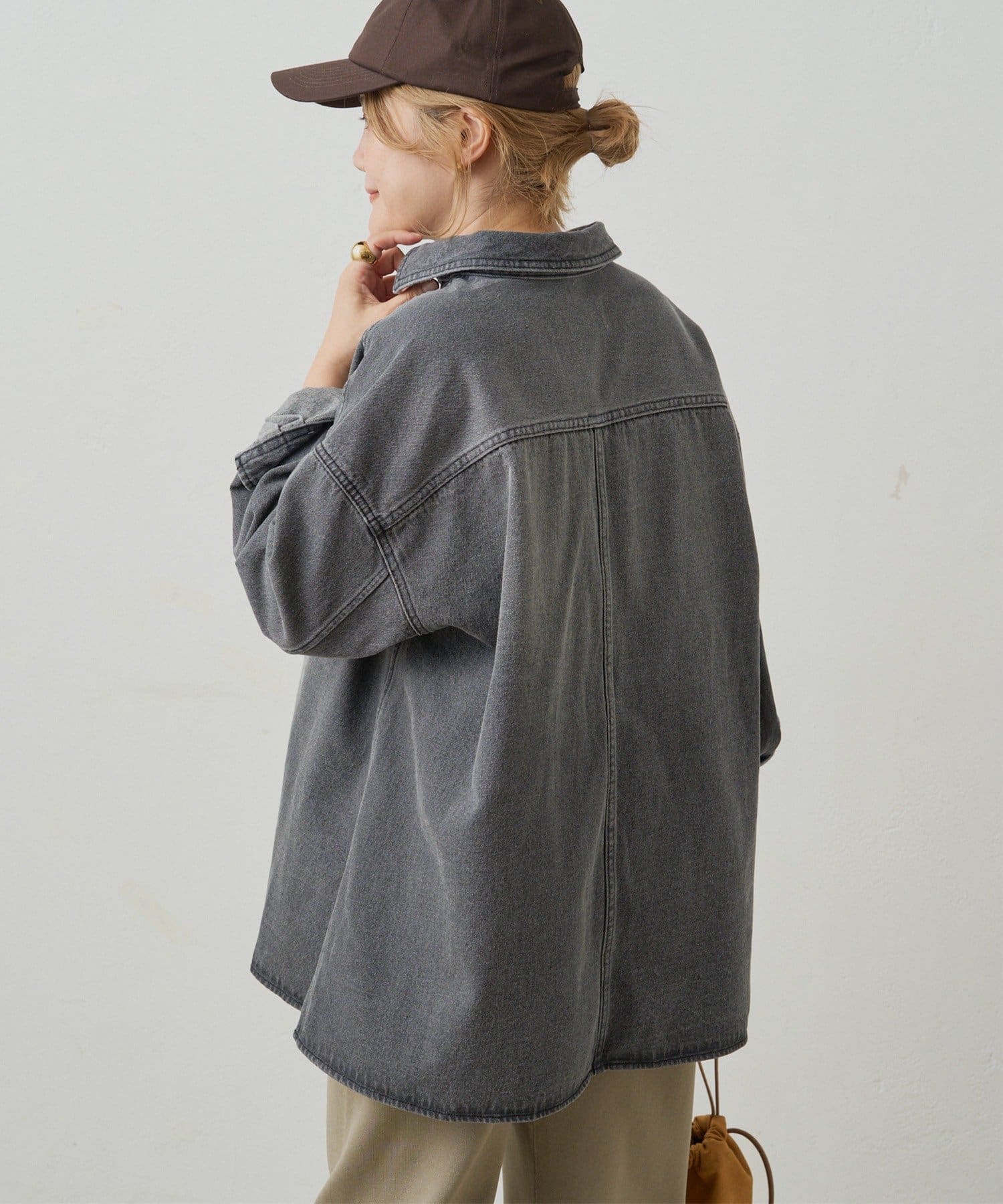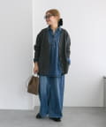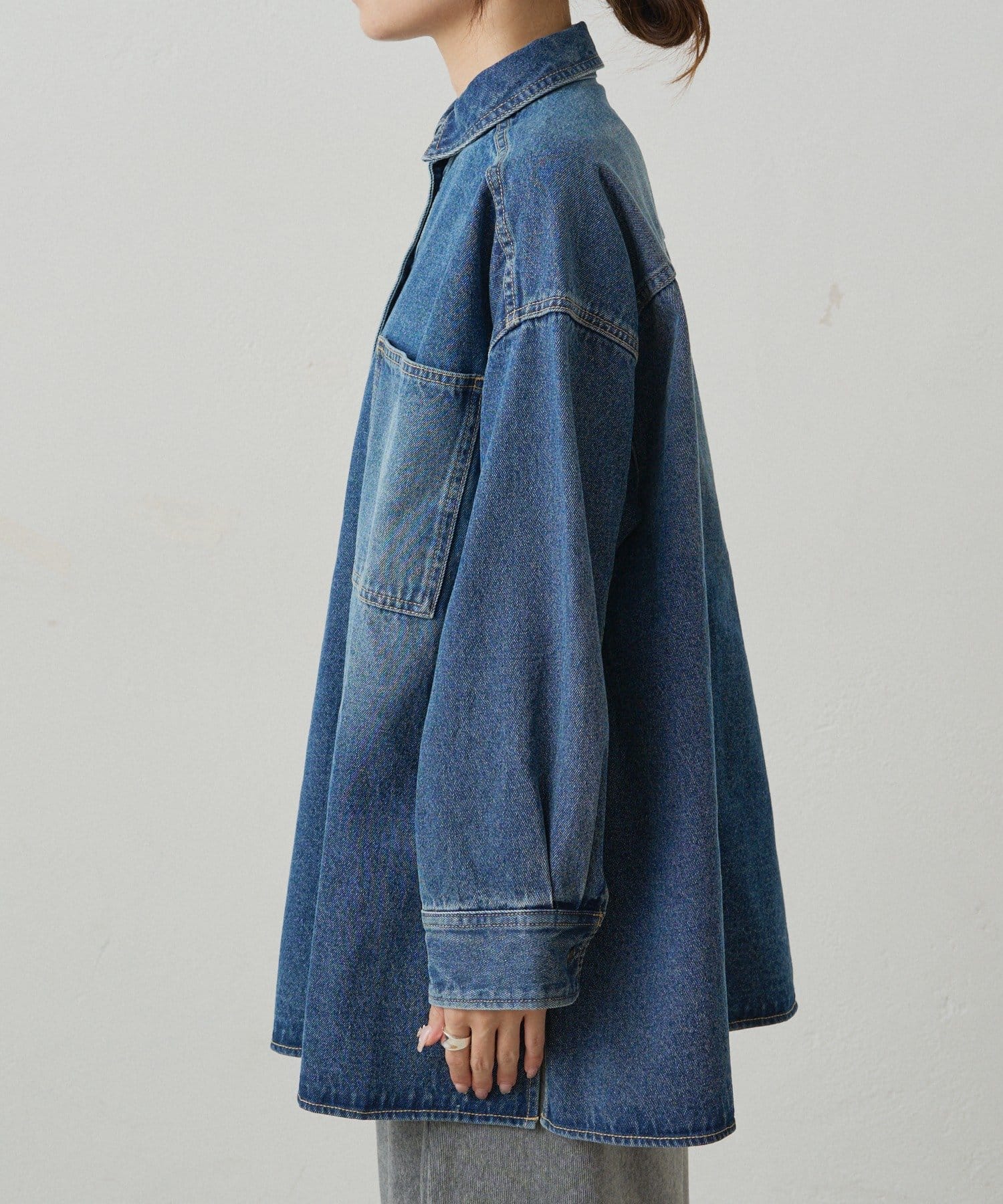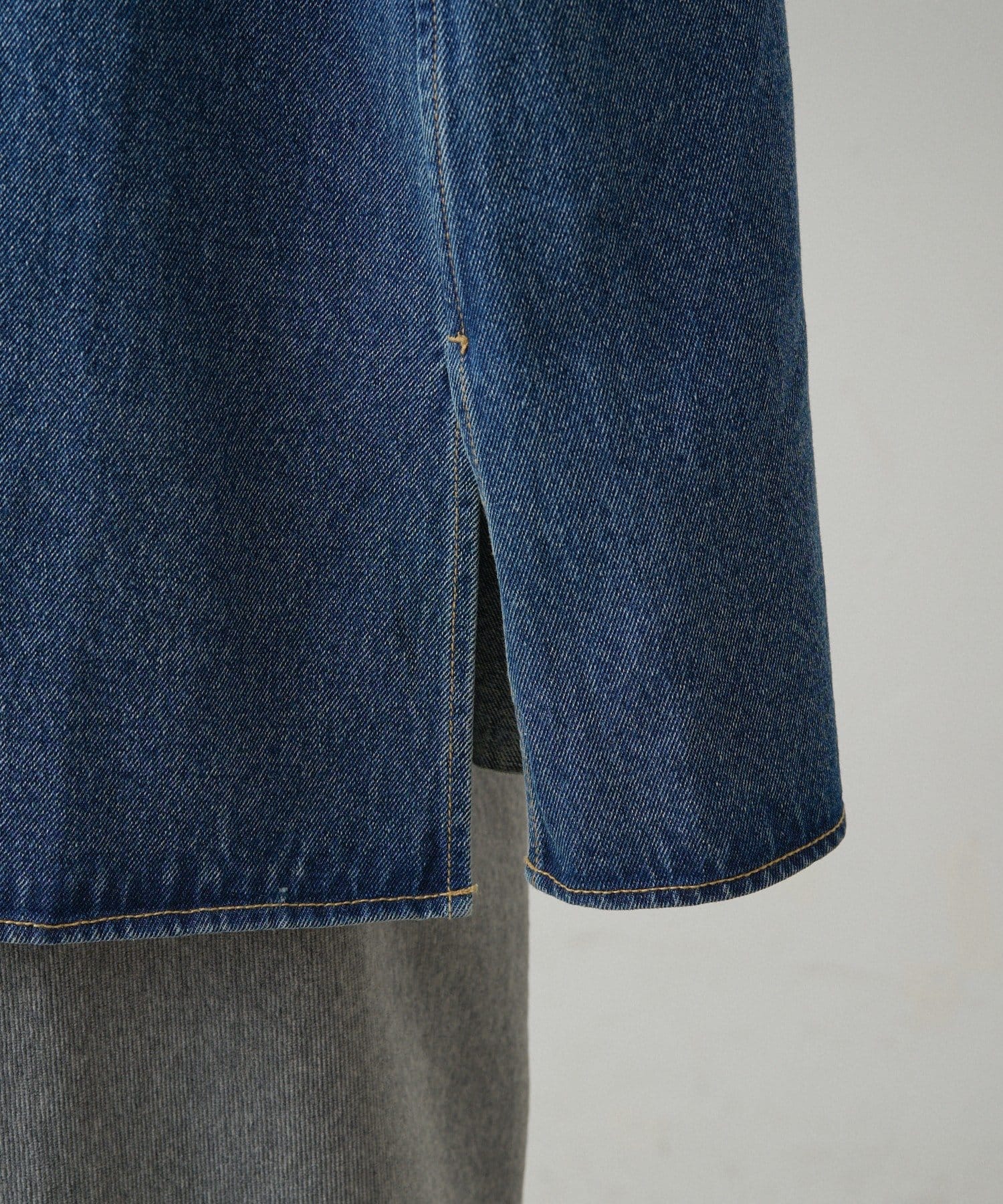 深めのスリッドを入れた裾は、重くなりがちなデニム素材のトップスに抜け感を生み、