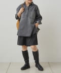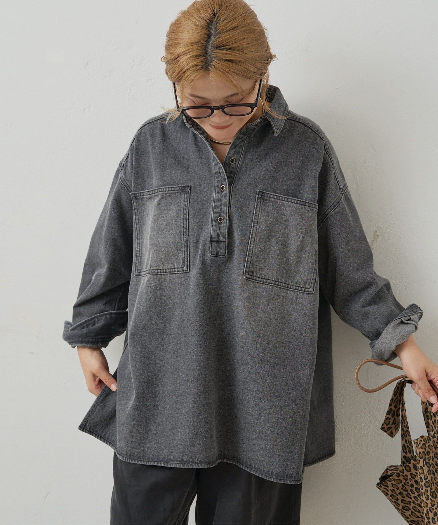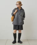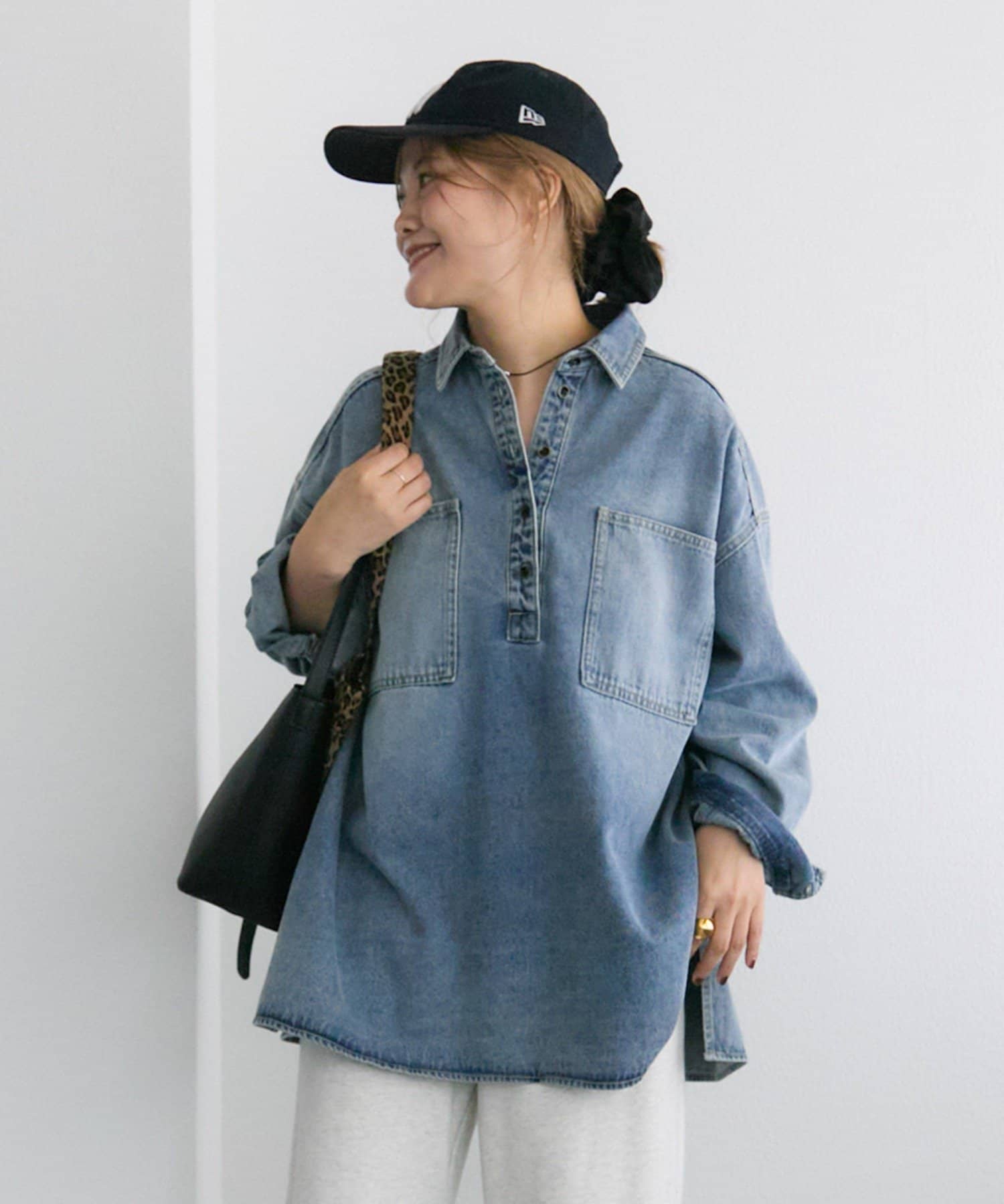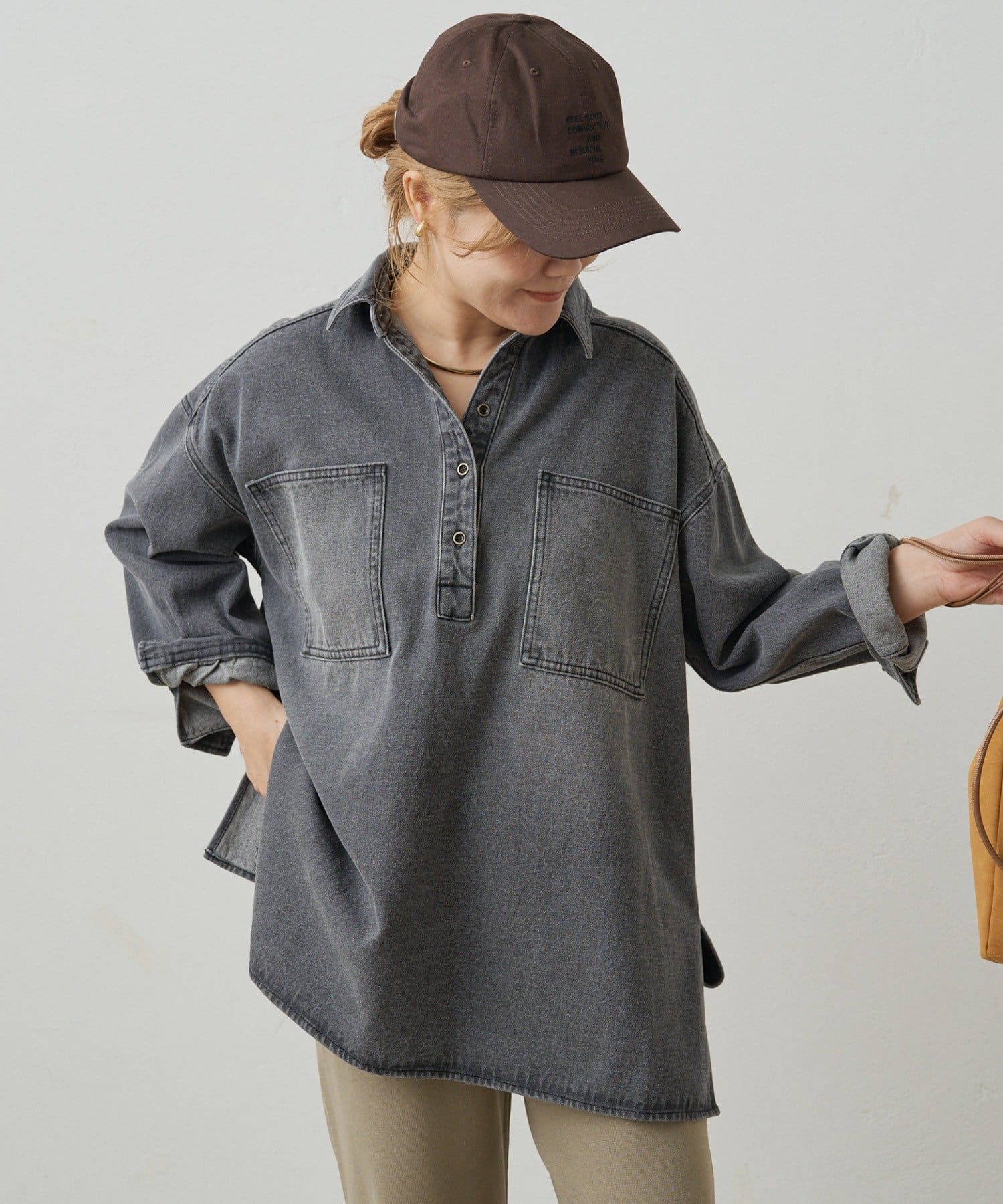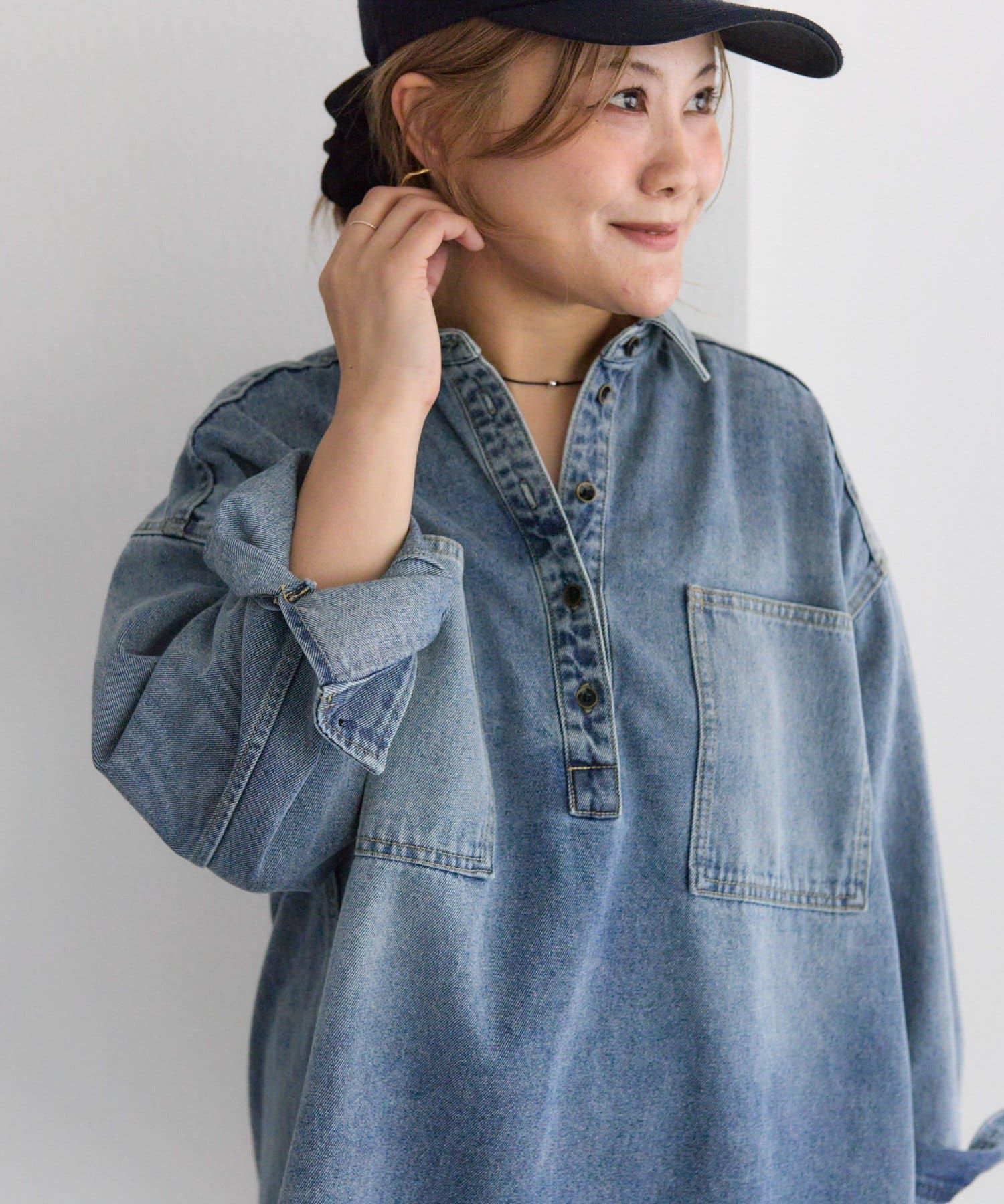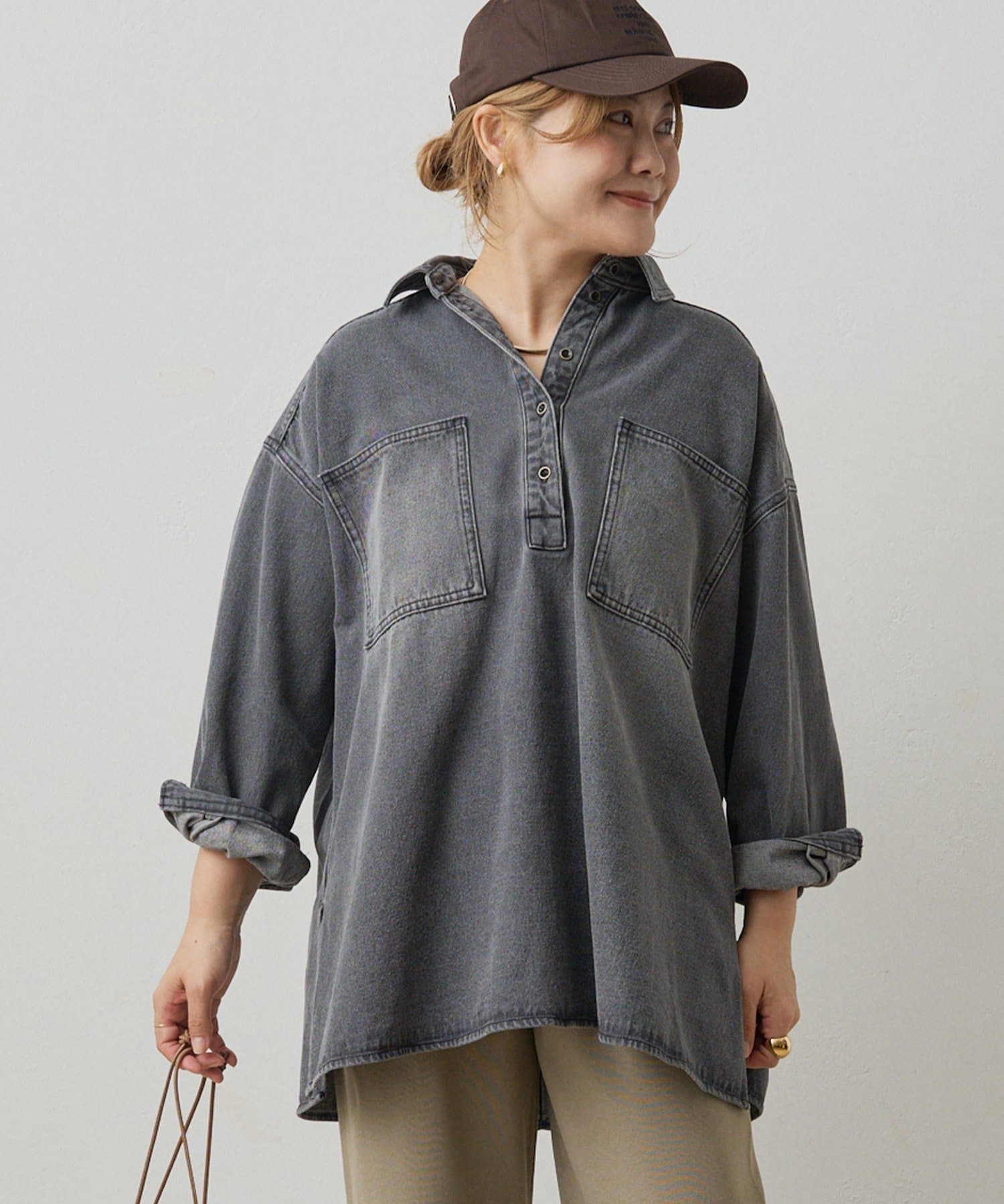 プルオーバーのトップスも胸元のボタンで抜け感を調整できるので、