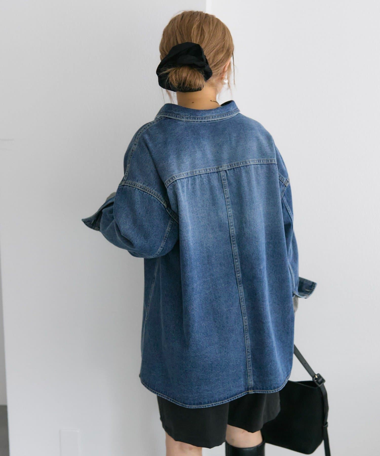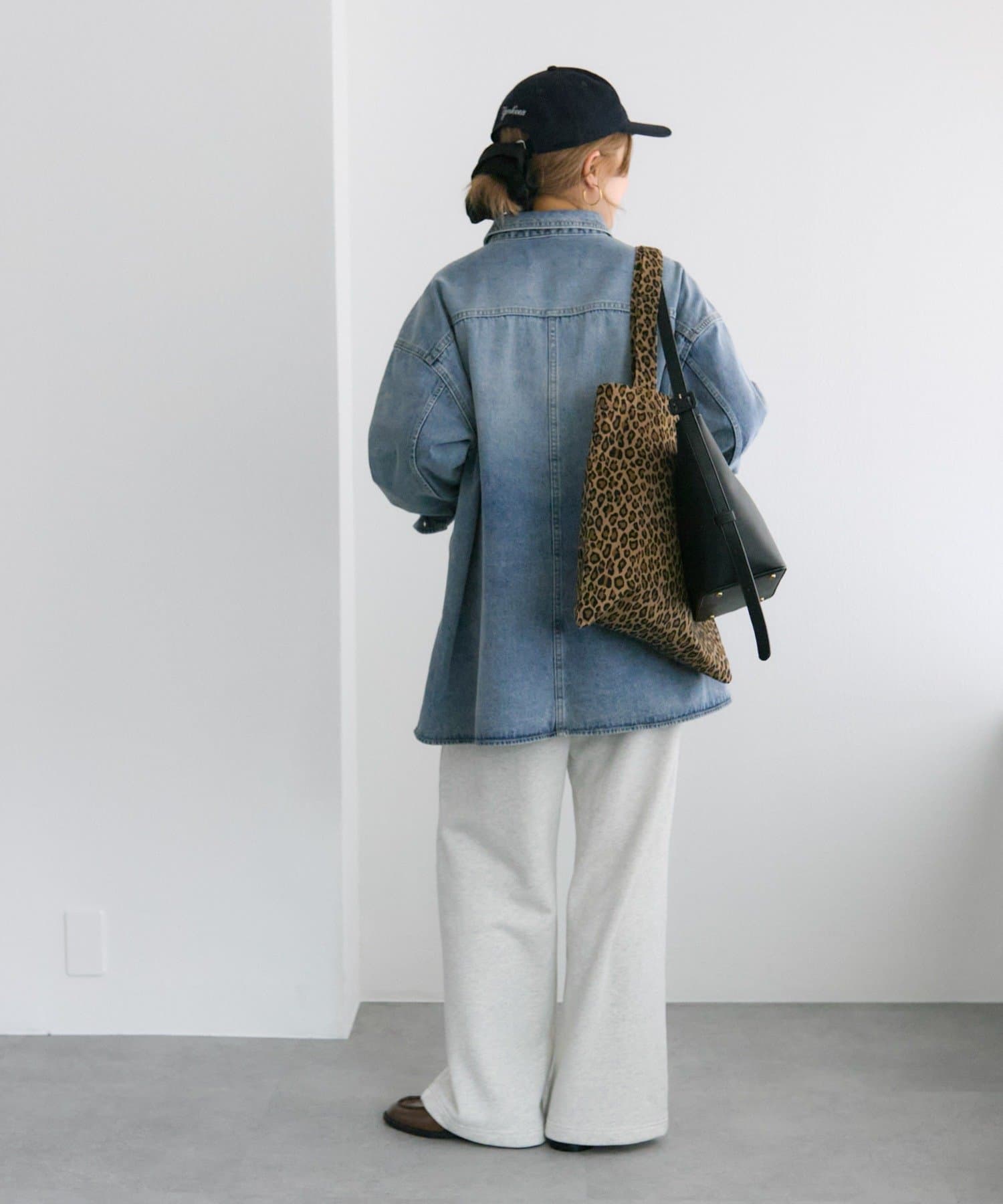 同じカラーのデニムパンツを合わせれば、トレンド感漂うセットアップ風のスタイルに。