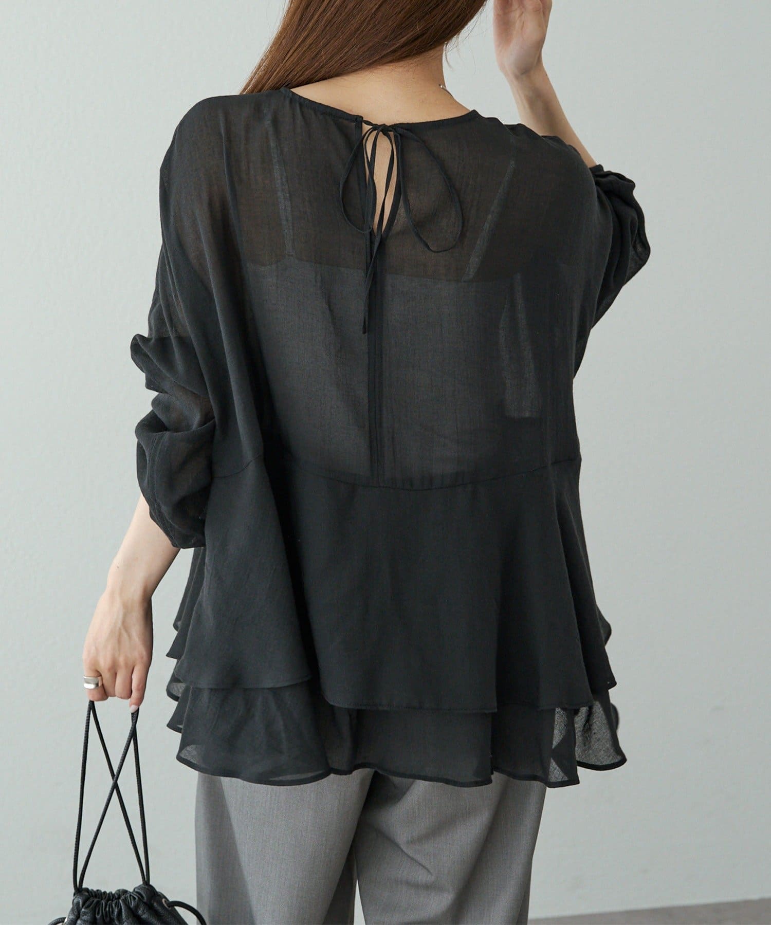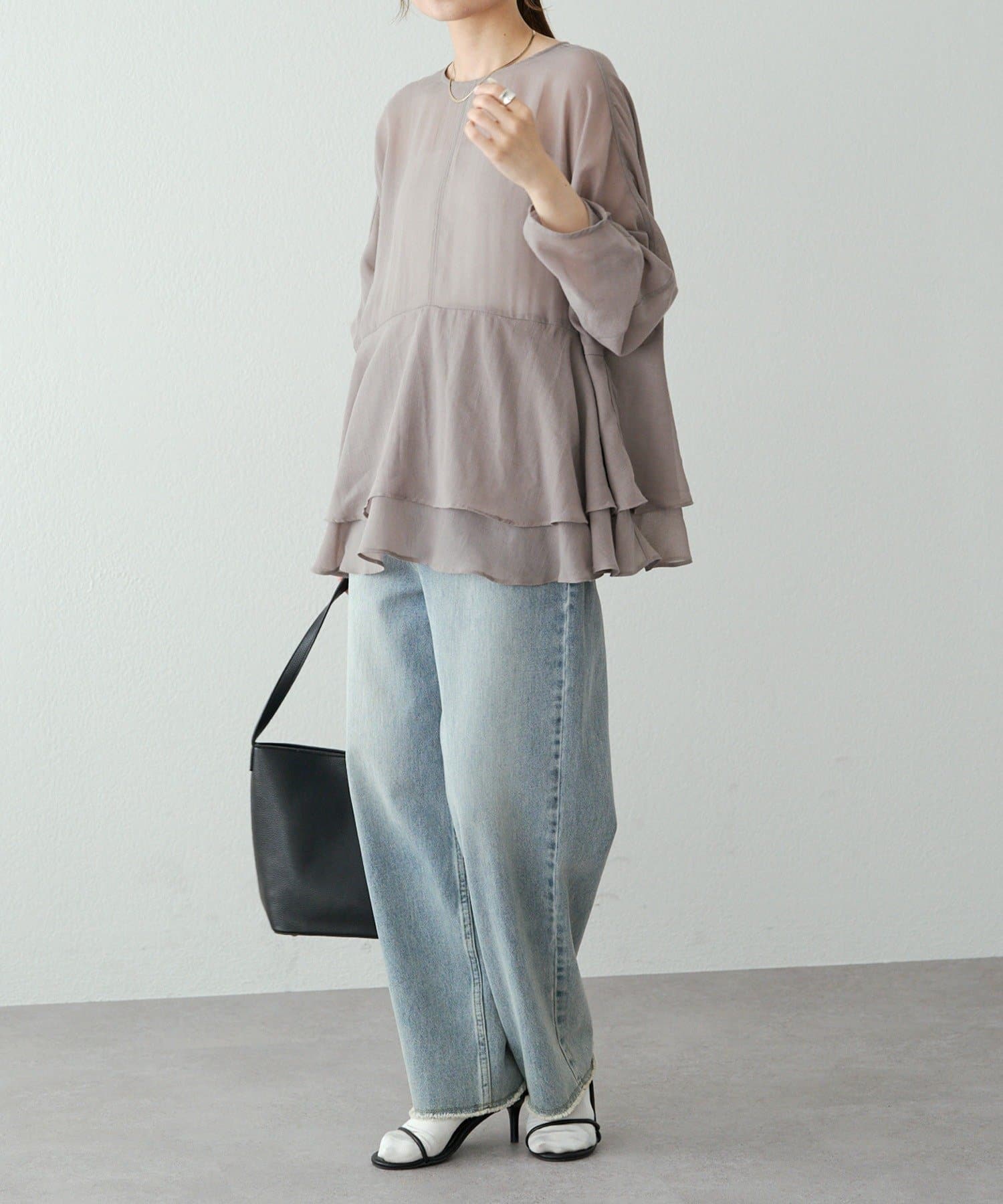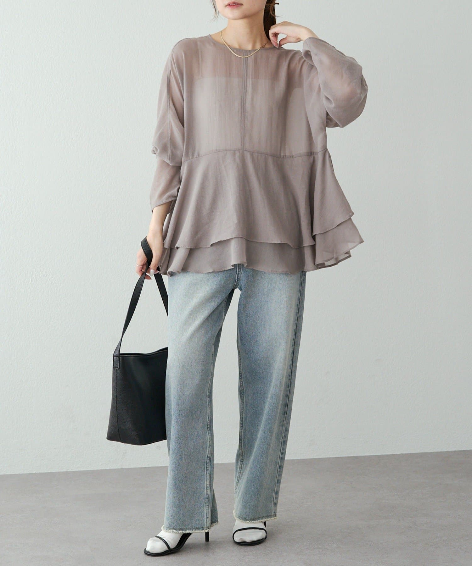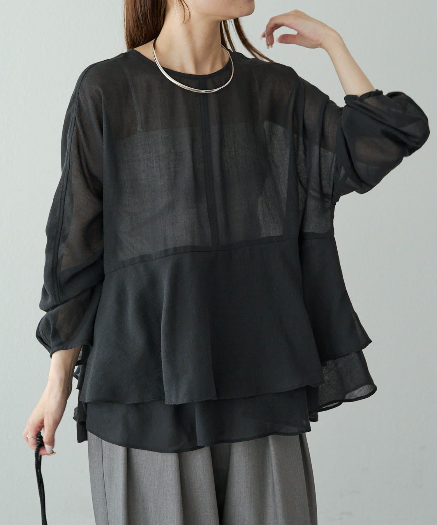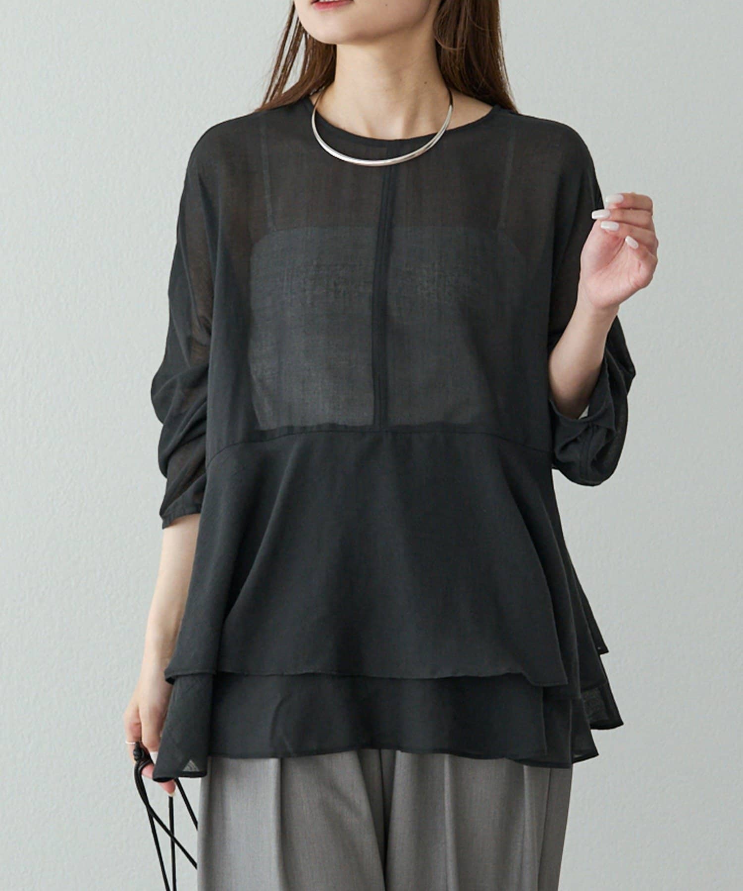 上品なエアリーさと2段ペプラムが女性らしいブラウス。