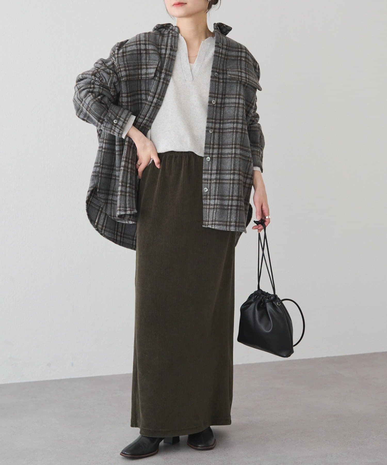 スカートとのスタイリングなら、ボタンを閉じてチュニック風が◎
