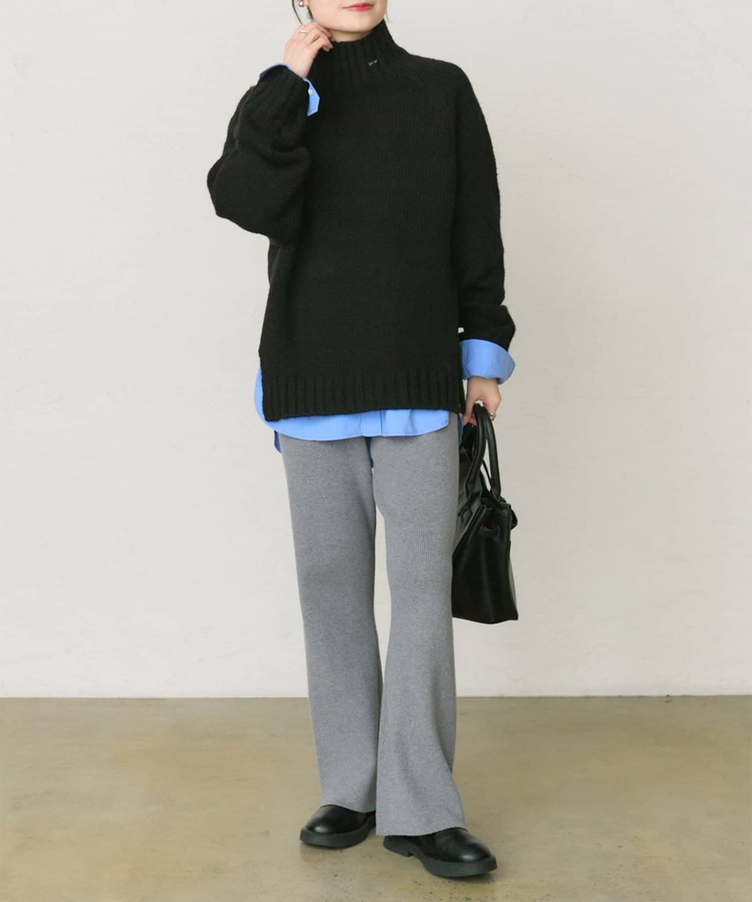ボトムをデニムパンツからスラックス、ナロースカートに変えると、