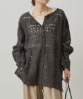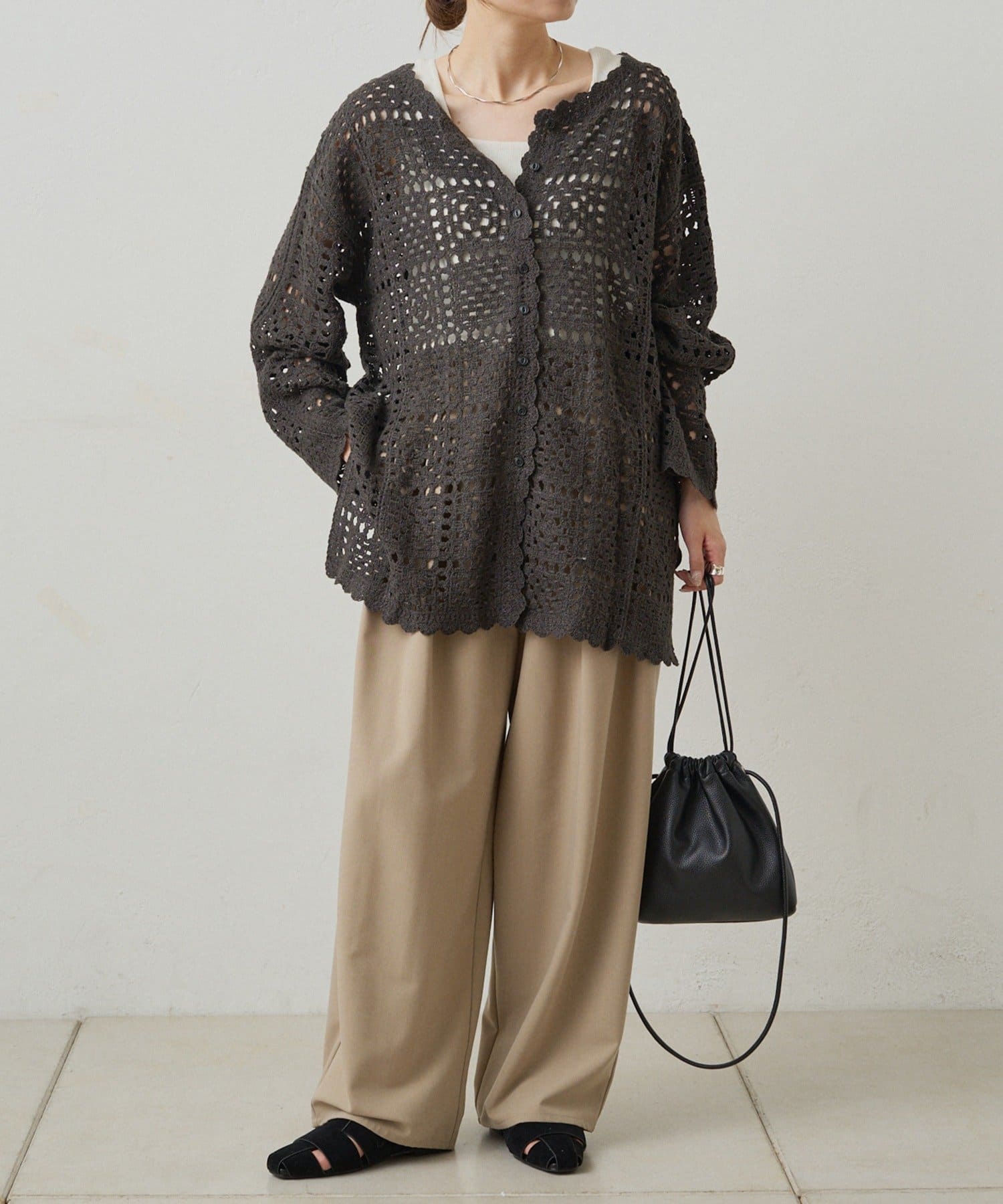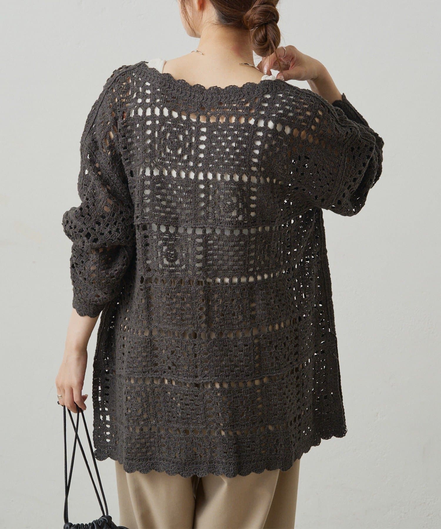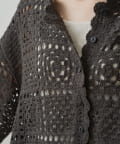 パッと目を惹くクロシェット風仕立てのニットカーディガン。