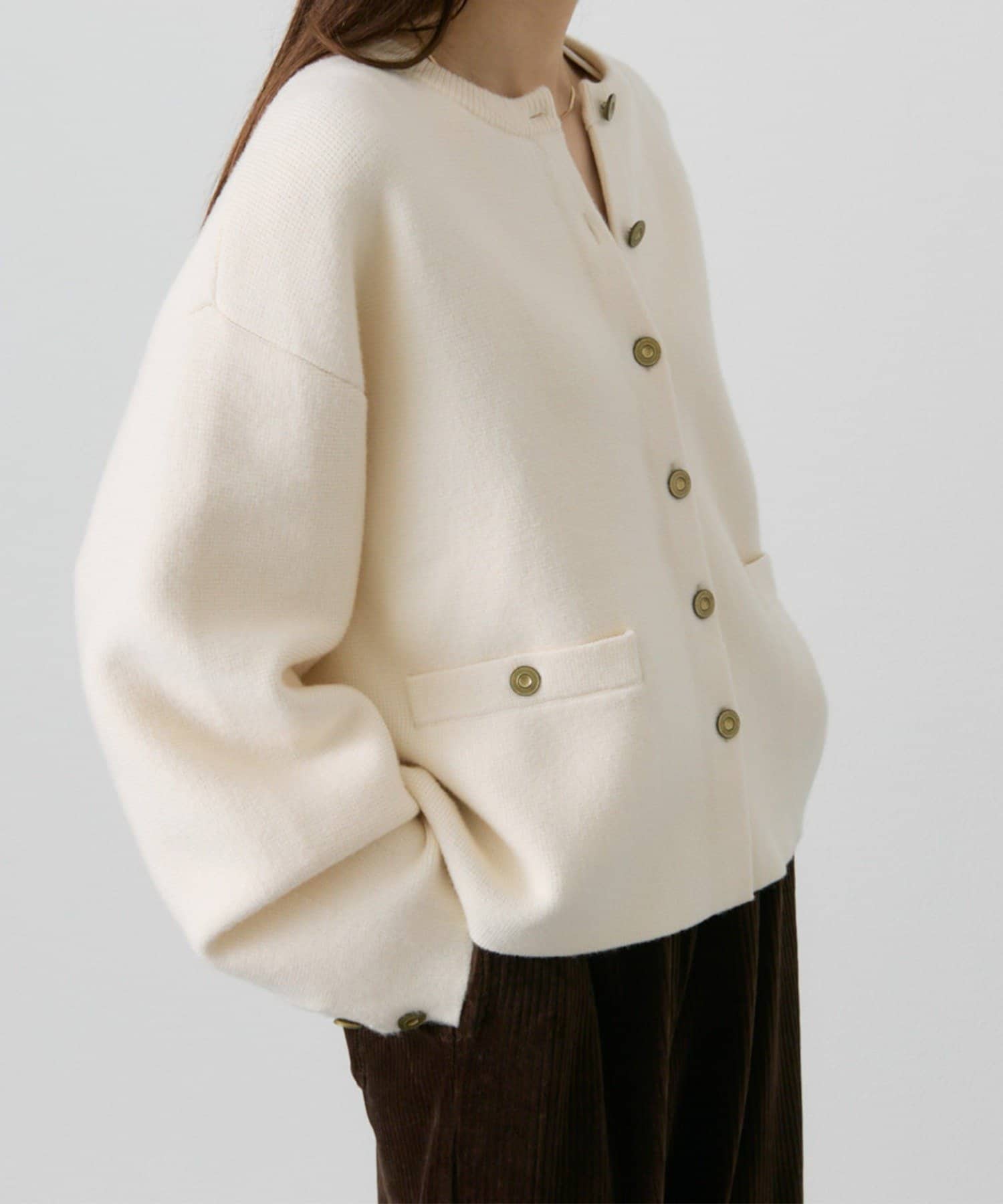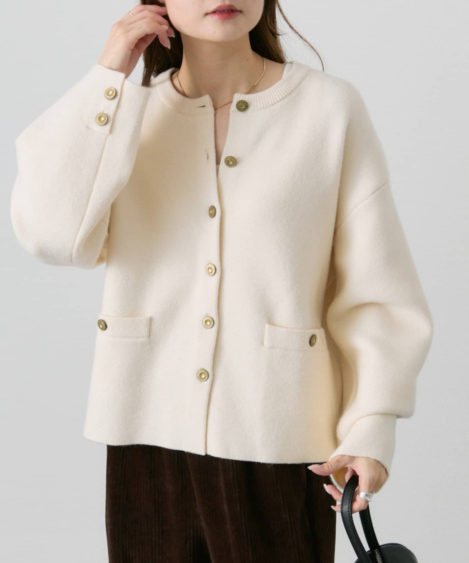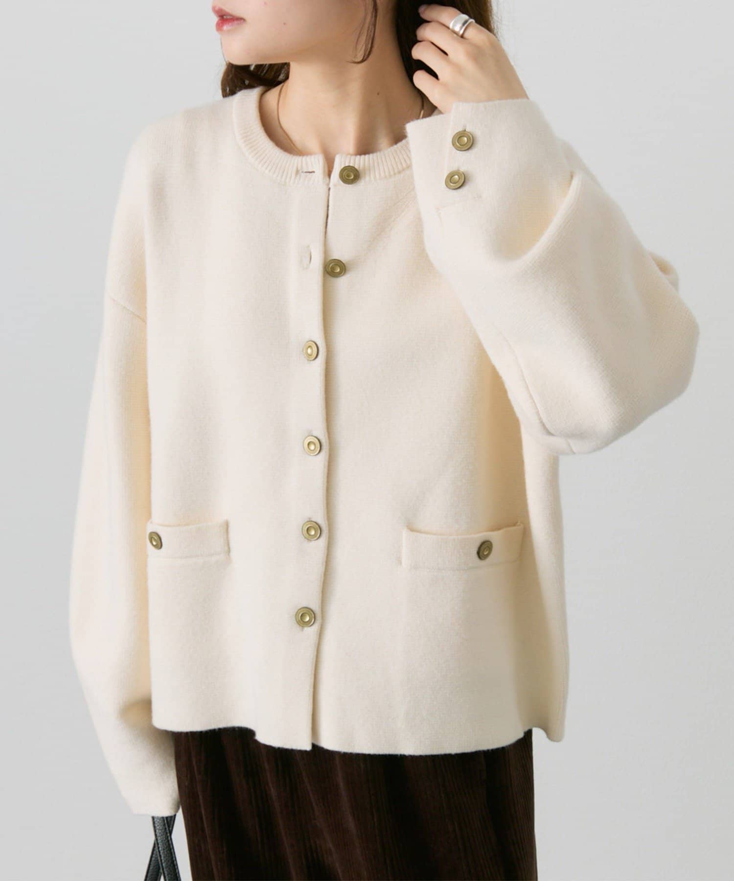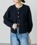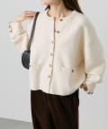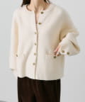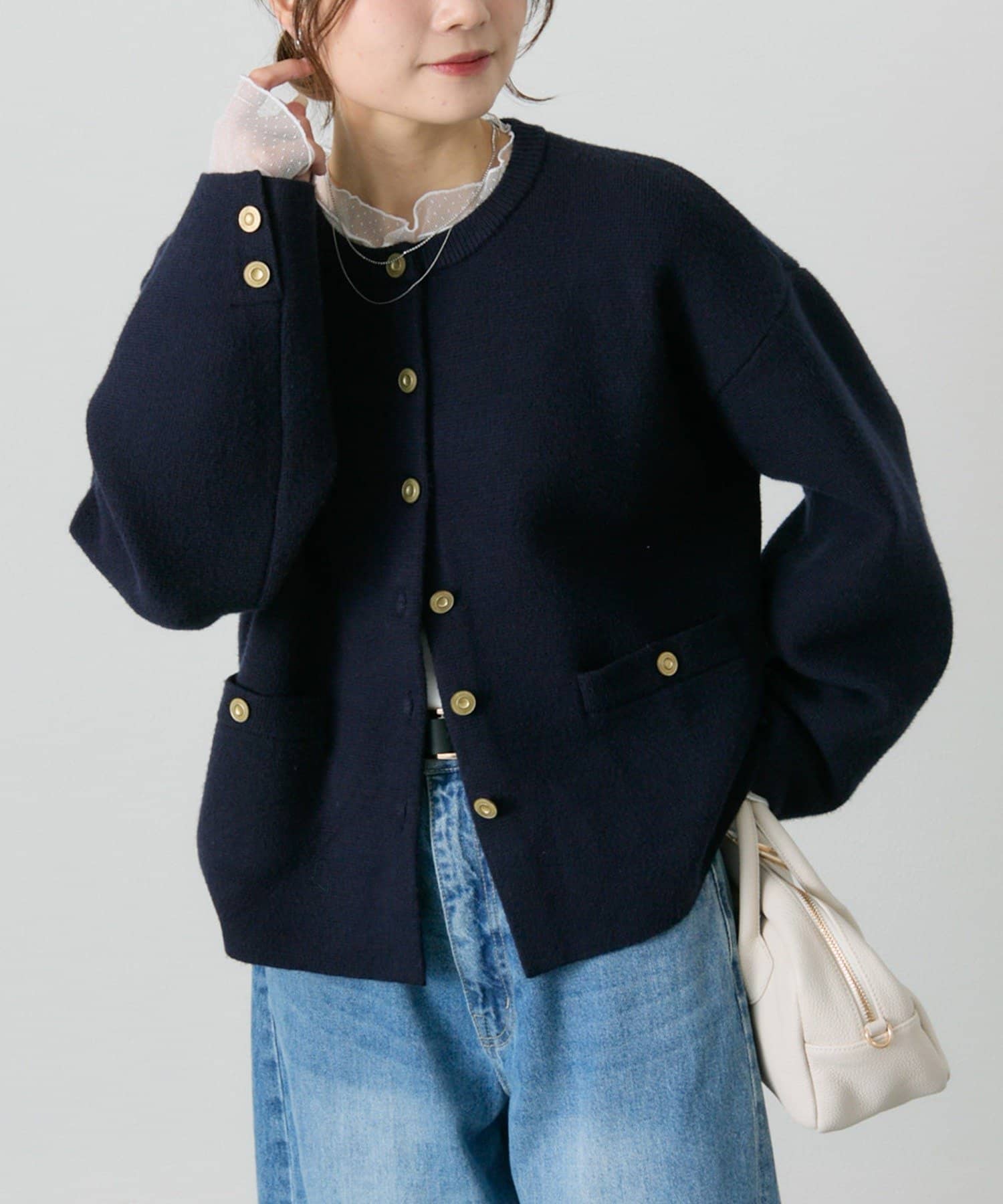 味のあるゴールドのボタンが映えるジャケット風のカーディガン。