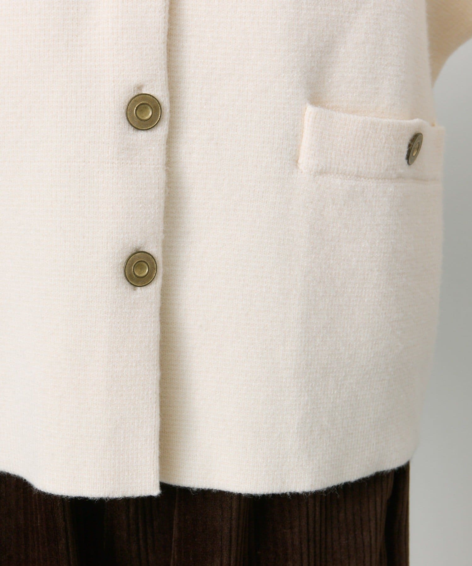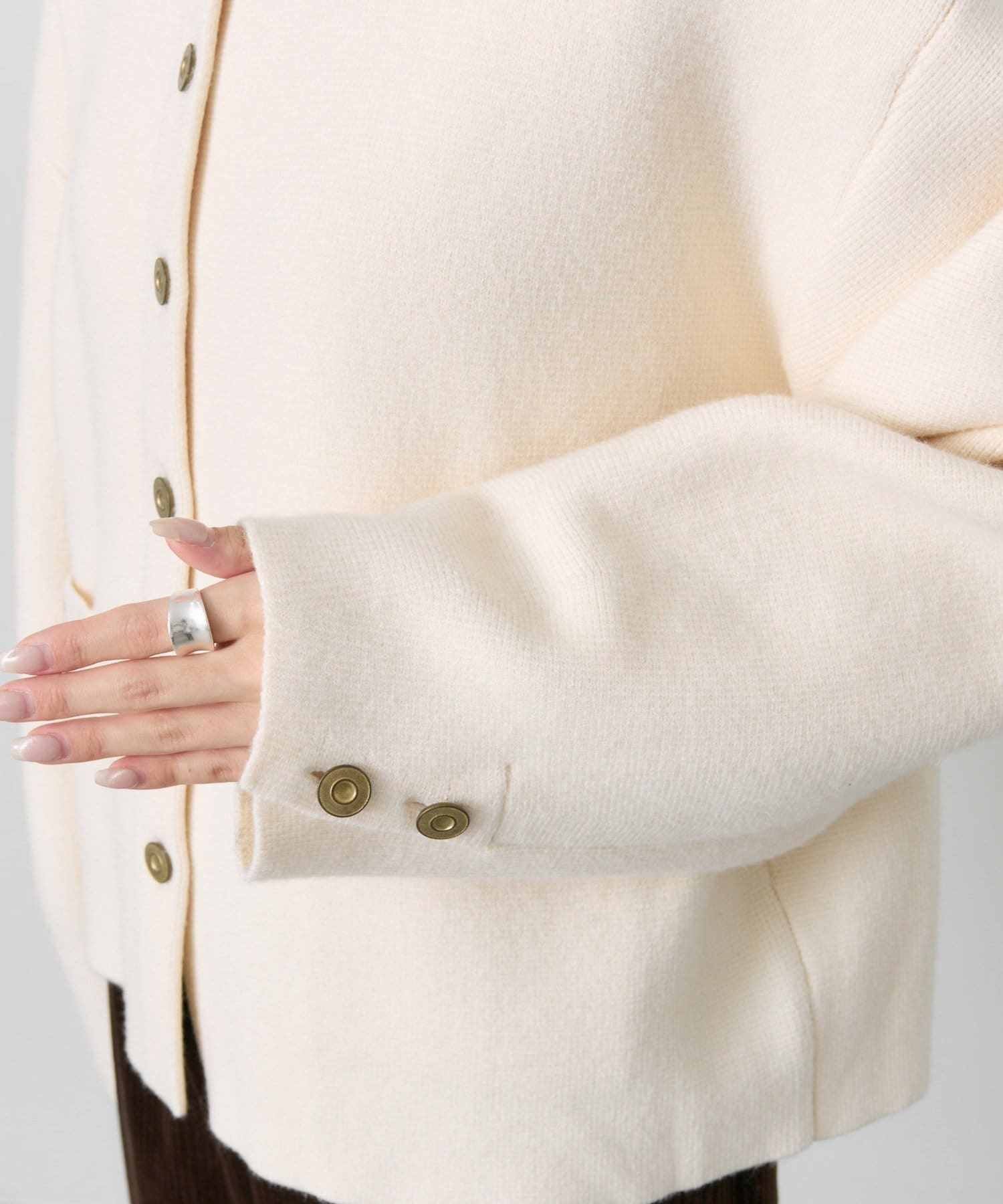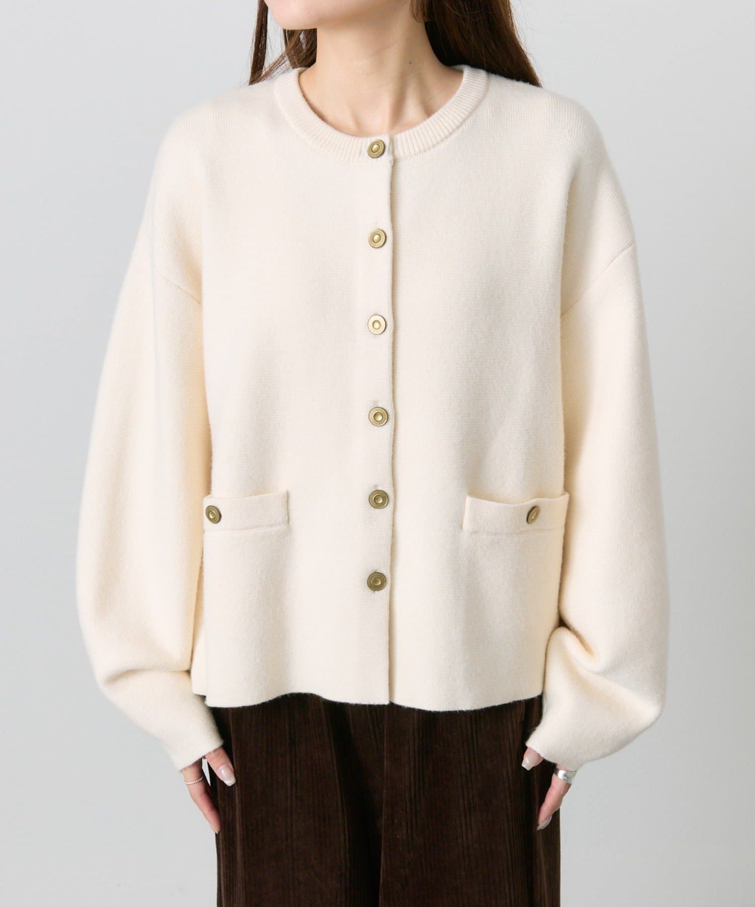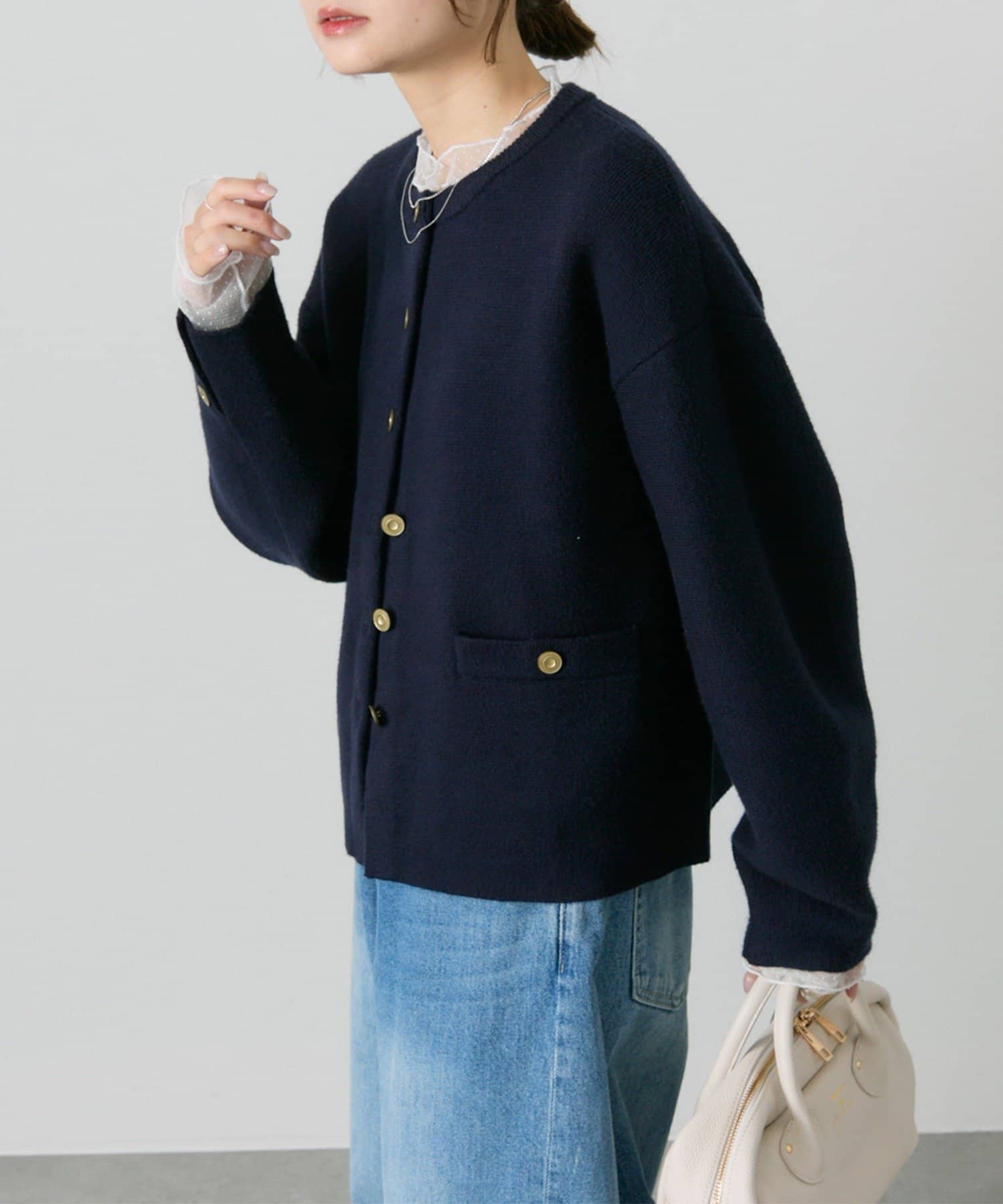 味のあるゴールドのボタンが映えるジャケット風のカーディガン。