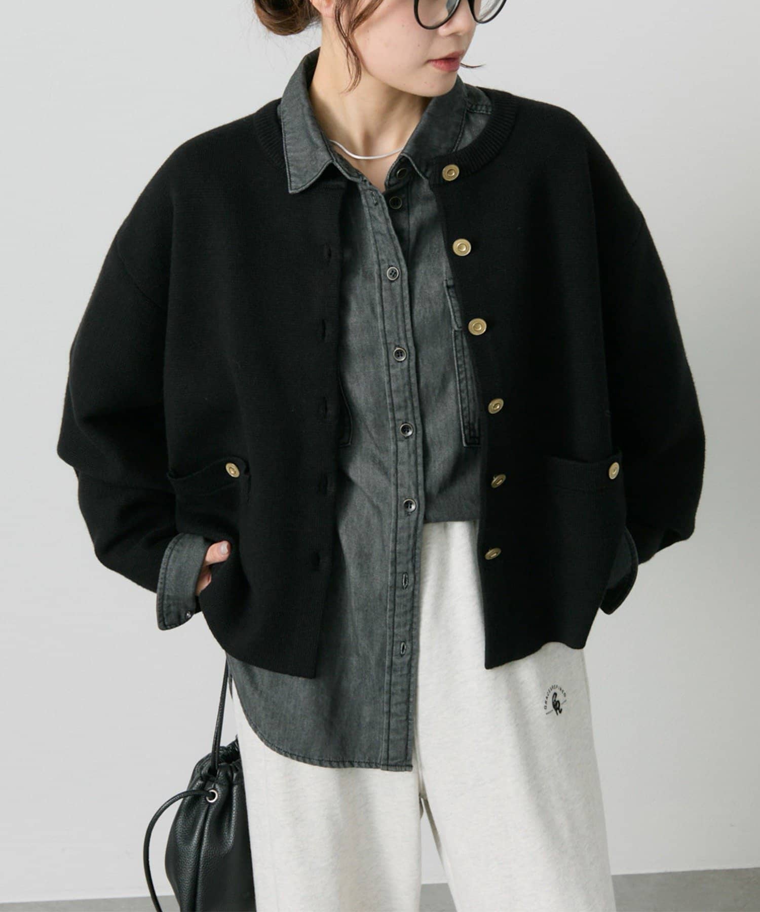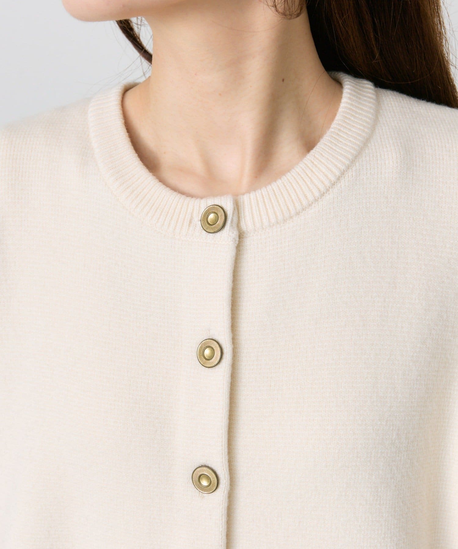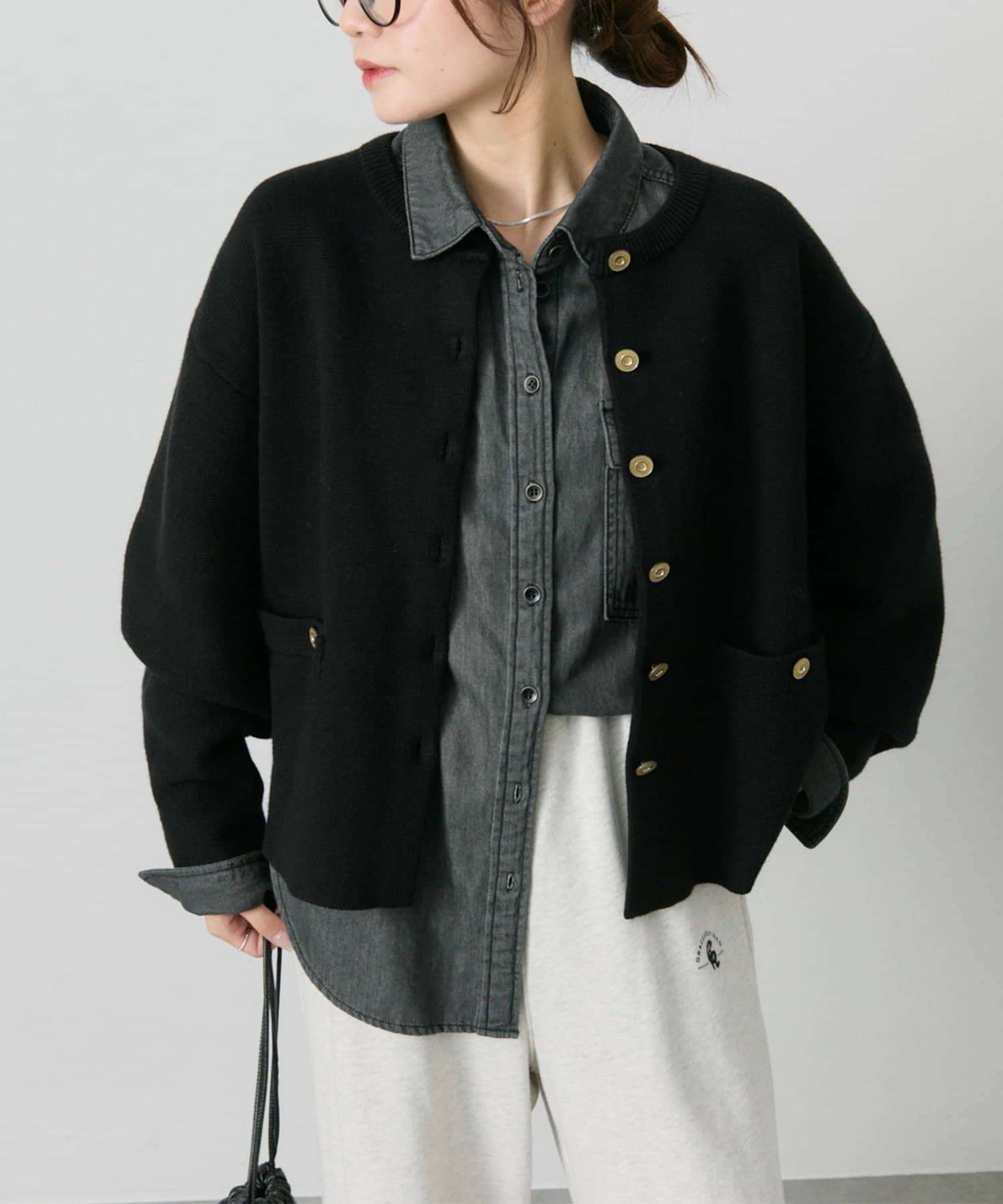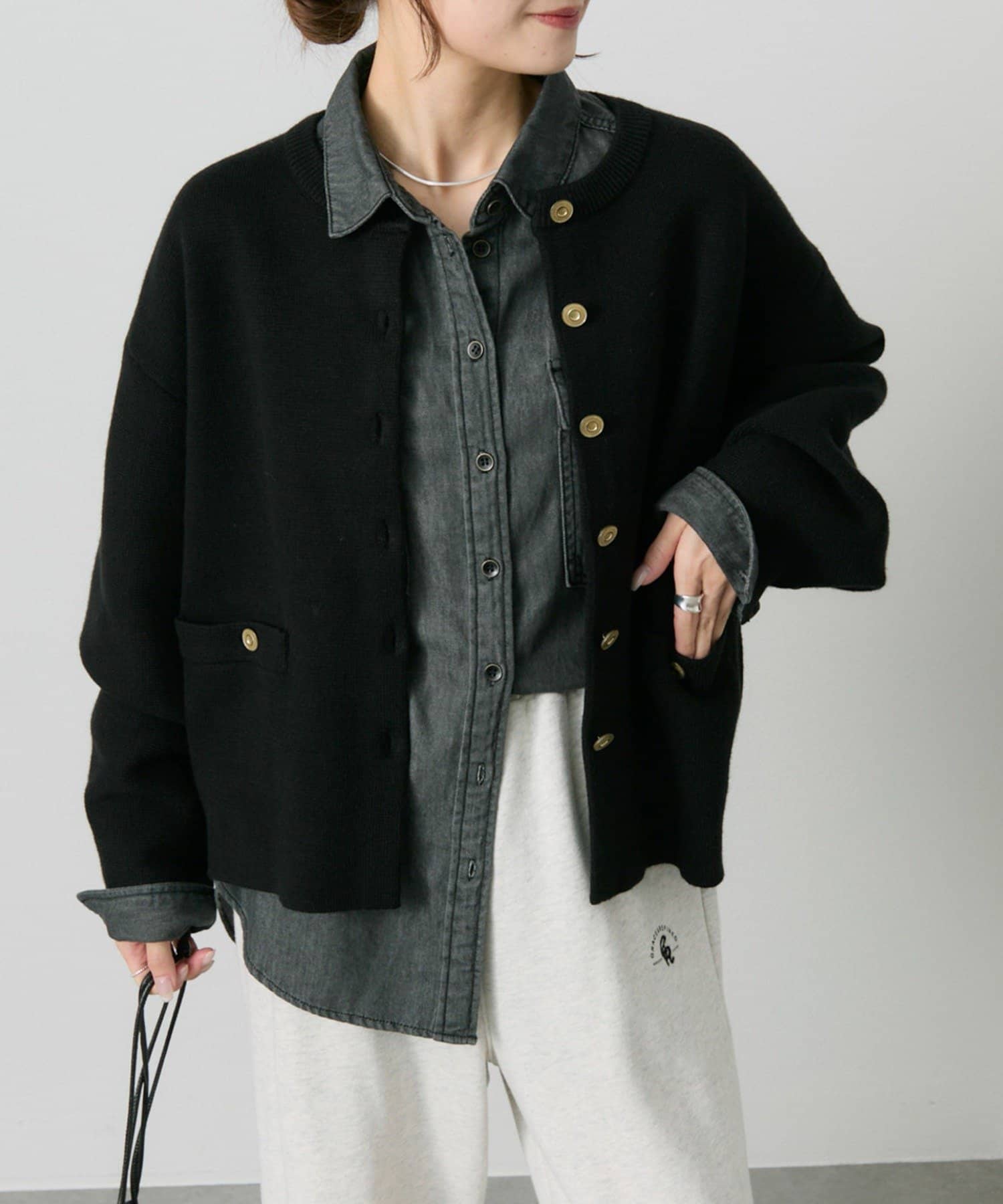 味のあるゴールドのボタンが映えるジャケット風のカーディガン。