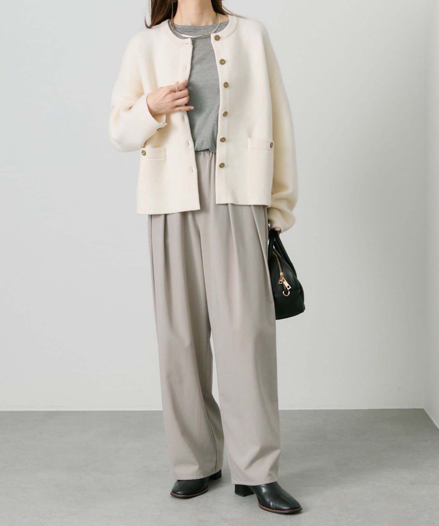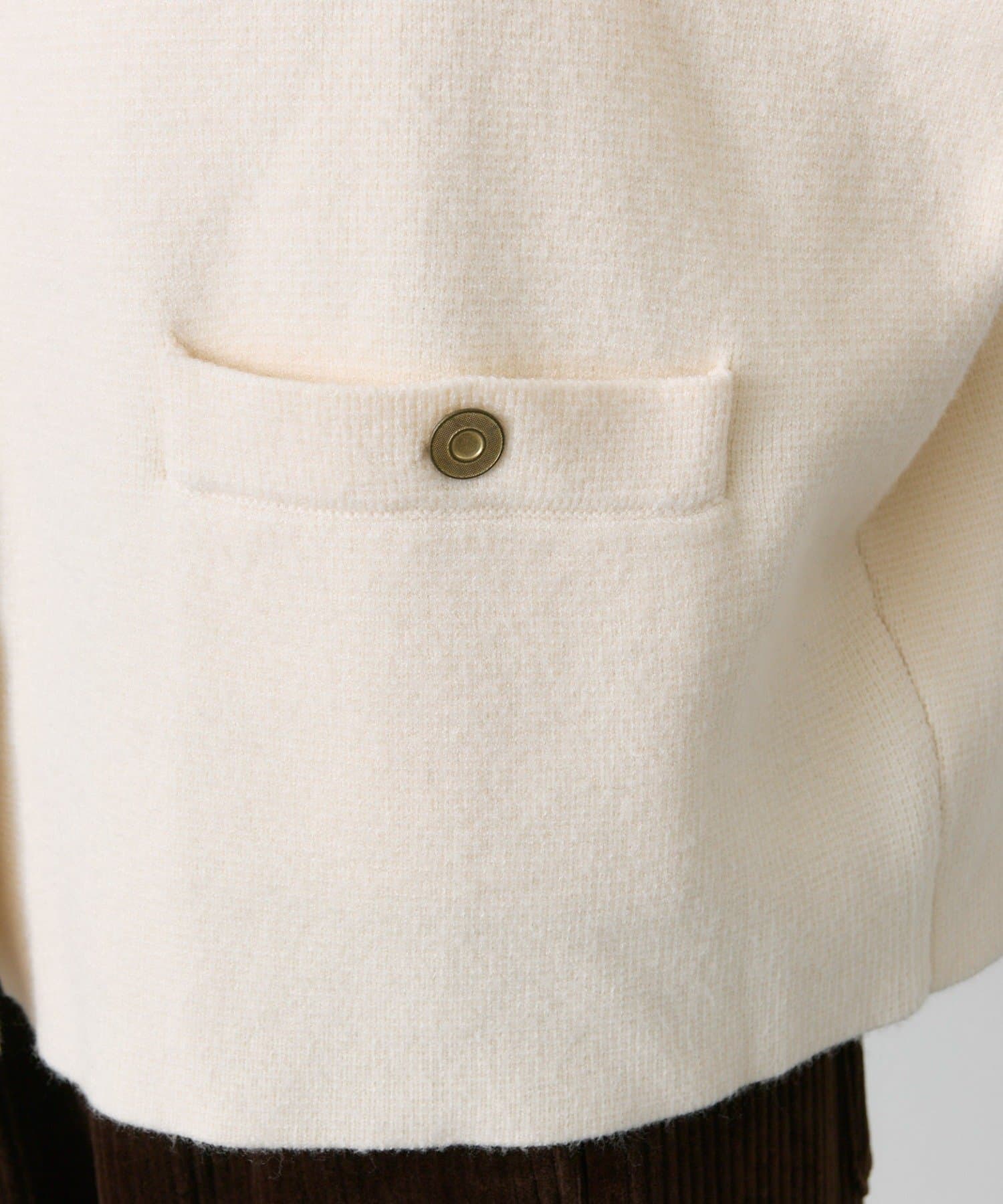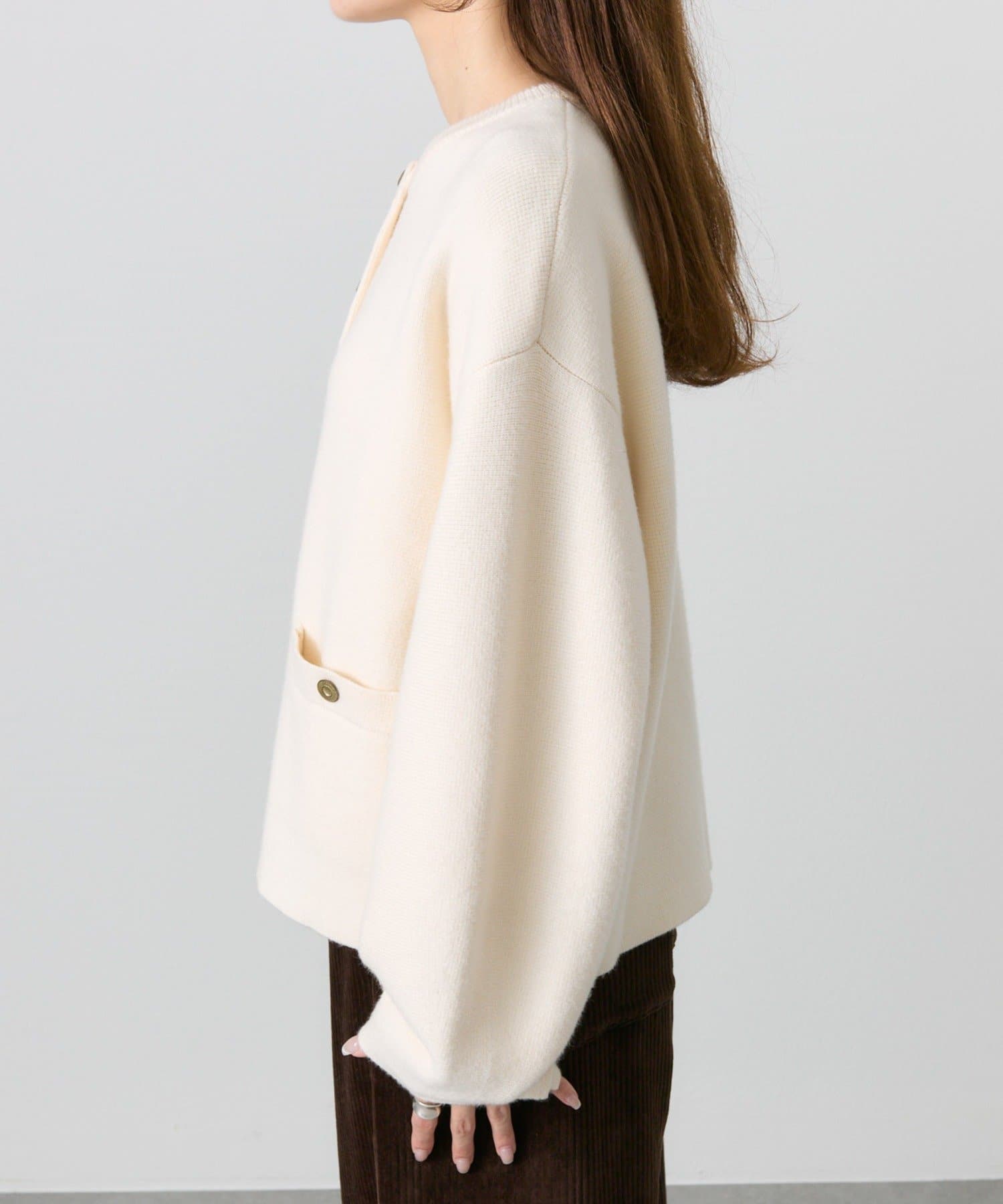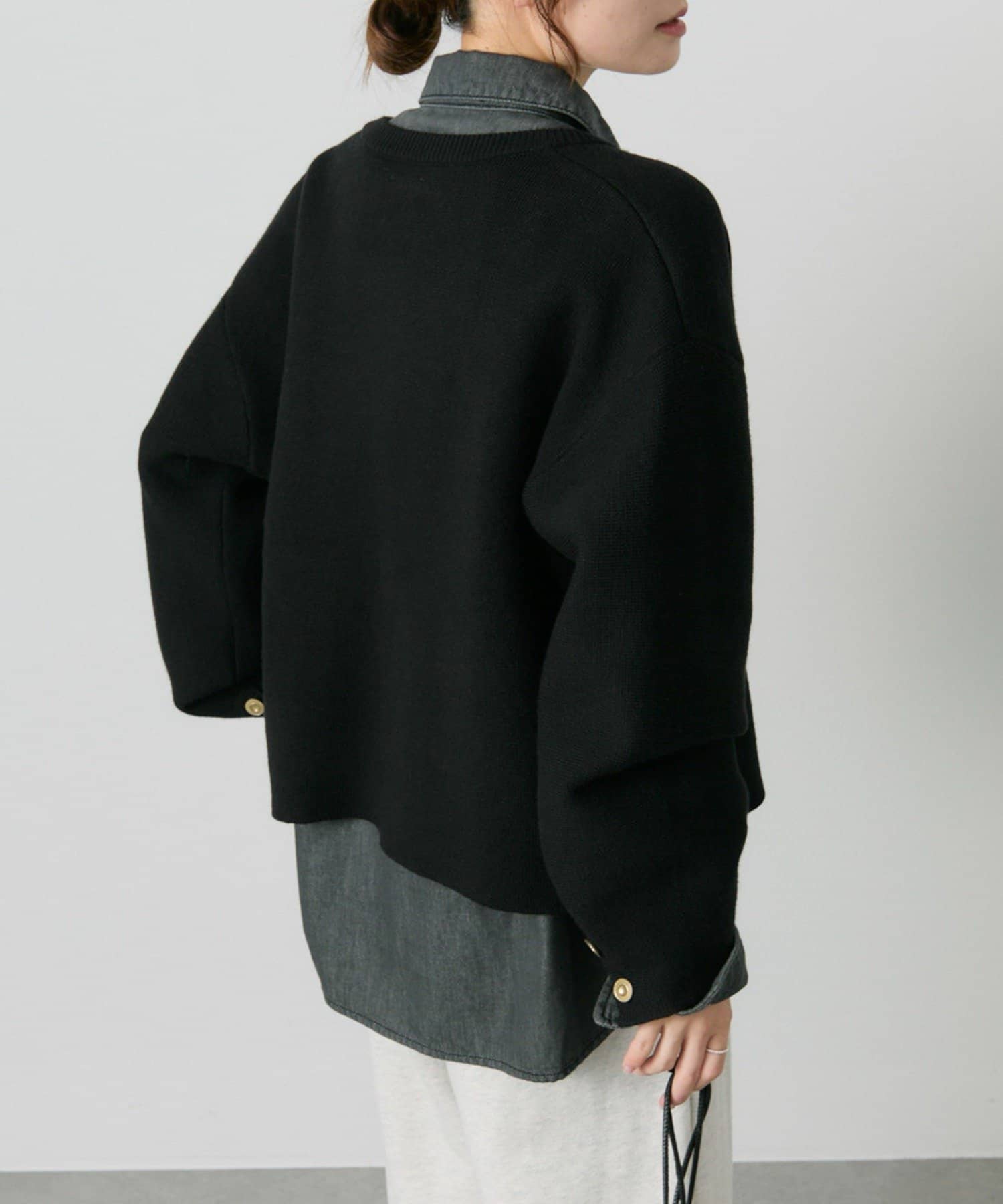 身幅やアームにゆとりを持ったサイジングなので、ブラウスやカットソーとの着合わせてもスムーズに着脱でき、気軽に羽織れます。