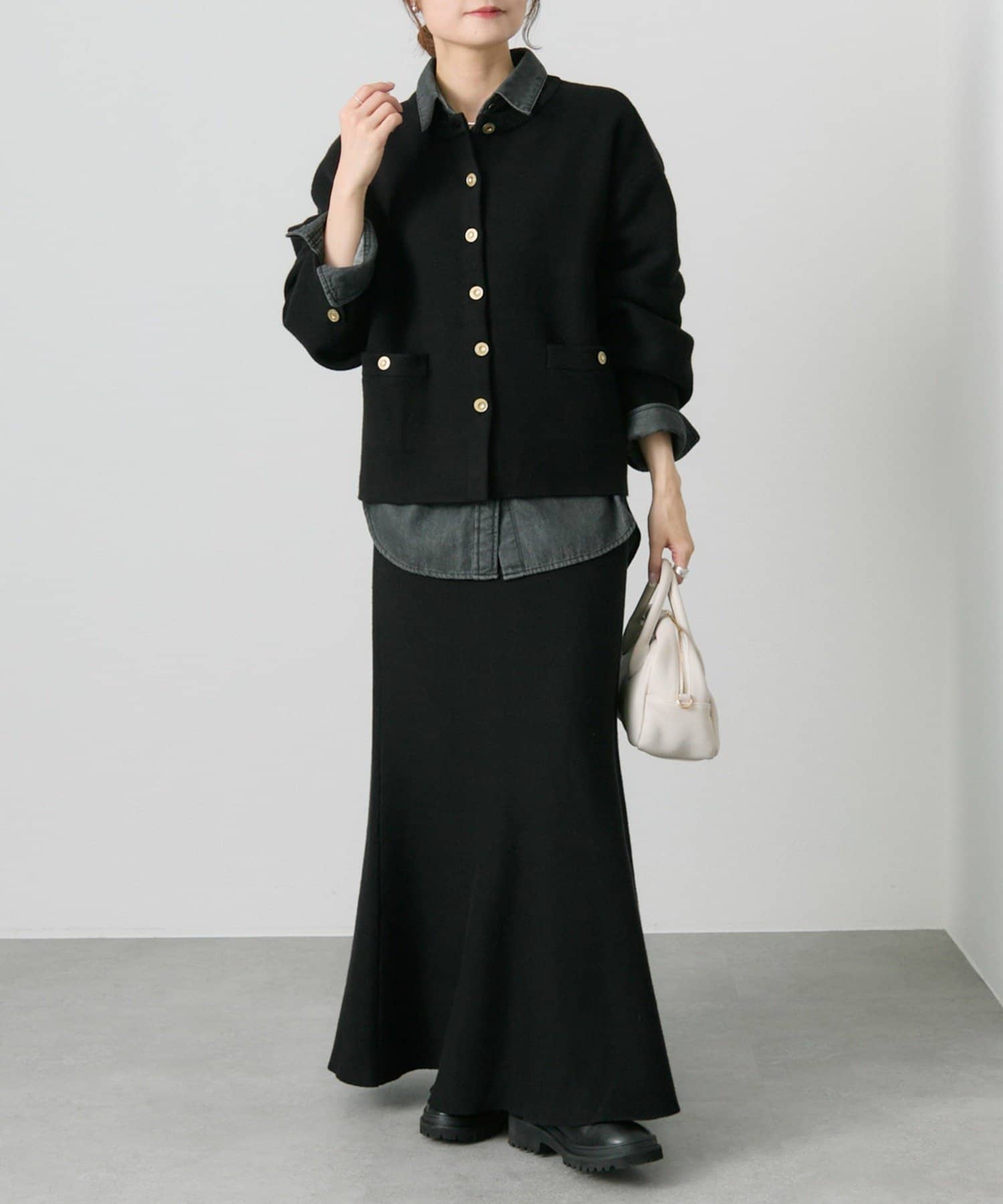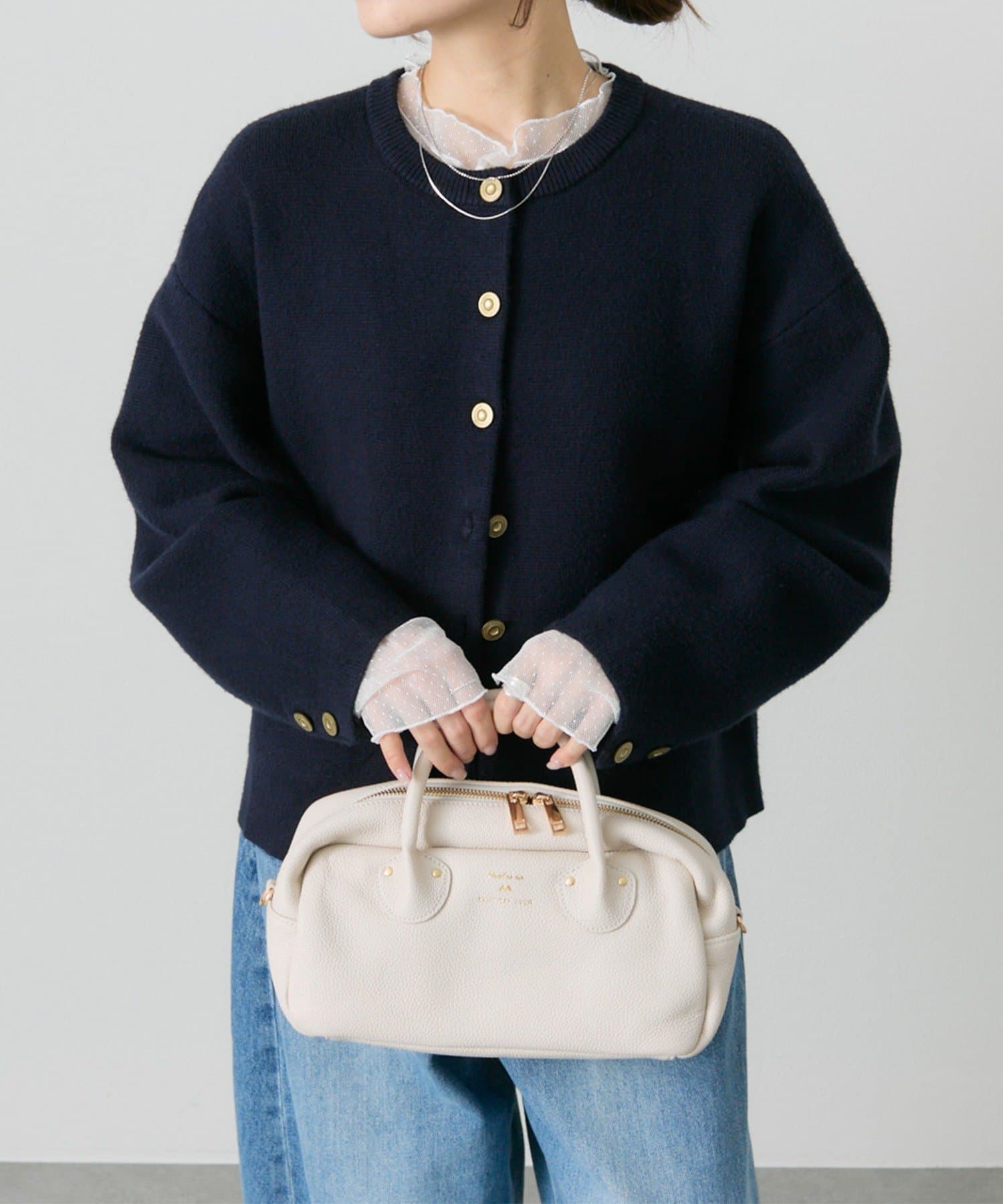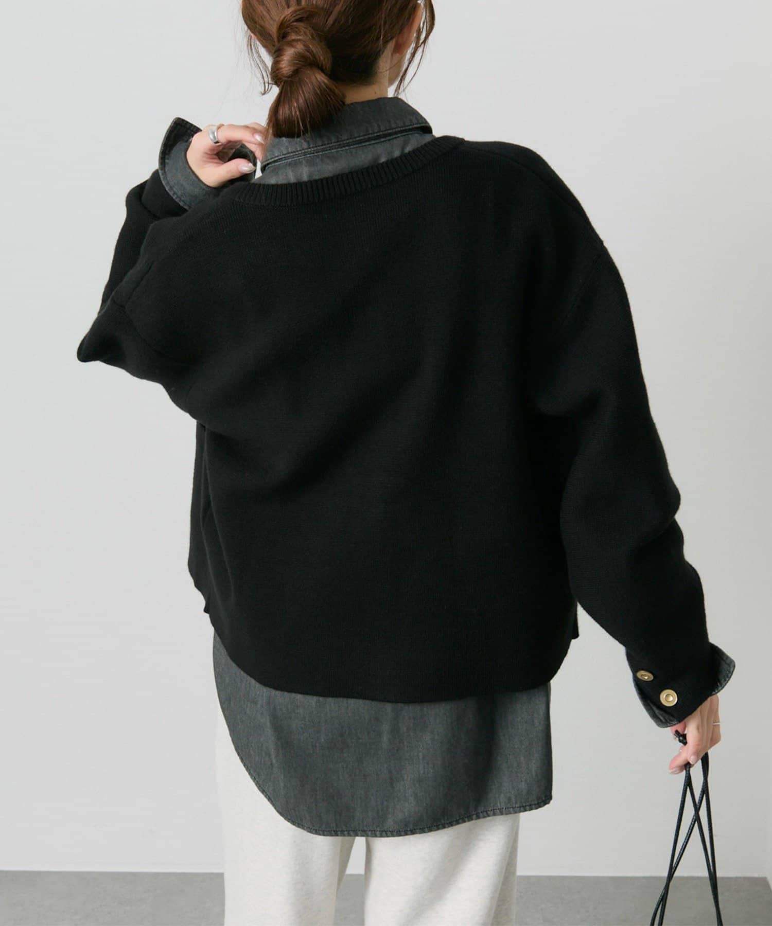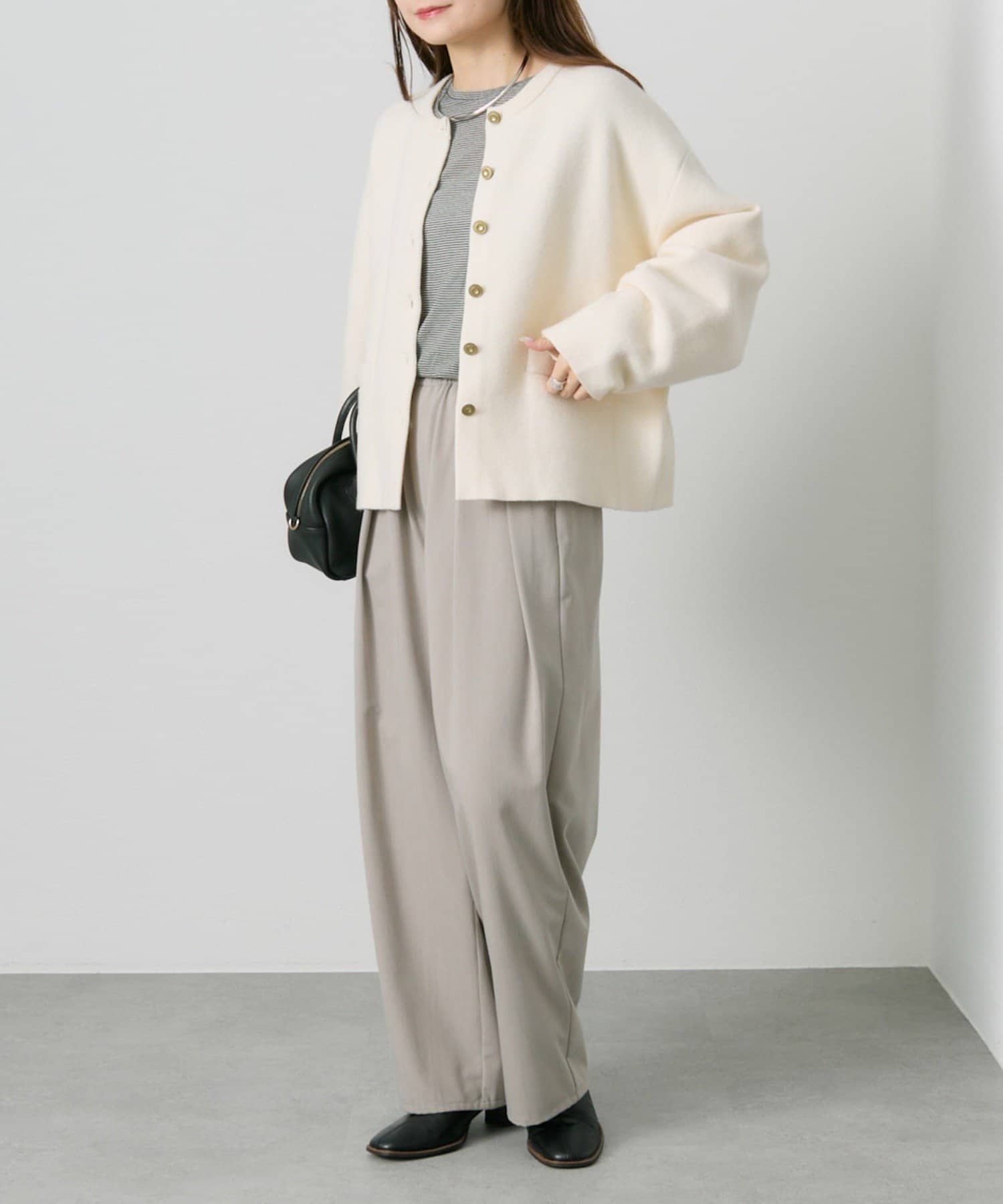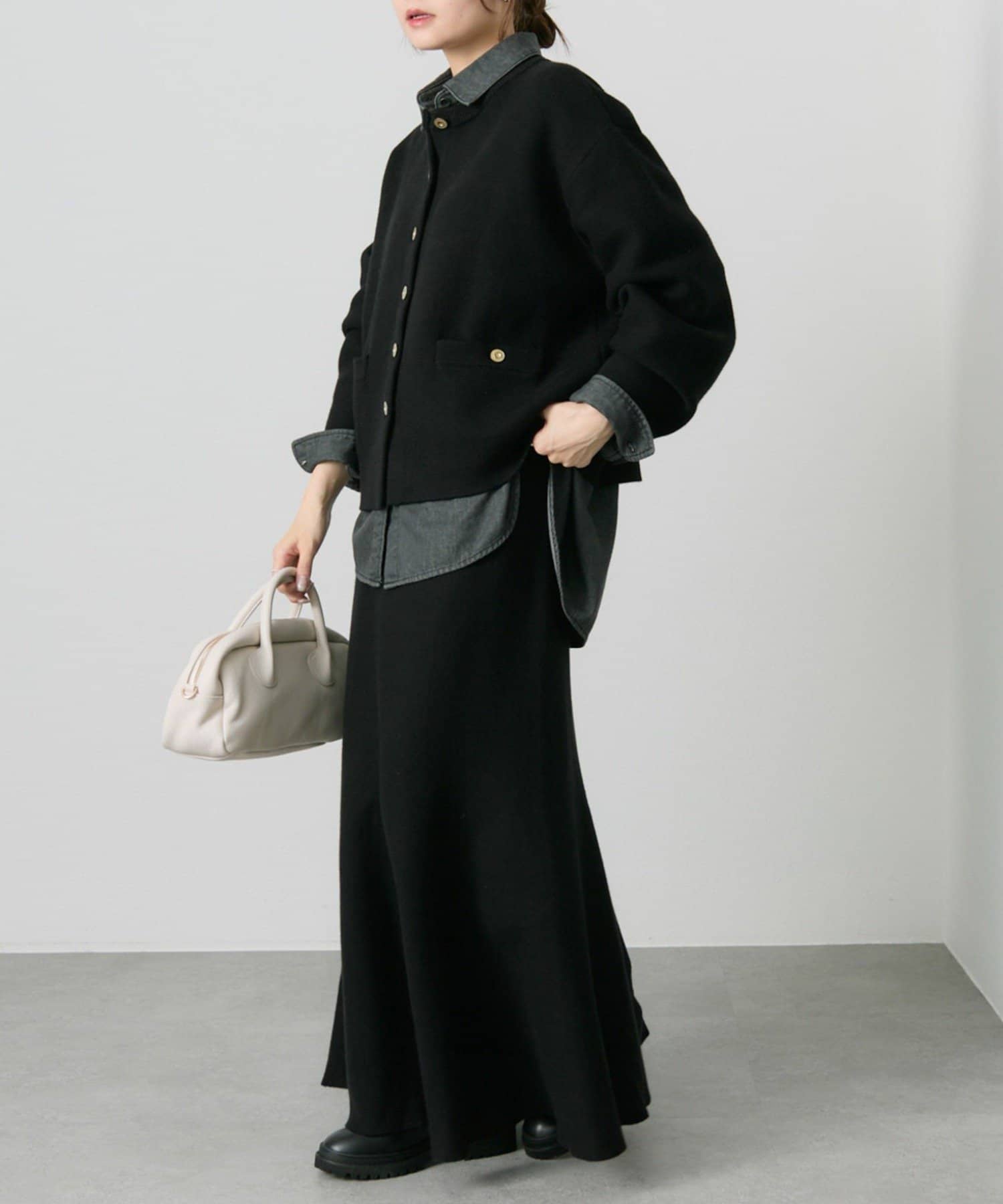 身幅やアームにゆとりを持ったサイジングなので、ブラウスやカットソーとの着合わせてもスムーズに着脱でき、気軽に羽織れます。