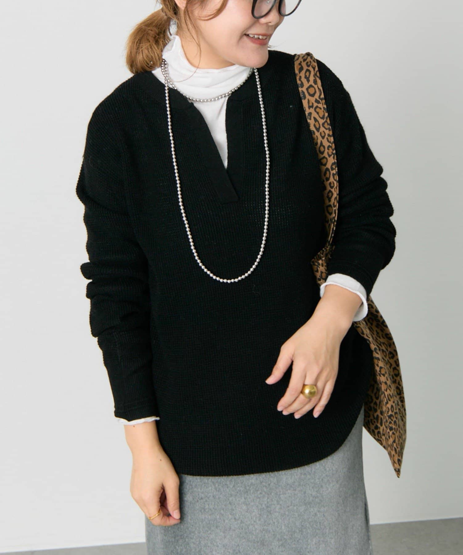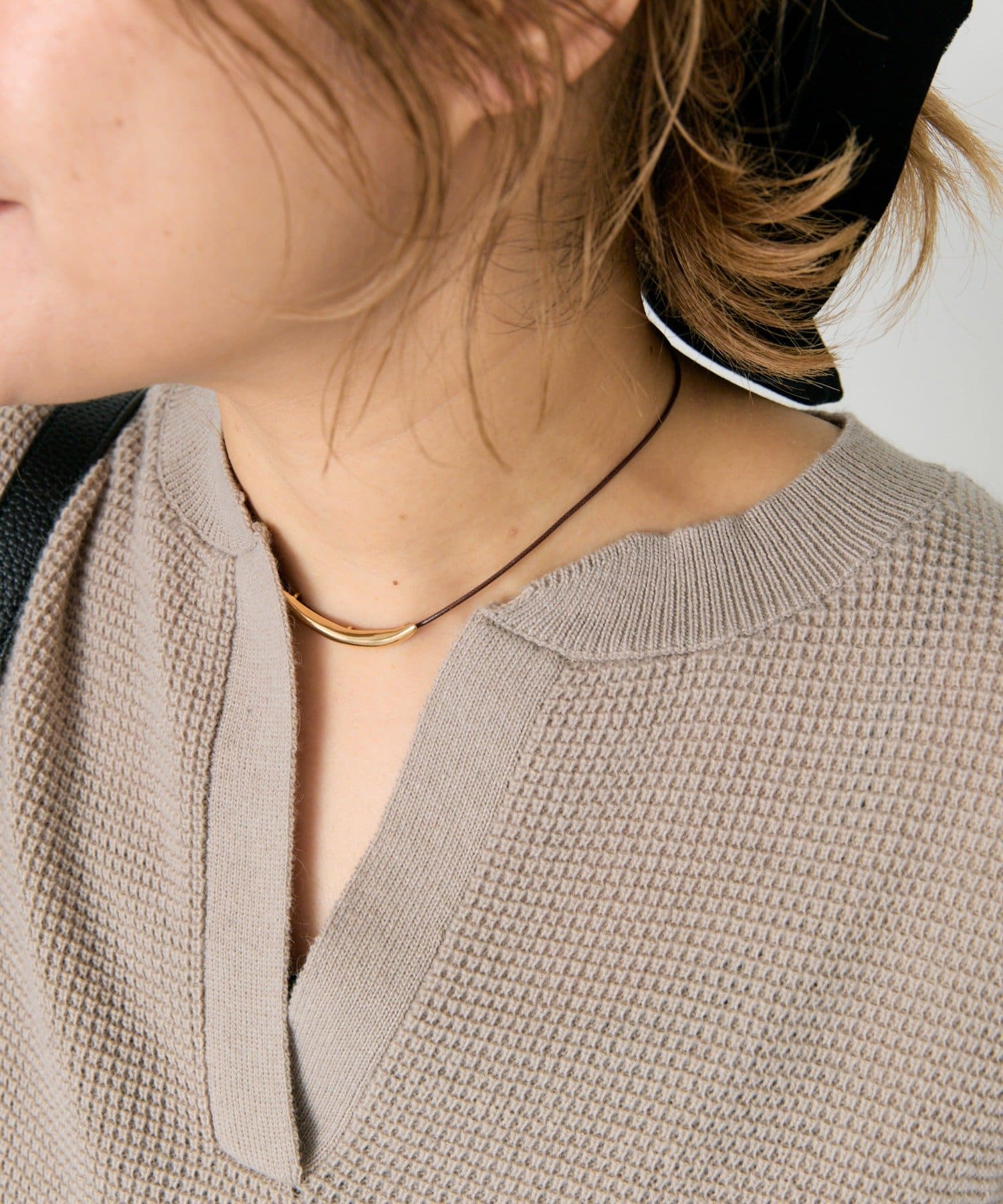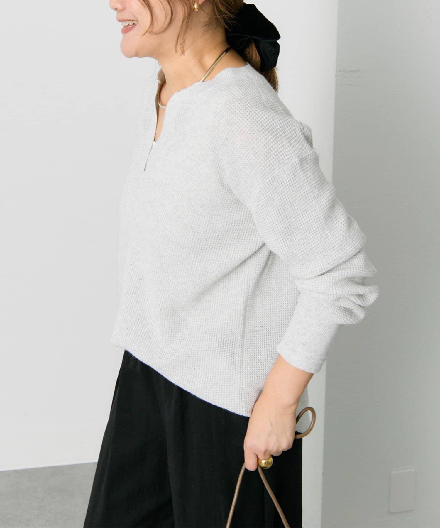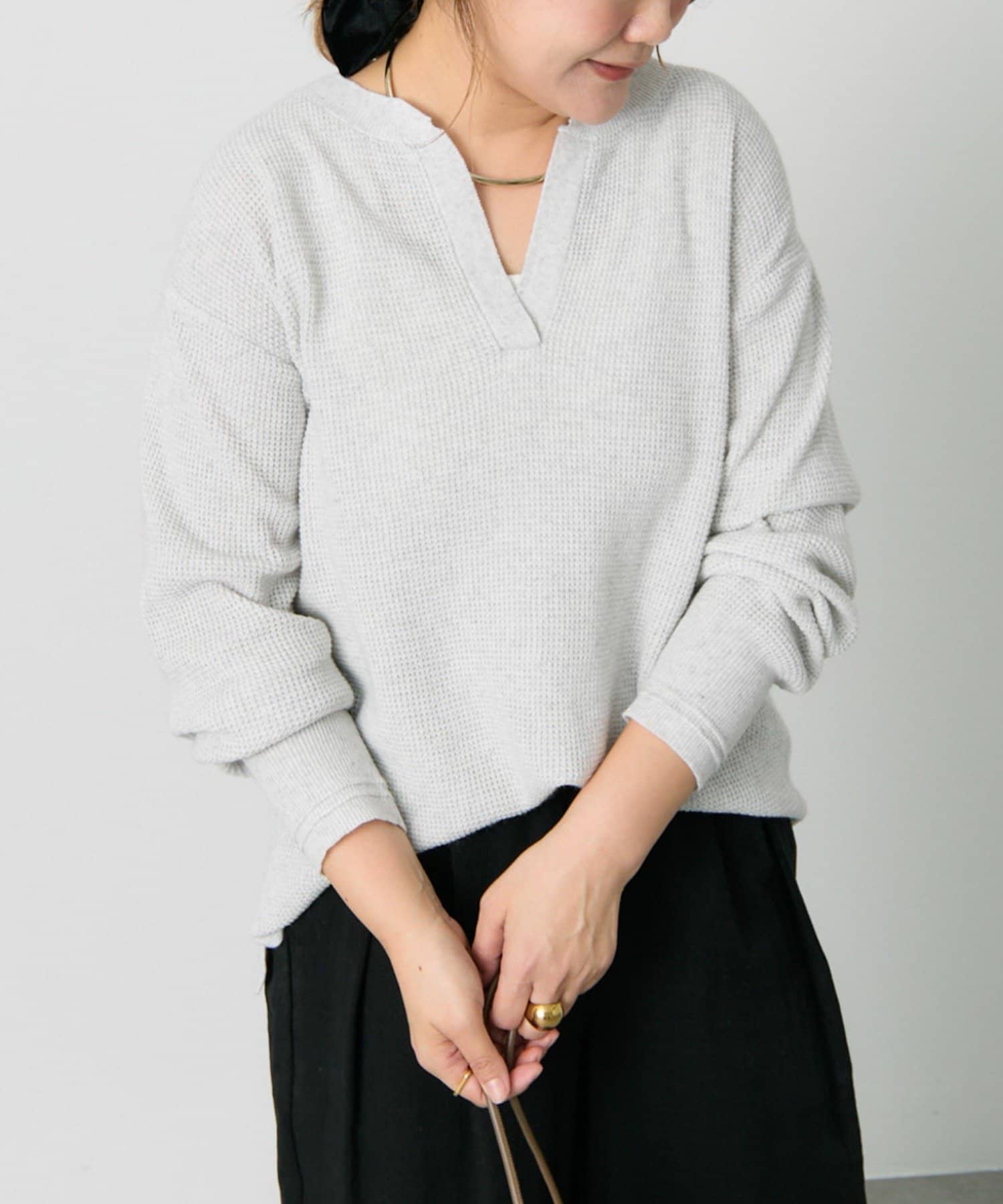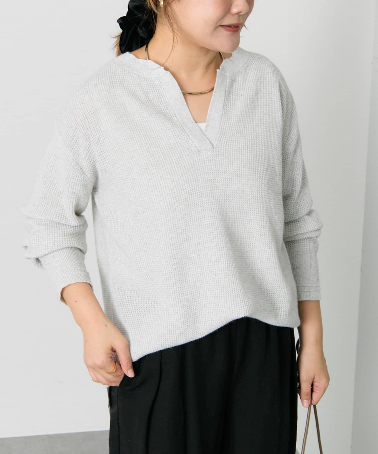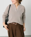 キーネックワッフルニット