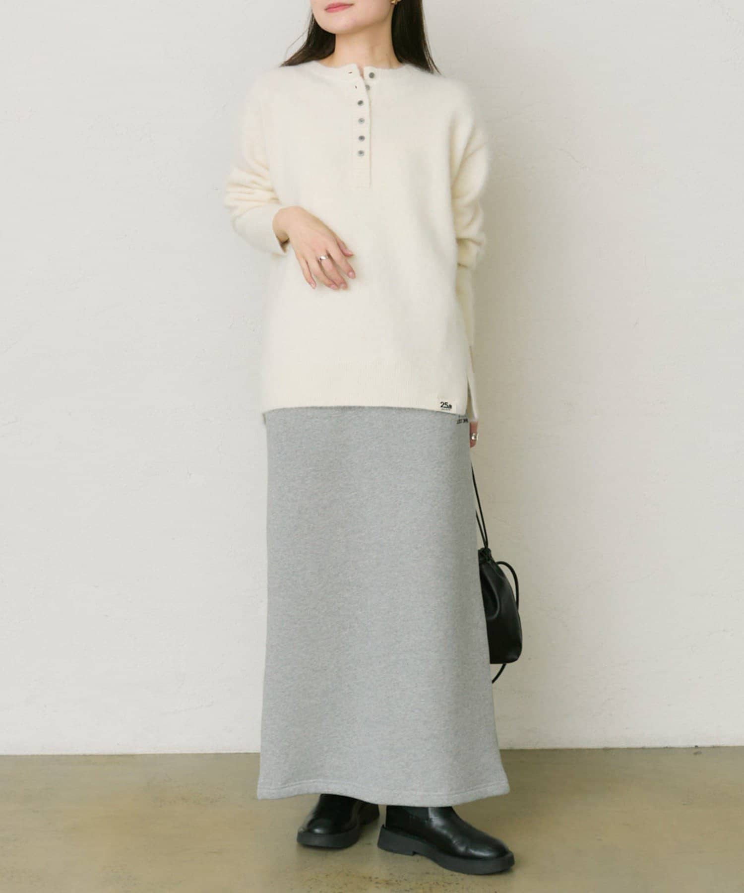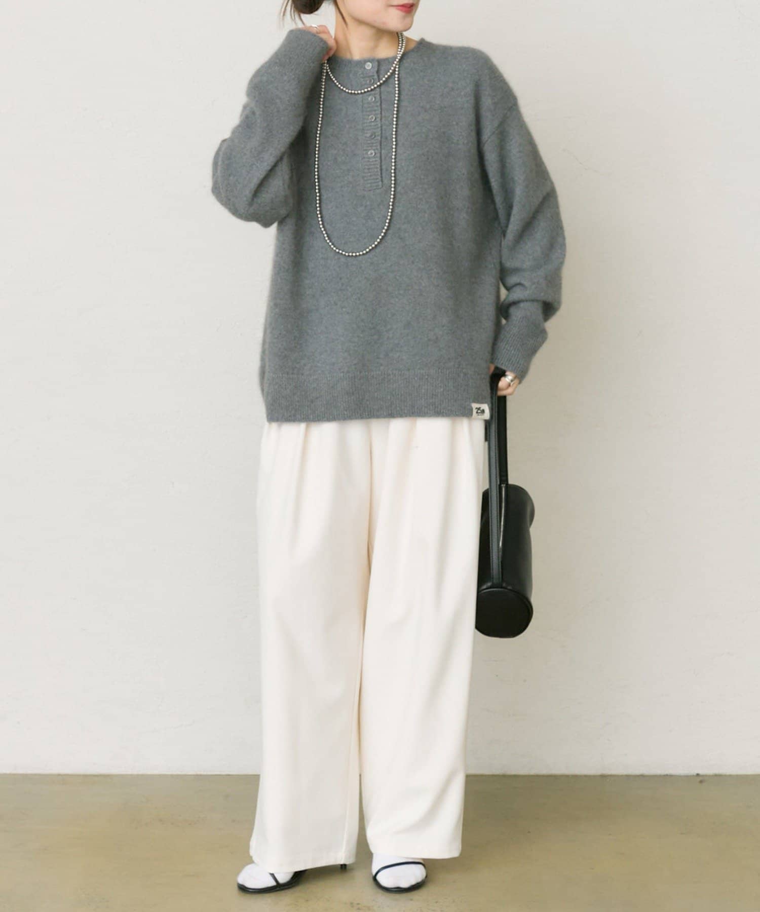 首元にアクセントが加えるヘンリーネックが程よい抜け感を生み、大人っぽさと洒落感を両立。