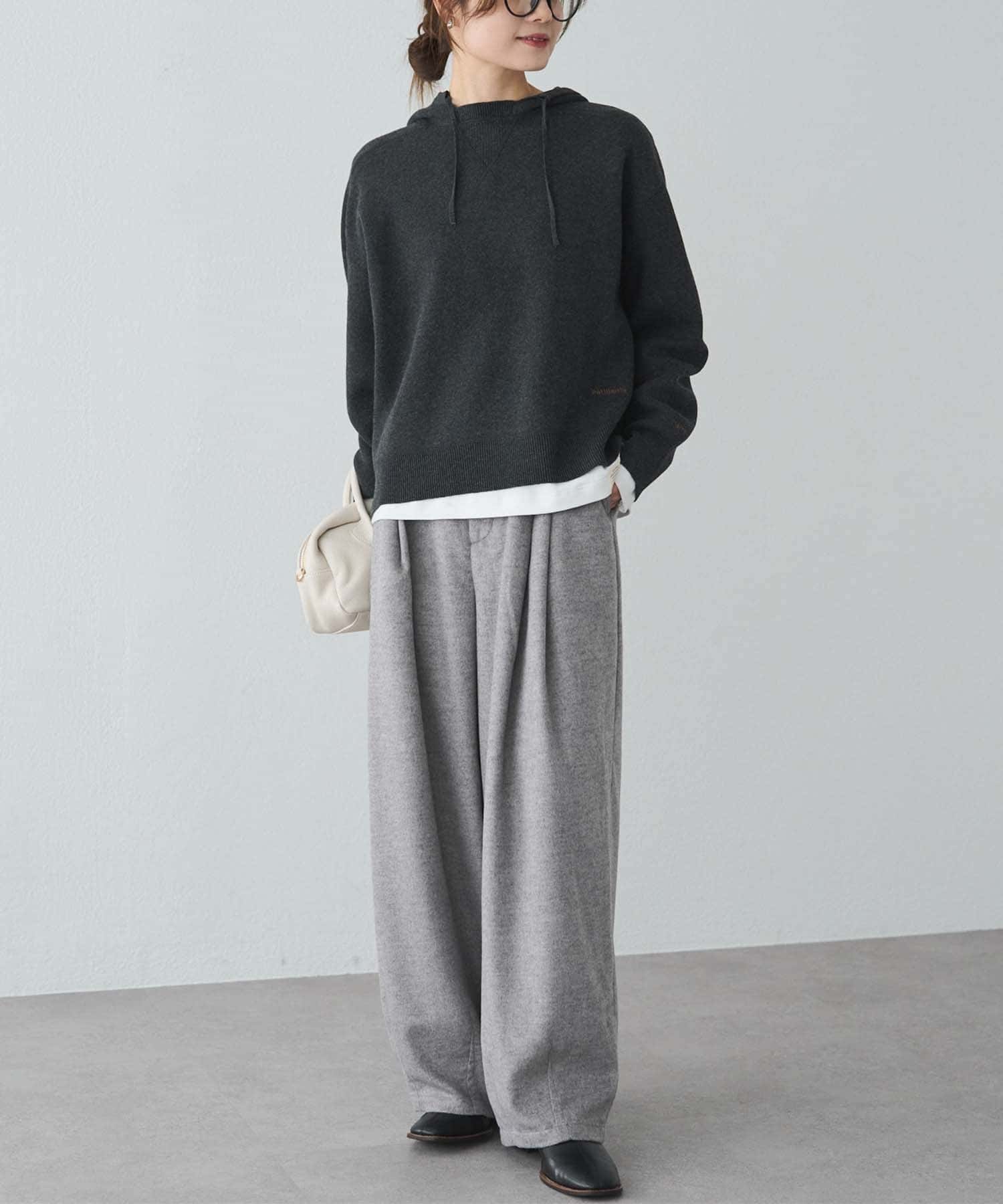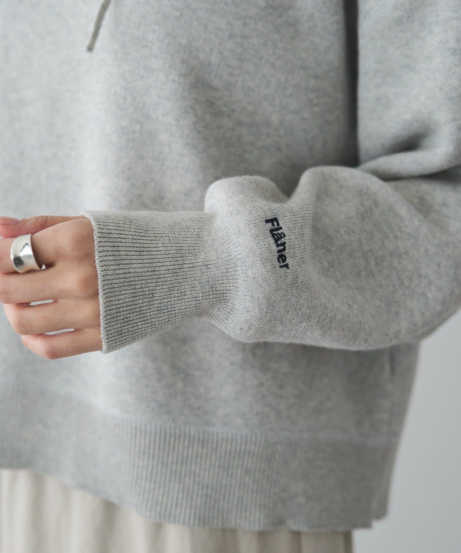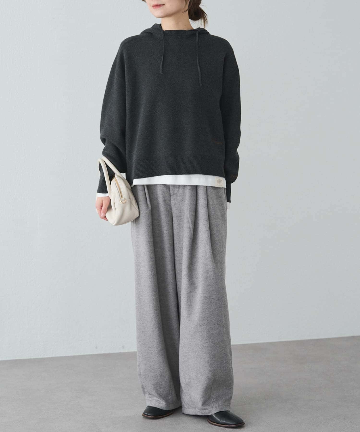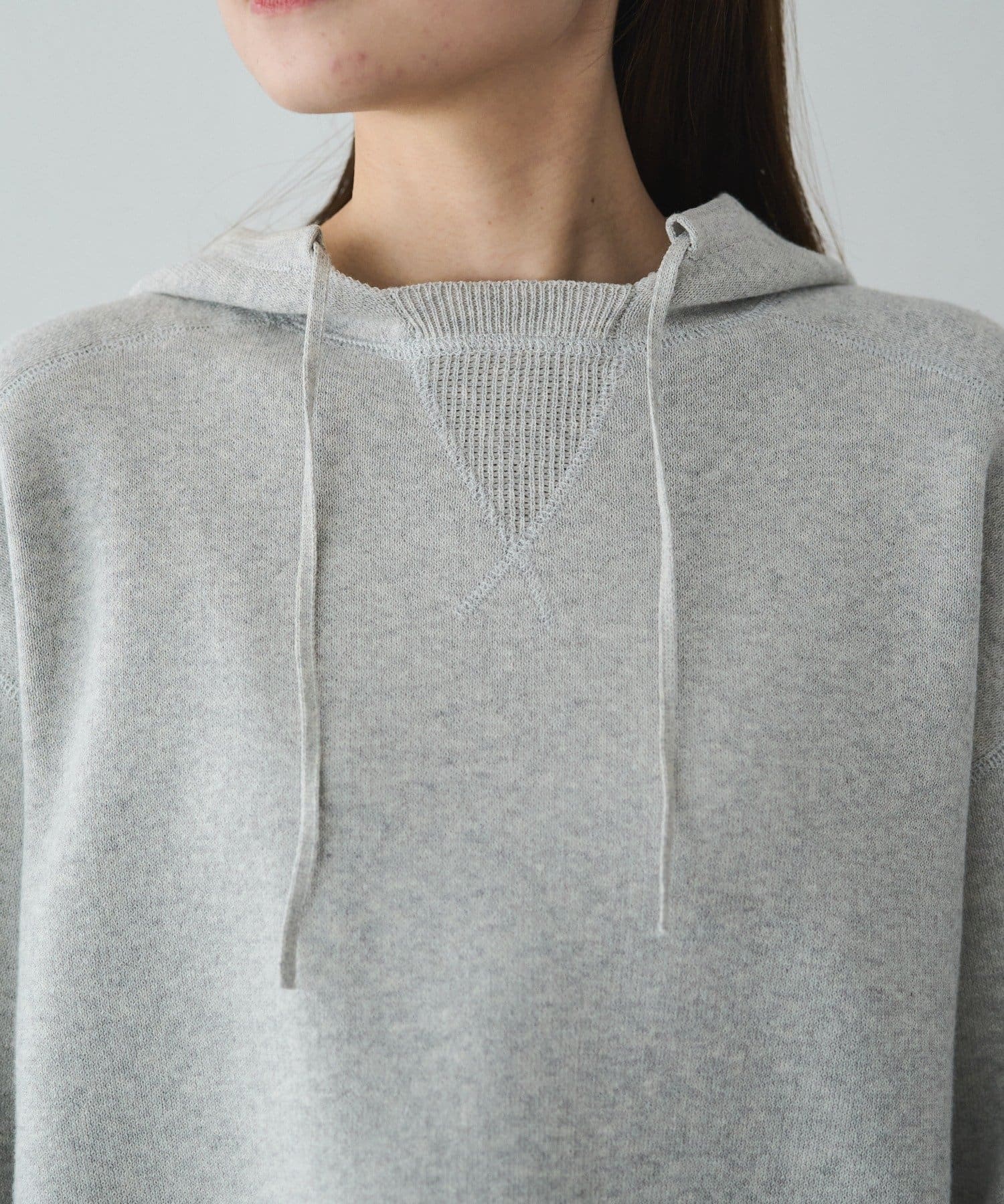 カジュアルになりすぎない上品なプルオーバーのニットパーカー。