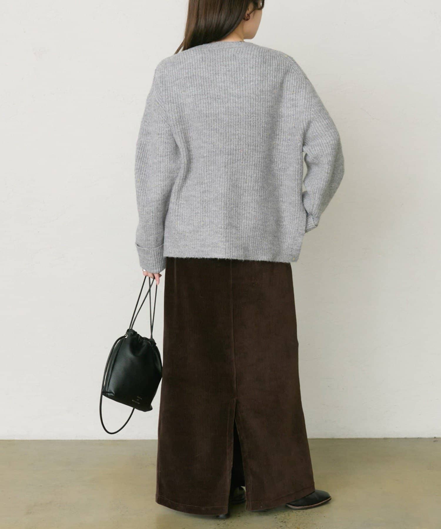 着丈に前後差があるので、女性らしいロングスカートとのスタイリングもスッキリと合わせていただけます。