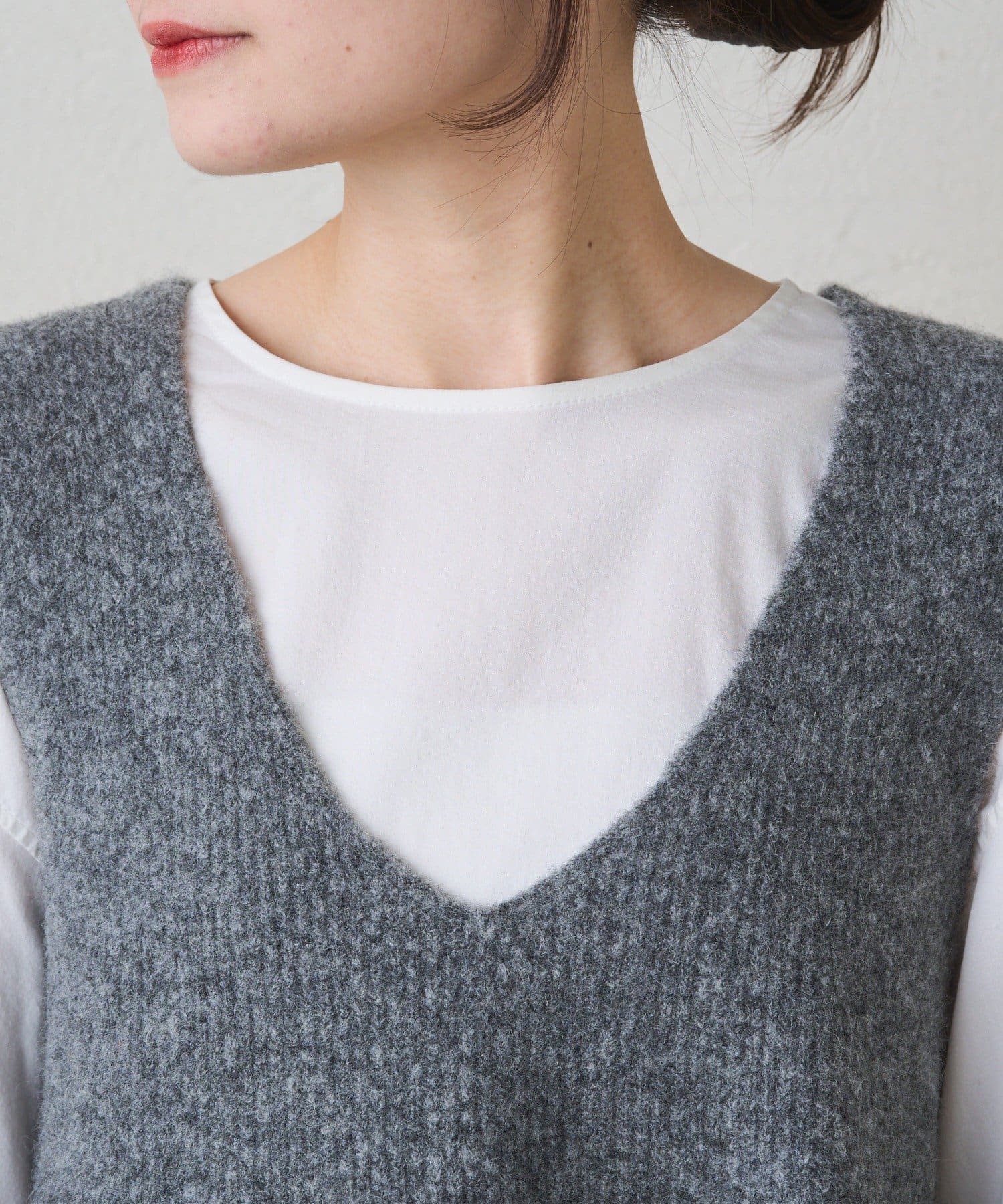 緩やかなV字のネックラインは、シャープな印象とリラックス感を併せ持ち