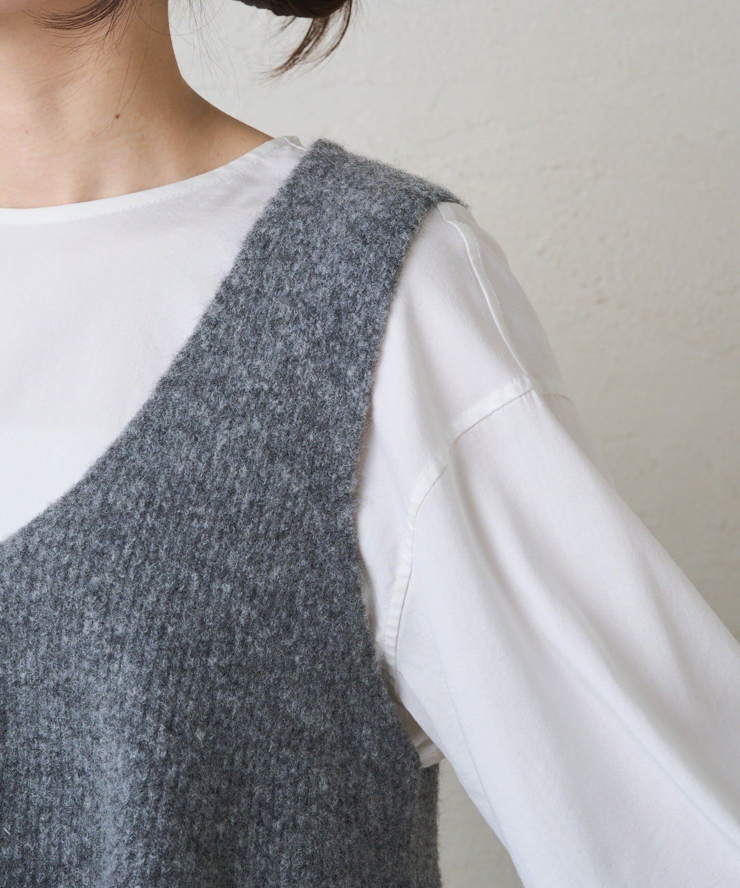 軽く起毛したニット素材が、冬コーデに温かみをプラスするニットビスチェ。