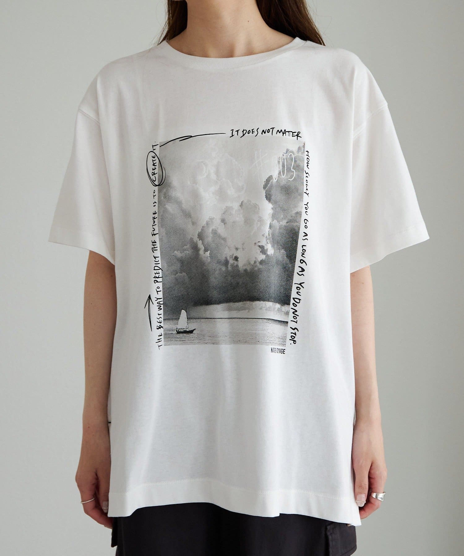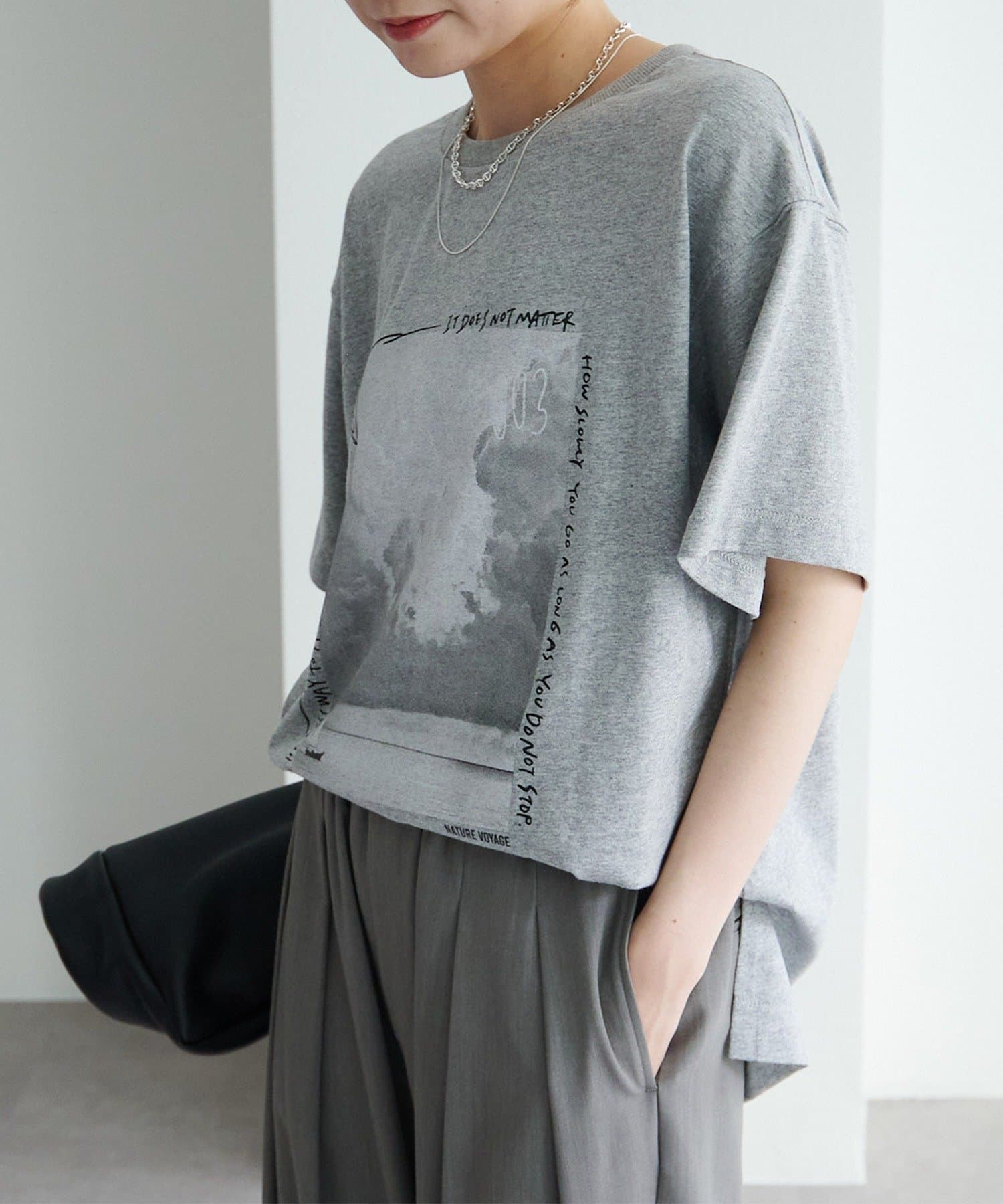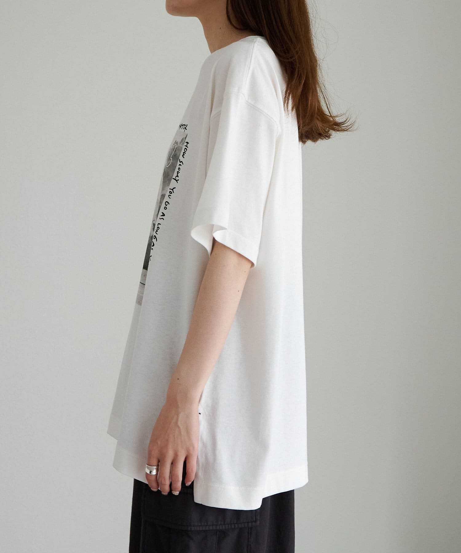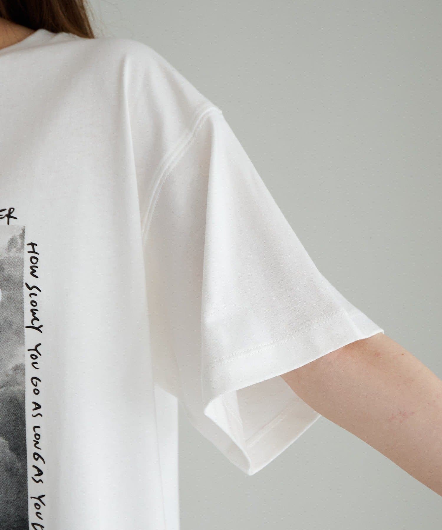 縦長のフォトを採用することでやたオーバーサイズシルエットのTシャツに、縦ラインが生まれすっきりとした印象に。