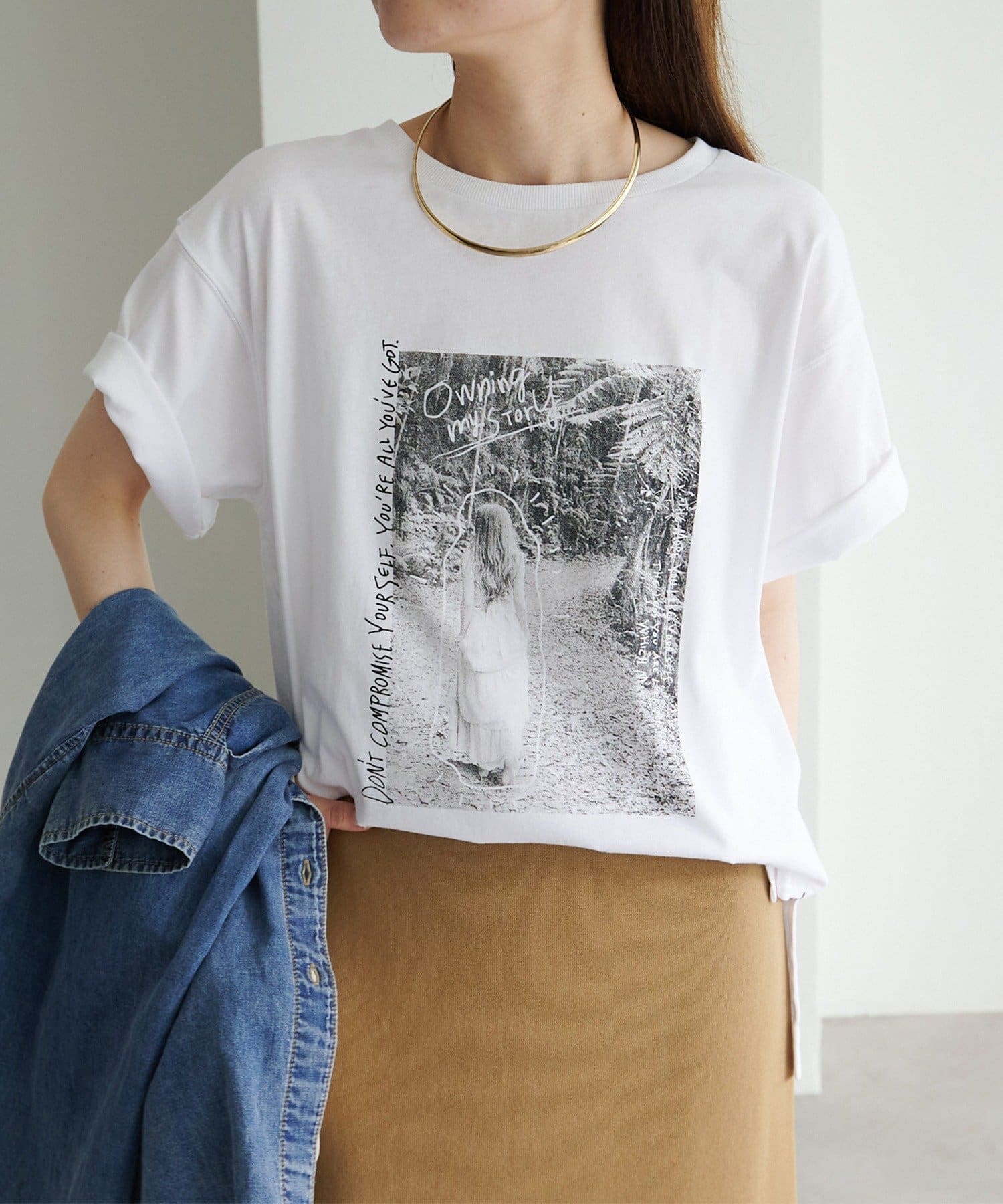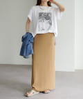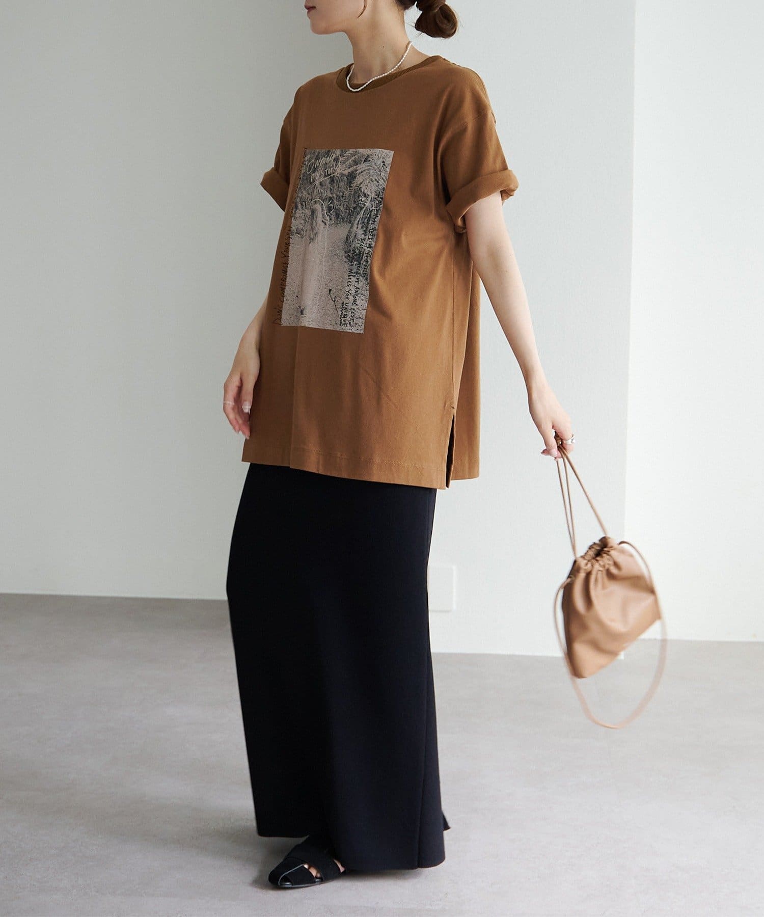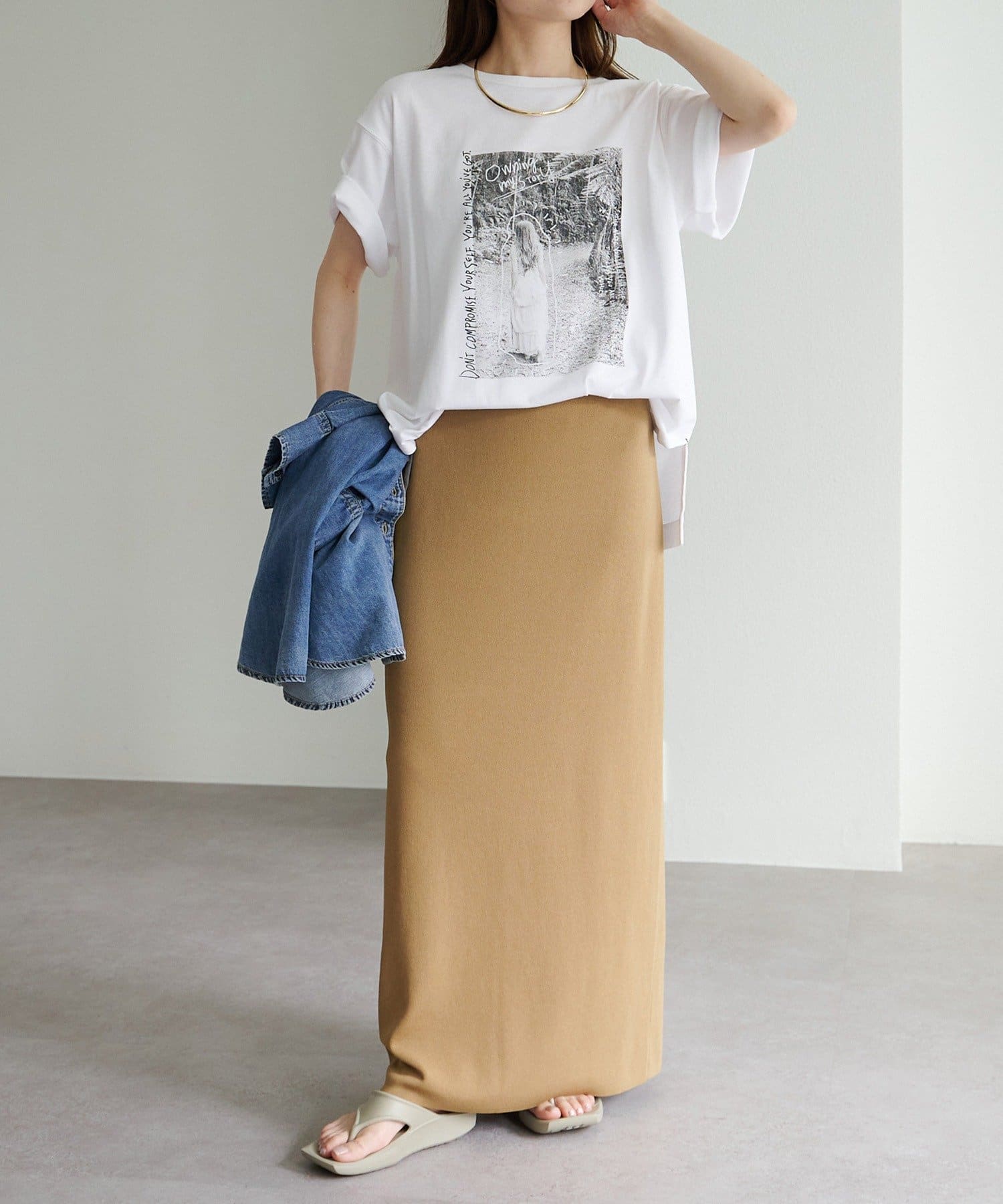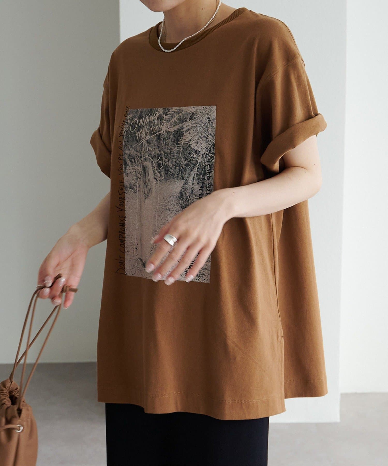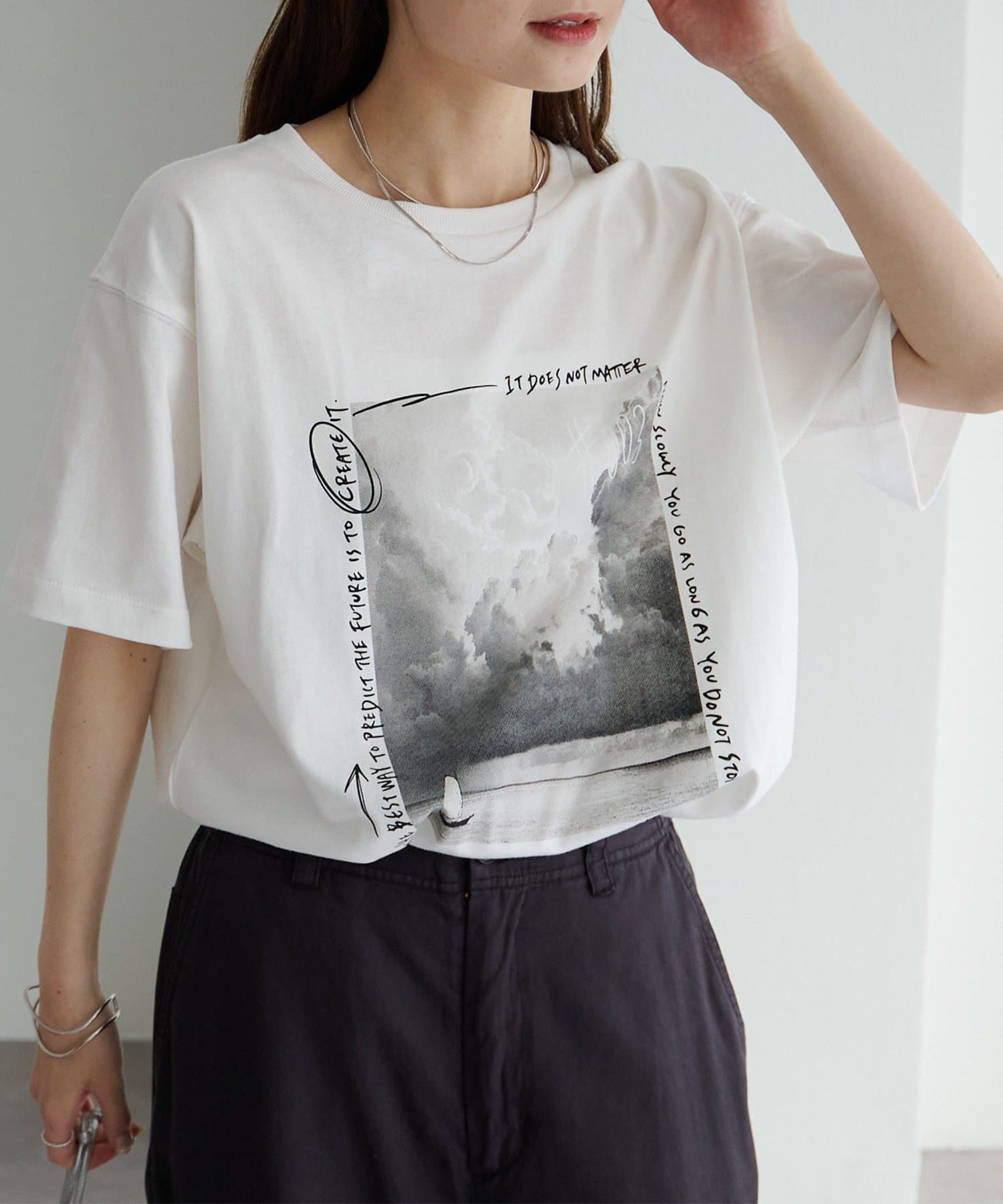 縦長のフォトを採用することでやたオーバーサイズシルエットのTシャツに、縦ラインが生まれすっきりとした印象に。