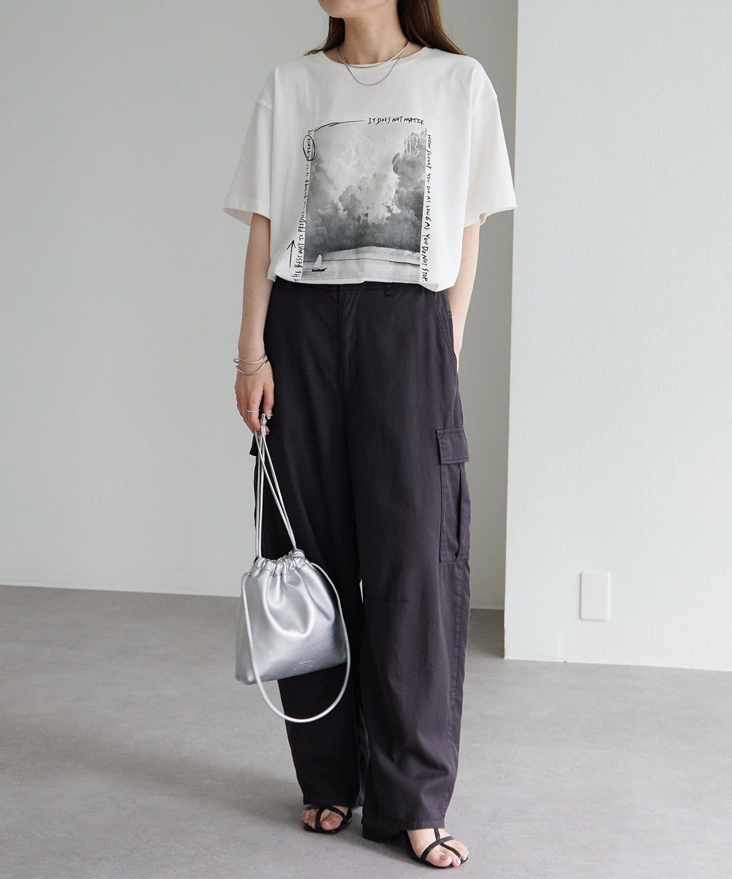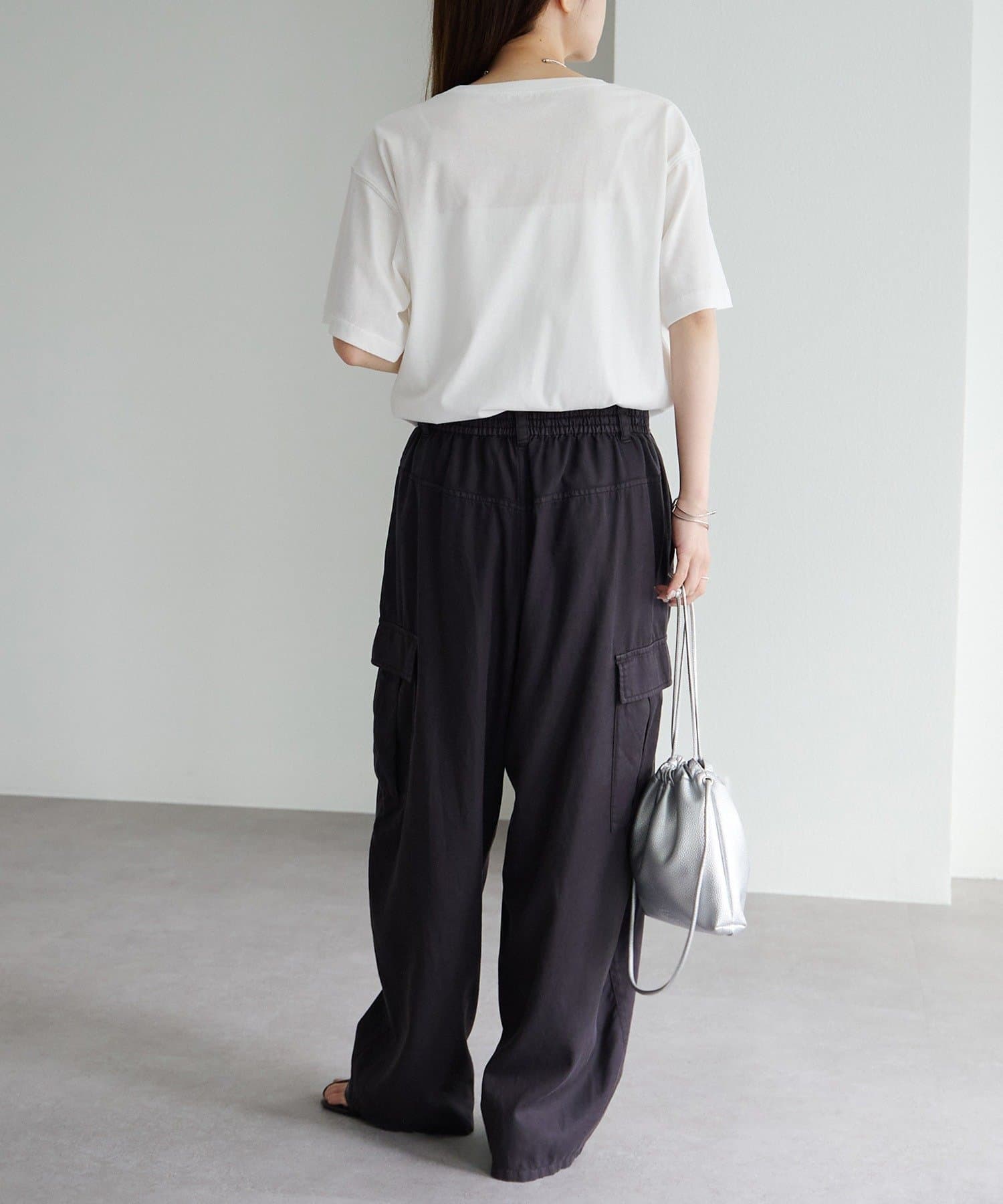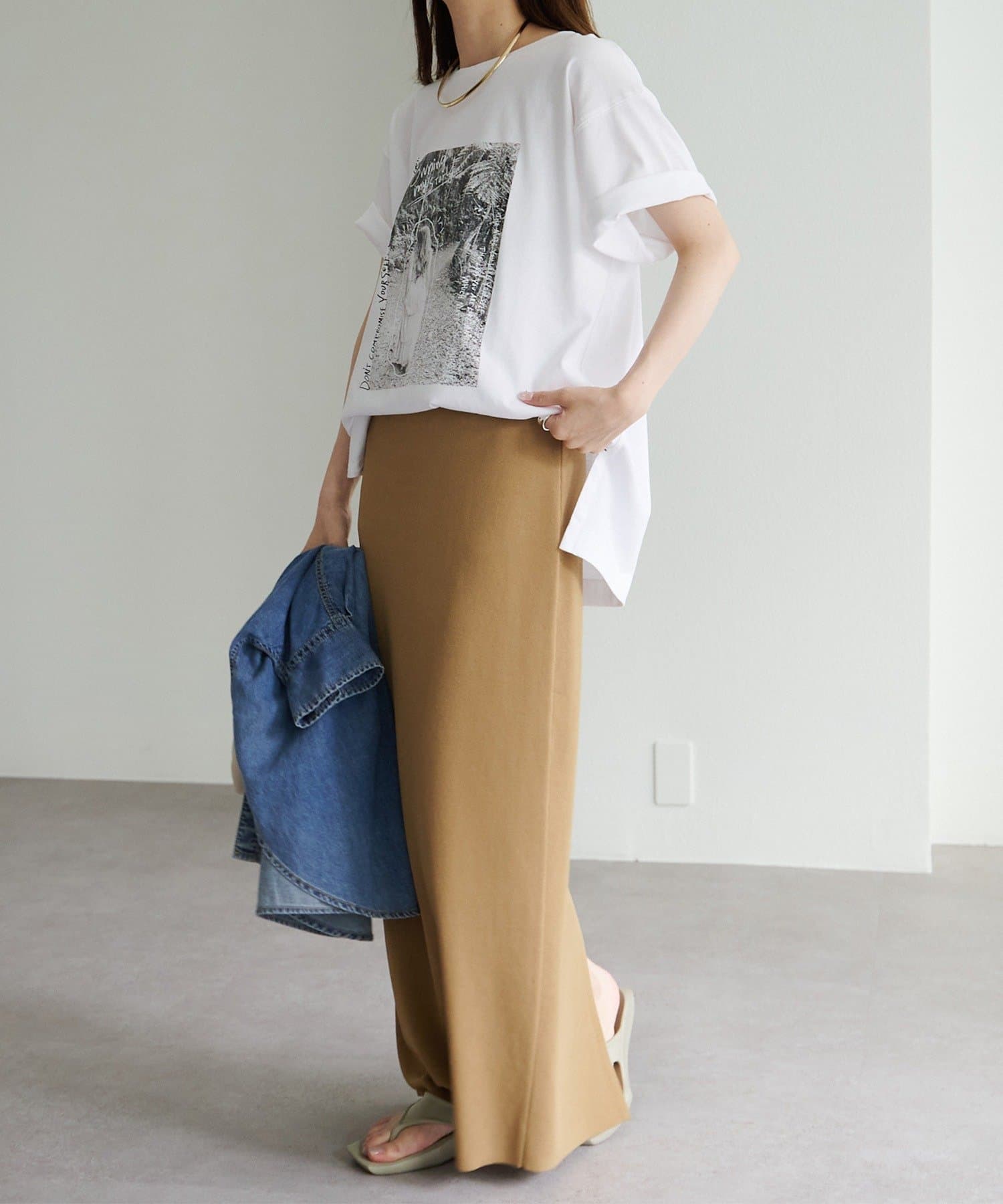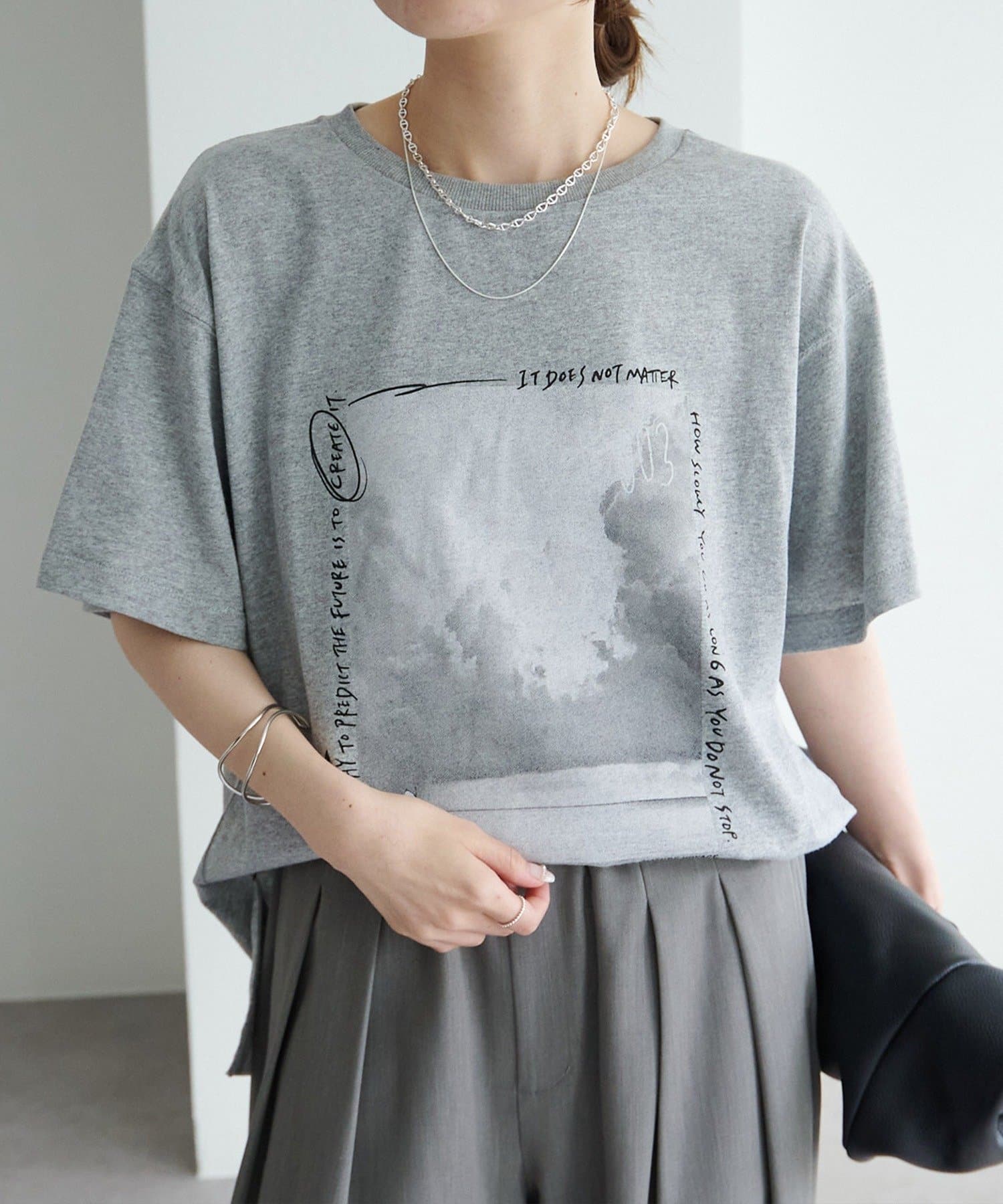 縦長のフォトを採用することでやたオーバーサイズシルエットのTシャツに、縦ラインが生まれすっきりとした印象に。