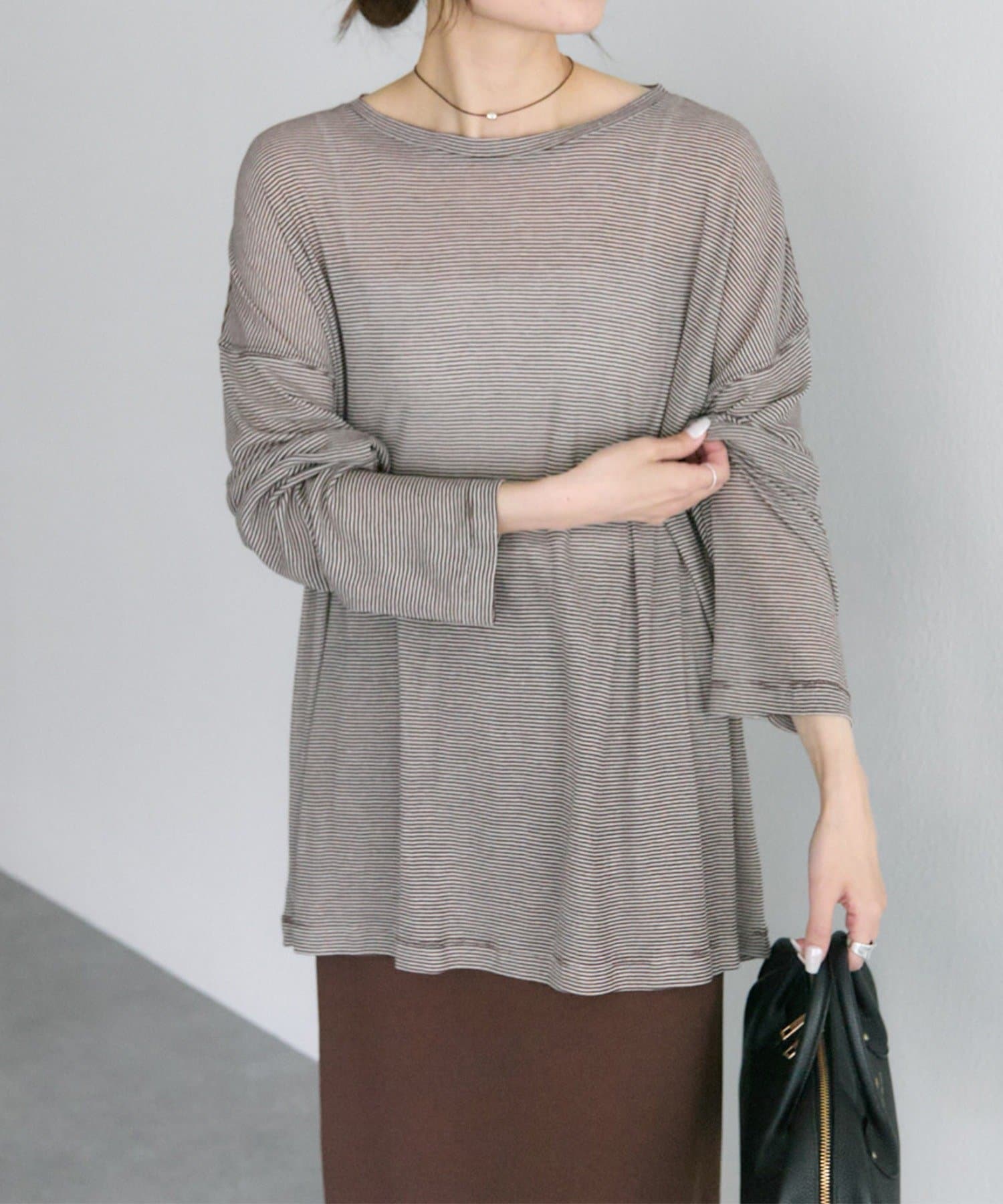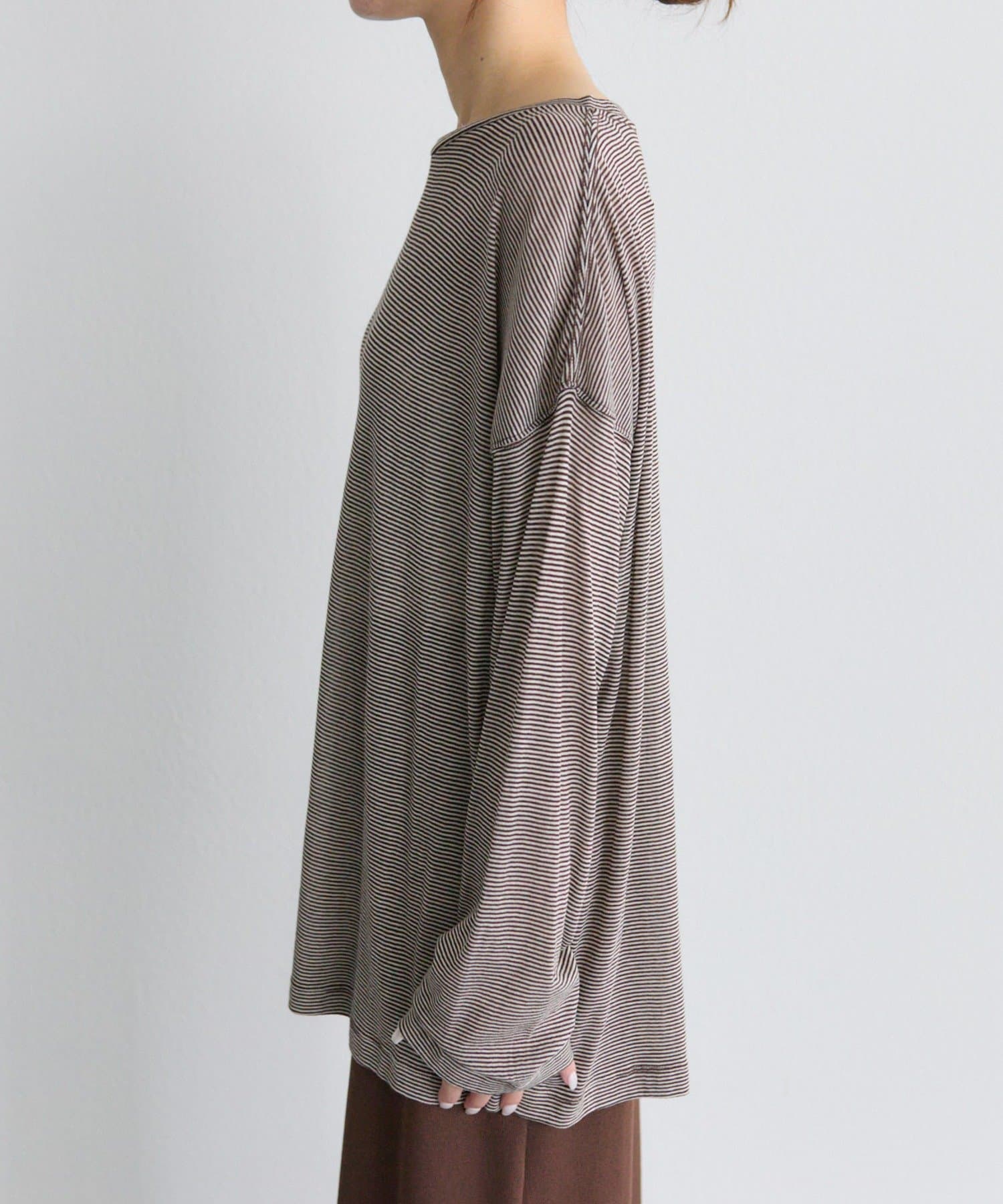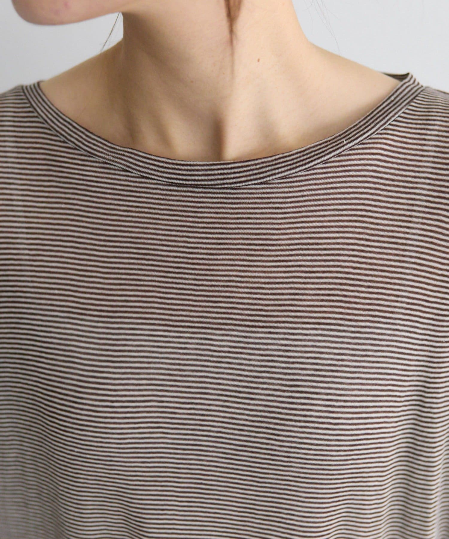 キナリをベースにした細いピッチのミジンボーダーは、カジュアル感を抑え落ち着いた大人な雰囲気に。
