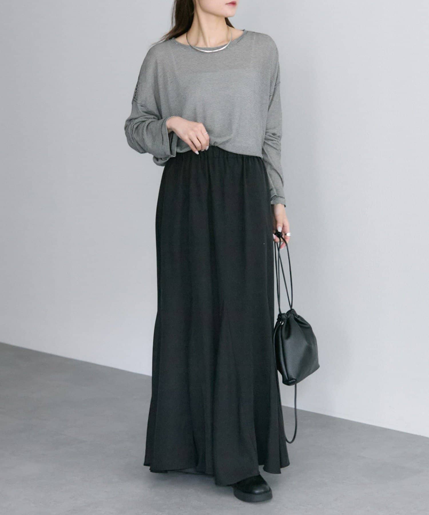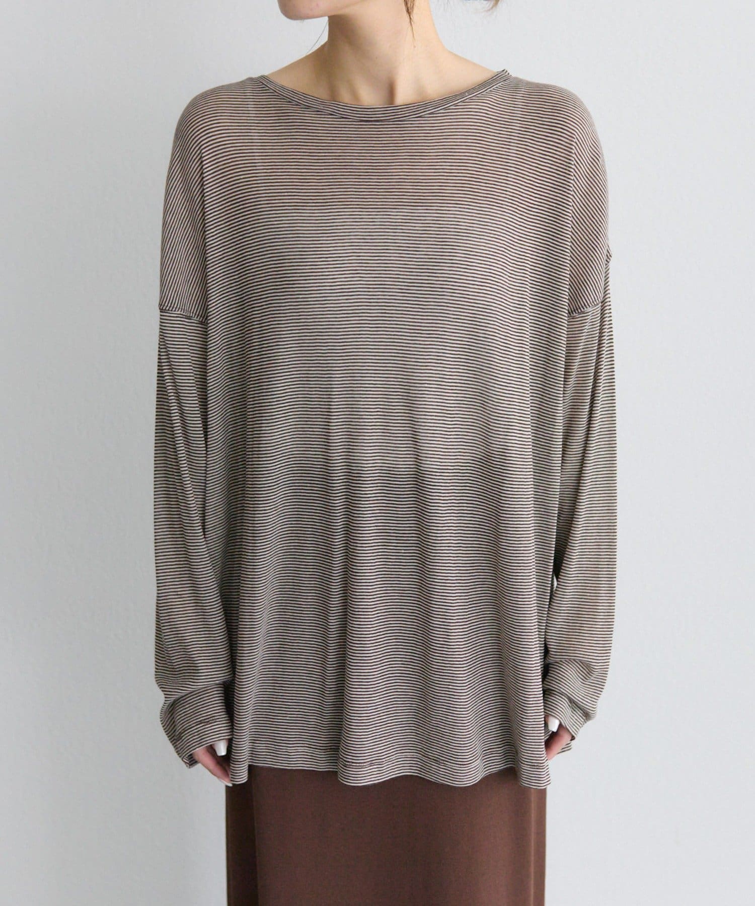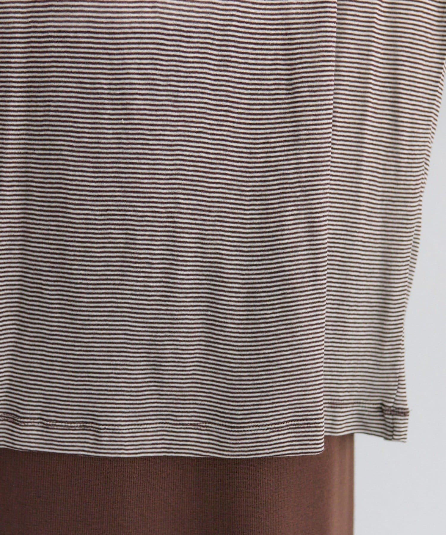 キナリをベースにした細いピッチのミジンボーダーは、カジュアル感を抑え落ち着いた大人な雰囲気に。