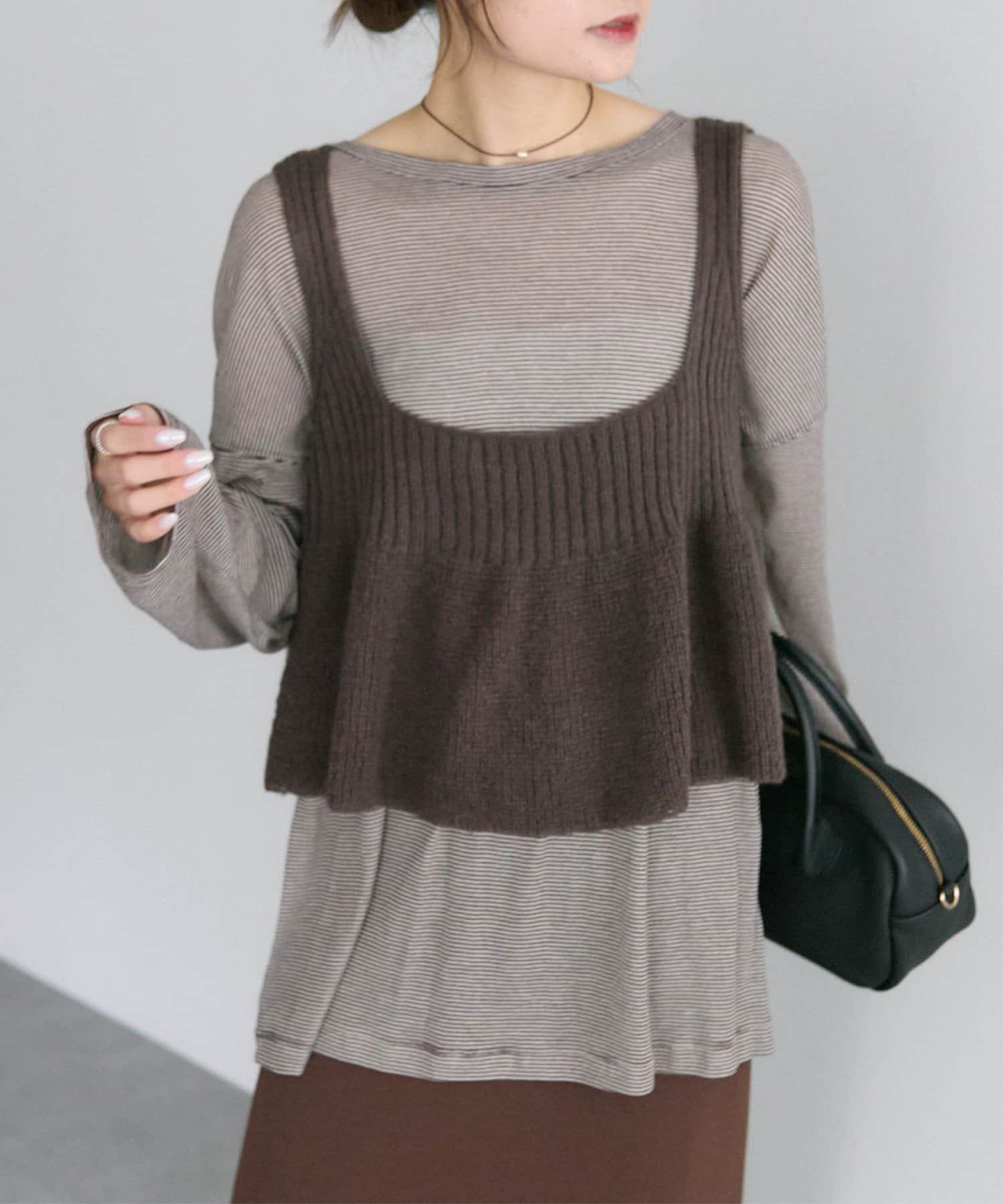シンプルなビスチェやニットベスト、キャミワンピースやサロペットへのインナー使いも、柄がアクセントになりオススメです。