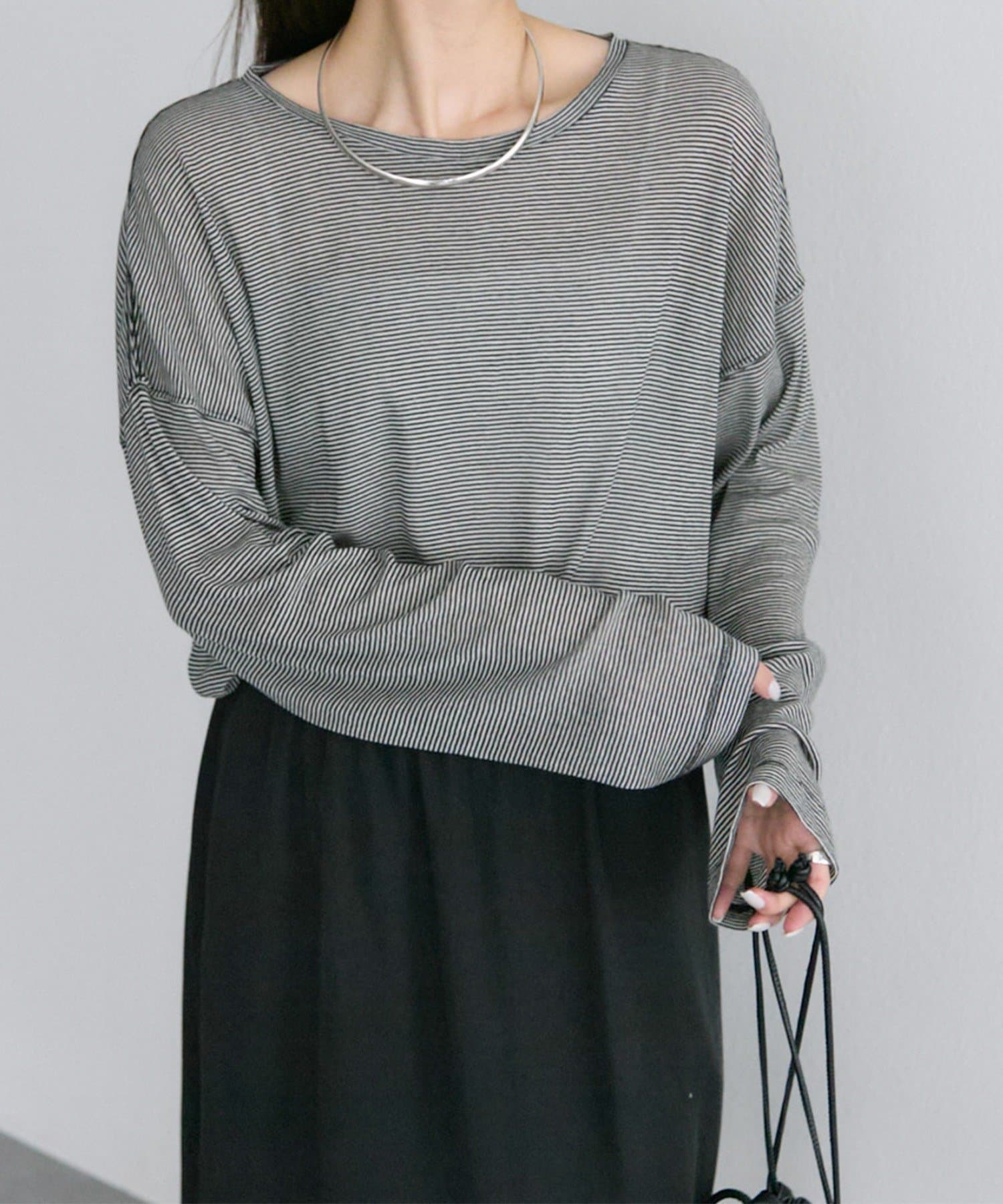 無地感覚で取り入れやすい細かいボーダーで、さり気なくトレンドを纏うことができるカットソーです。
