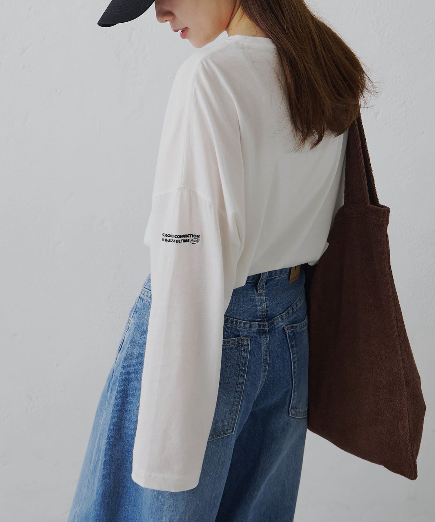 シャツやサロペットのインナーとして、ロゴをチラ見せするレイヤードスタイルもこなれ感ある装いに。
