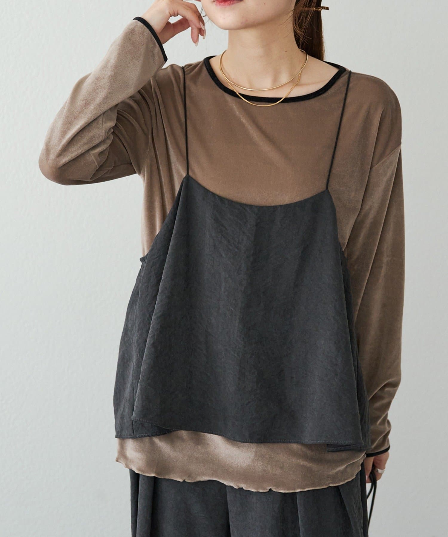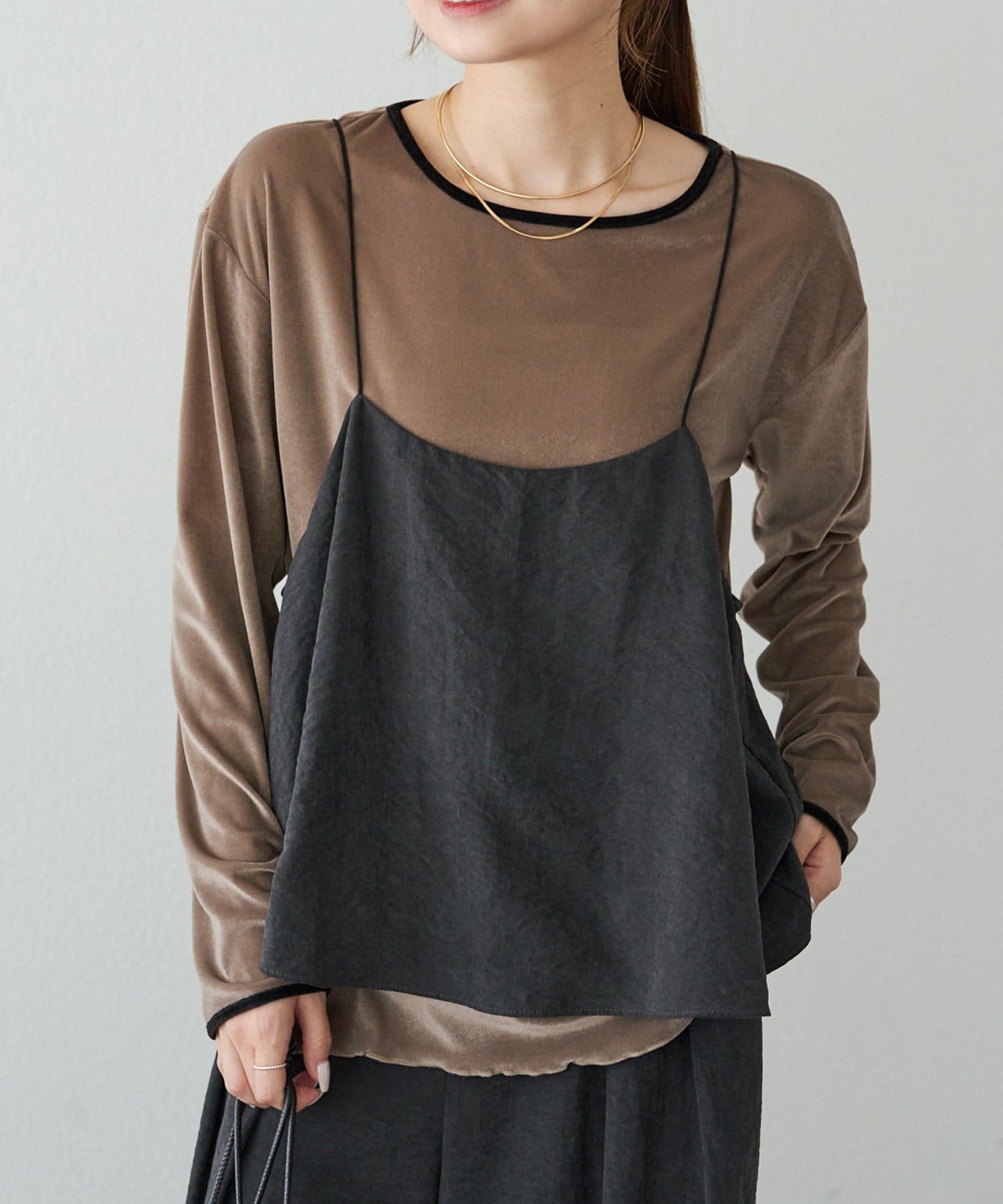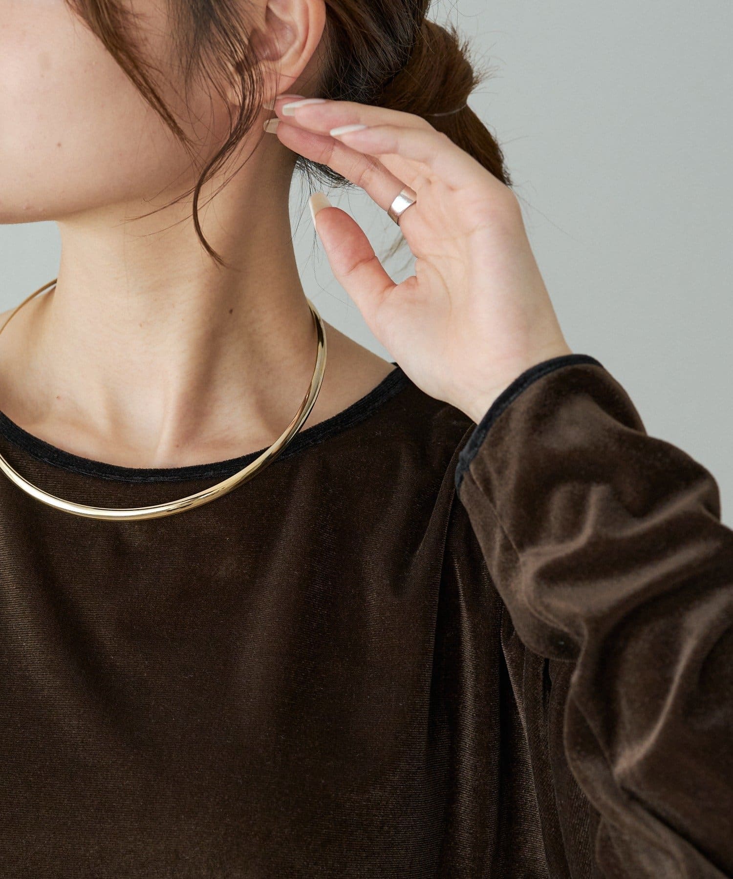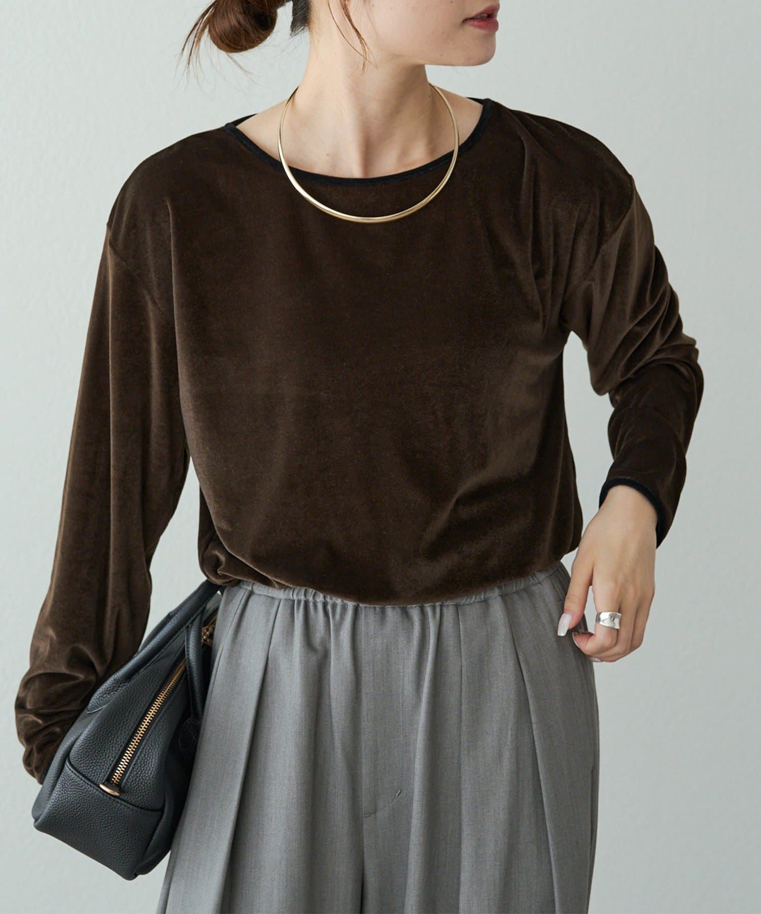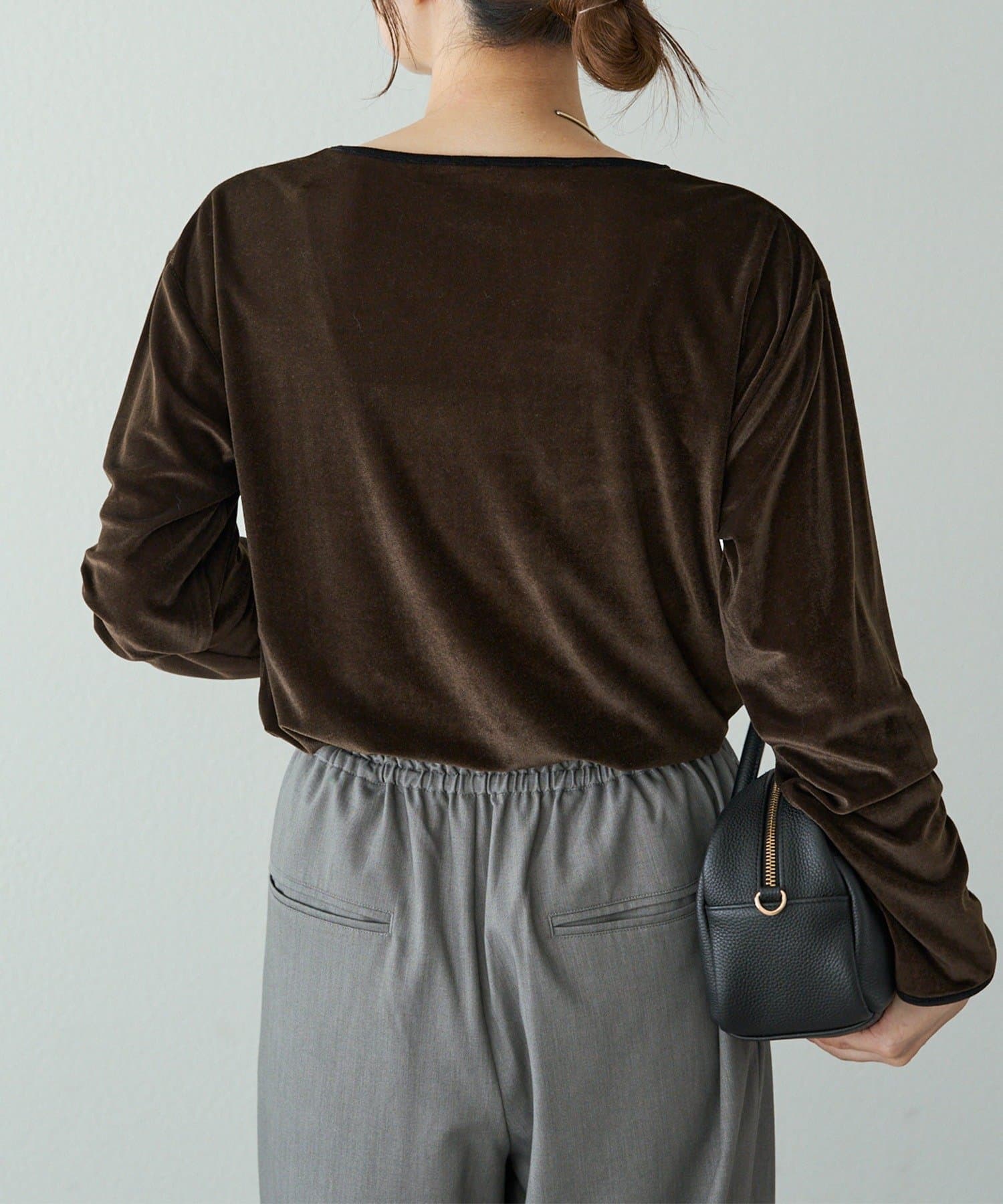 素肌がほんのり透けながらも、温かみを感じるベロアを使用したカットソー。