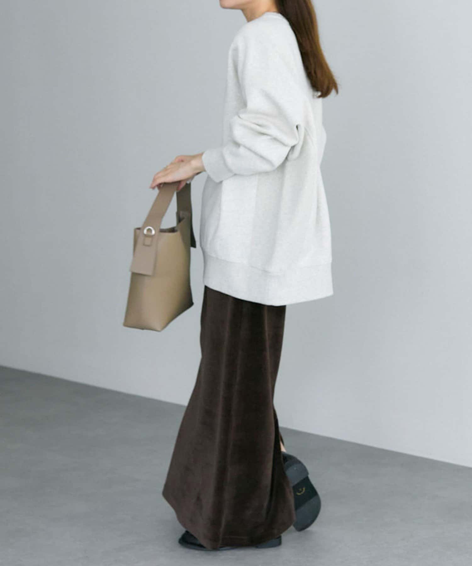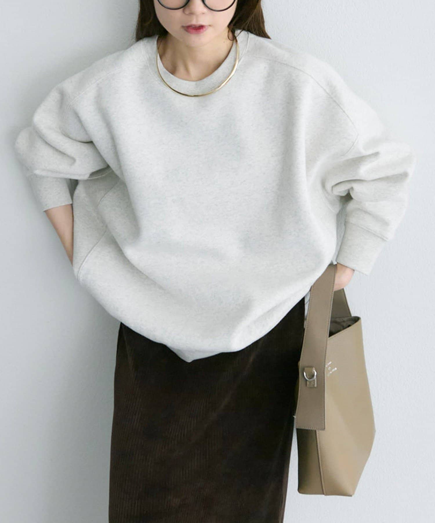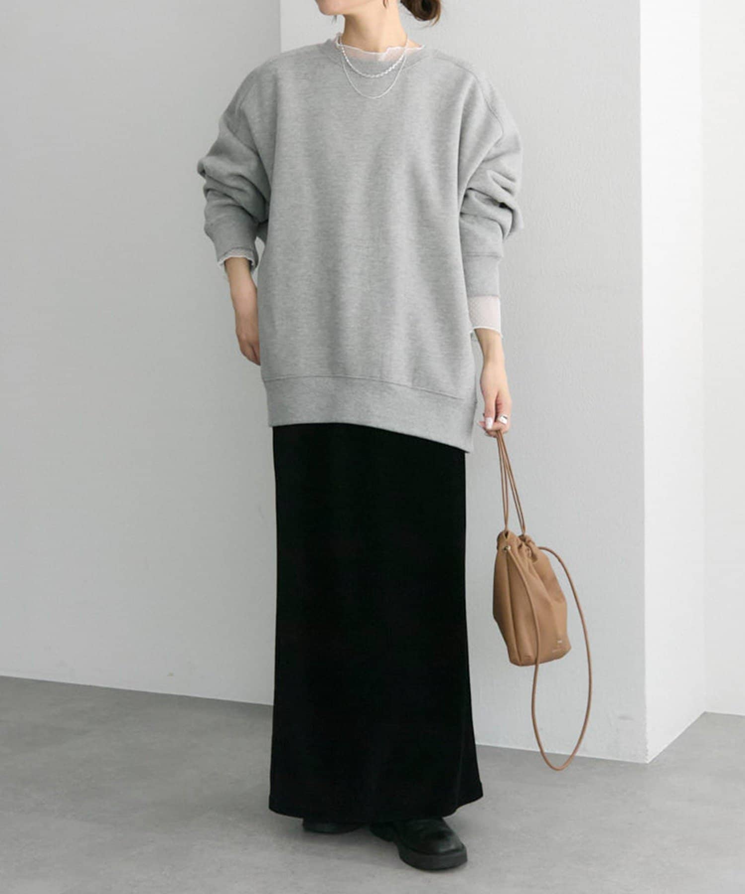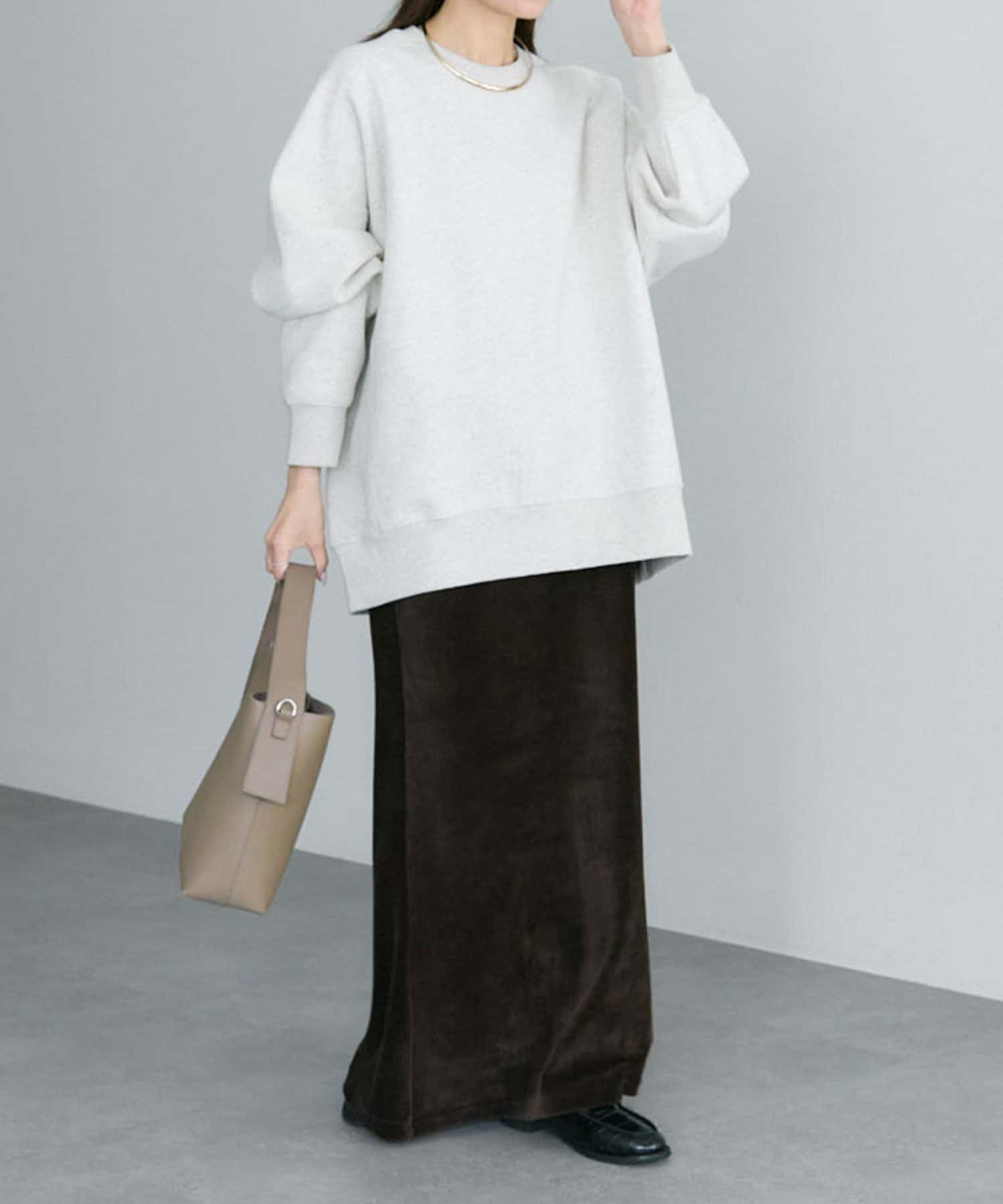 キレイ見えするナロースカートやスラックス合わせで、カジュアルなスウェットのコーディネートも女性らしい仕上がりに。