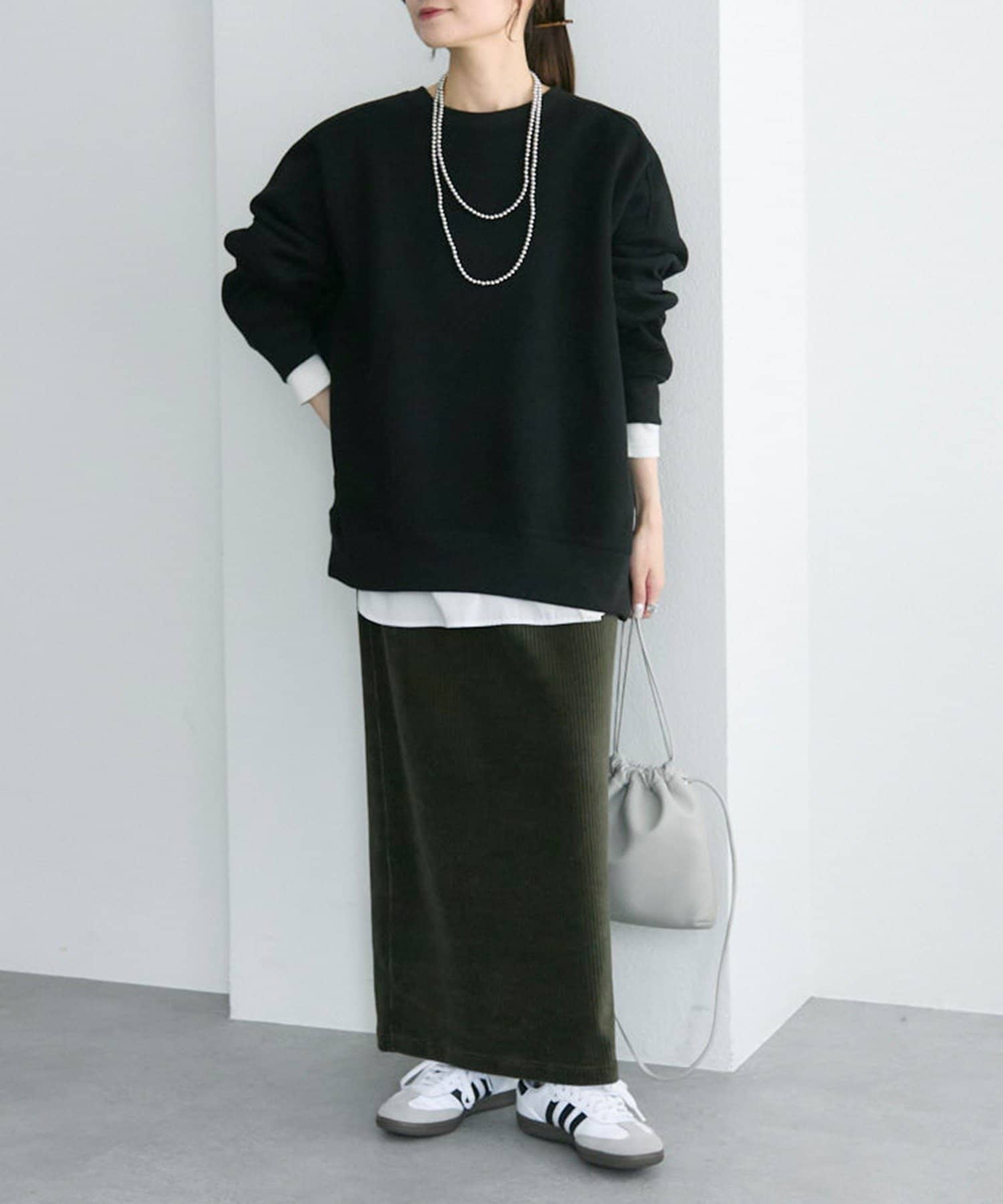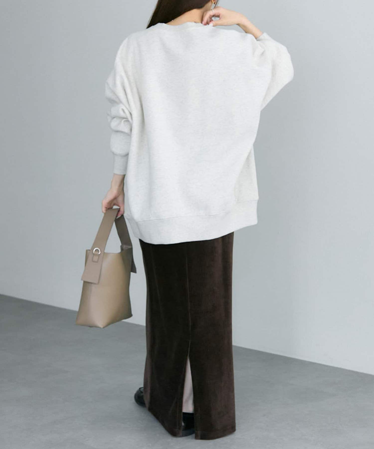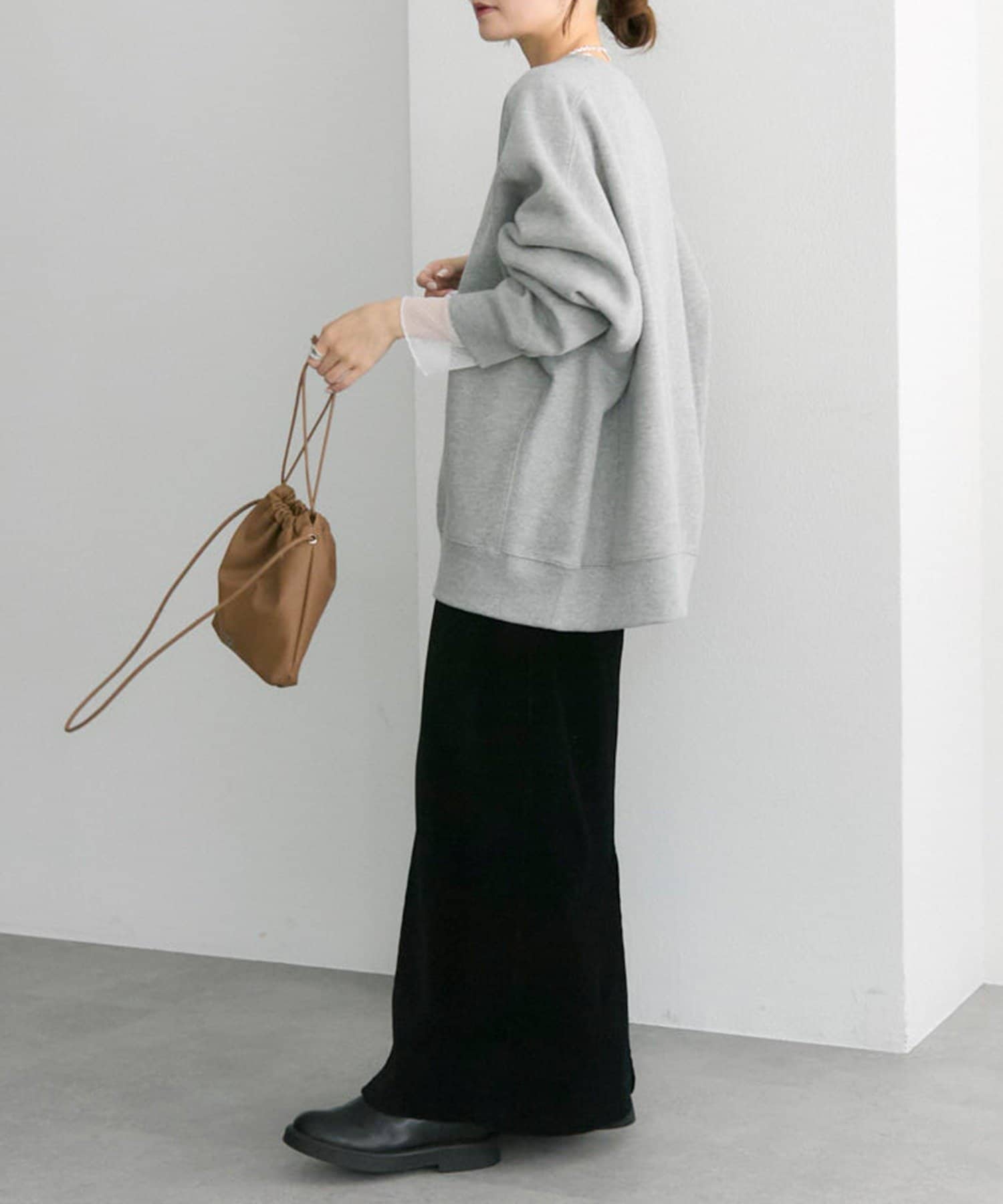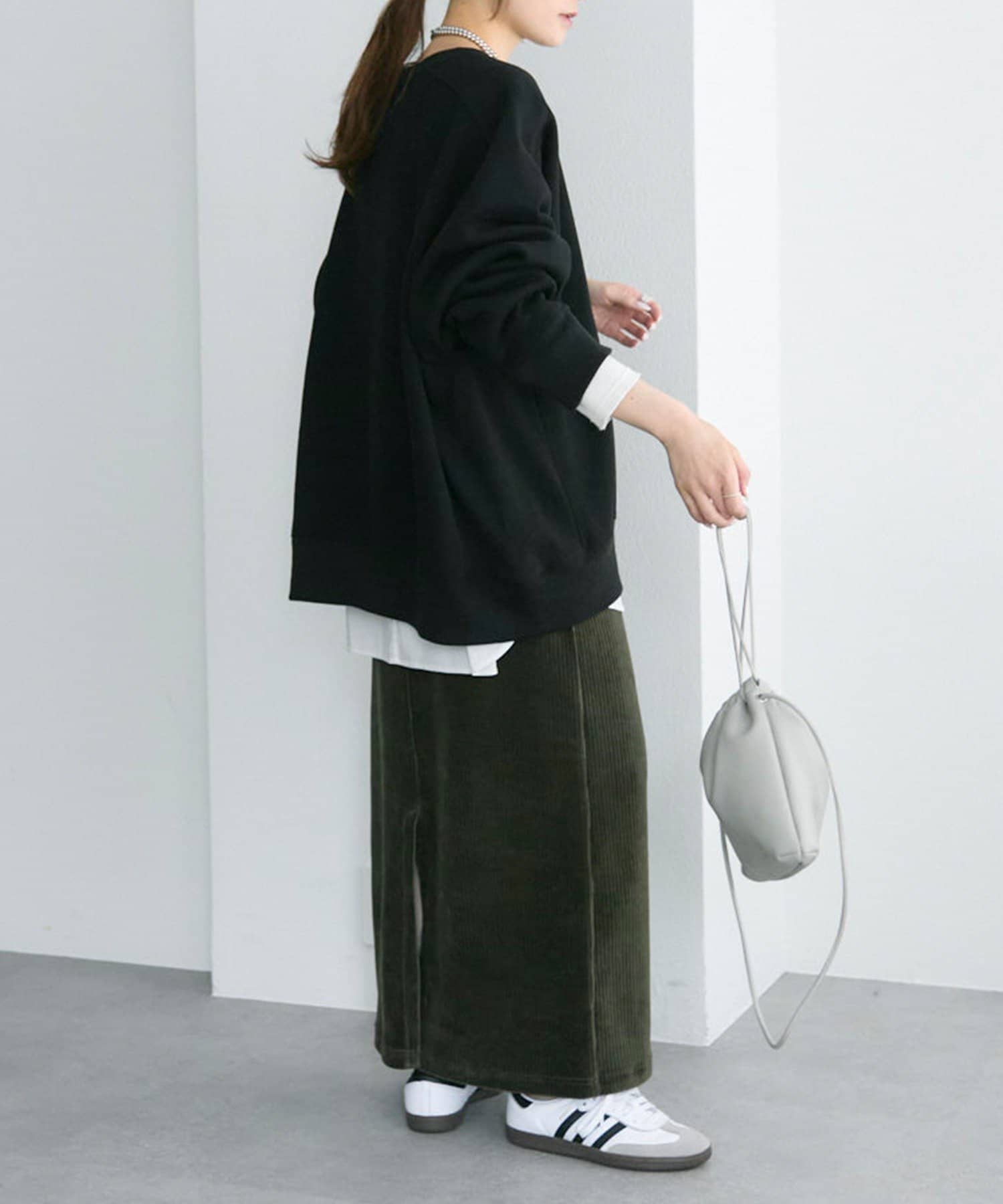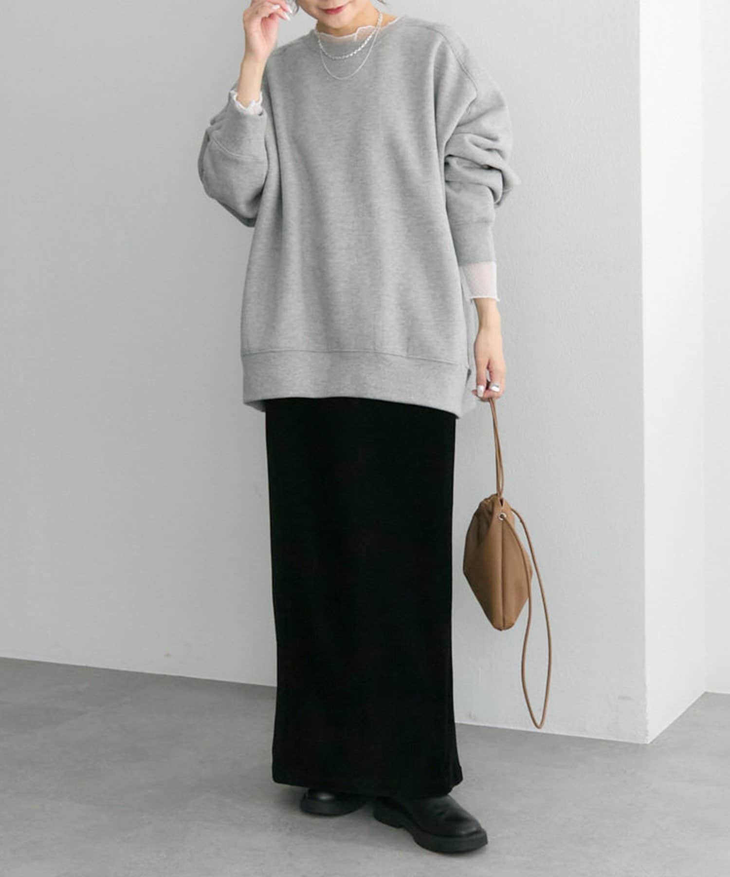 キレイ見えするナロースカートやスラックス合わせで、カジュアルなスウェットのコーディネートも女性らしい仕上がりに。