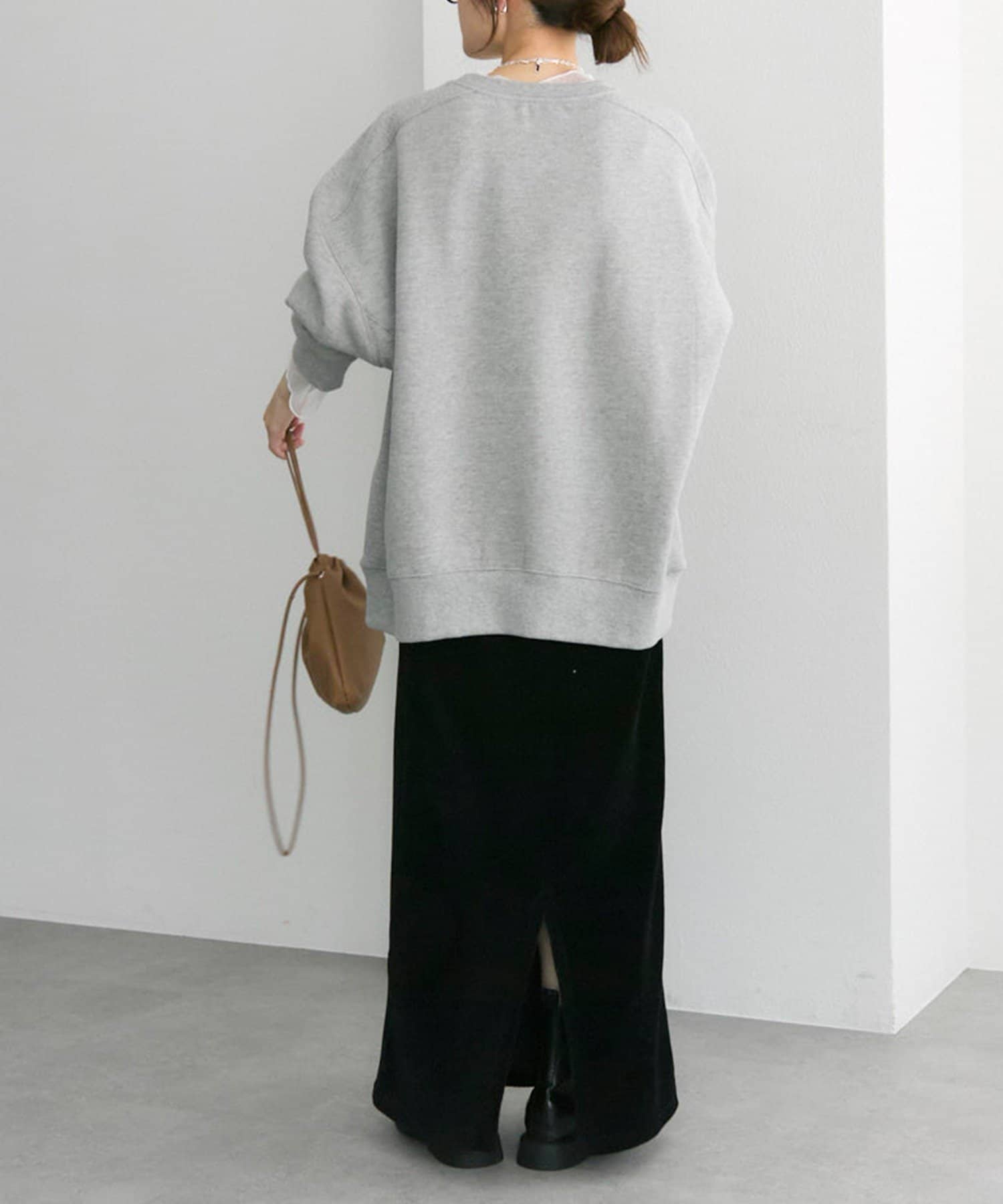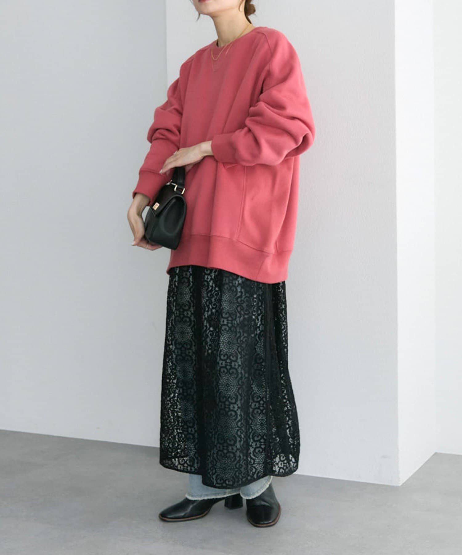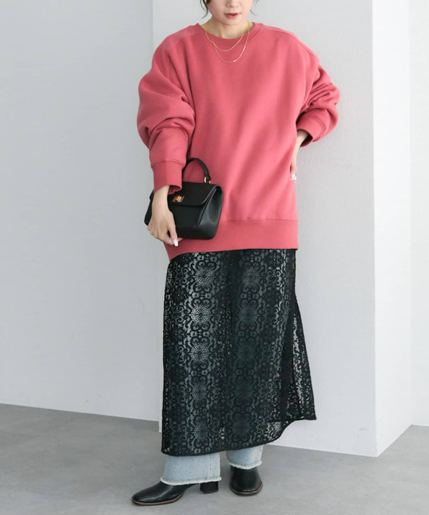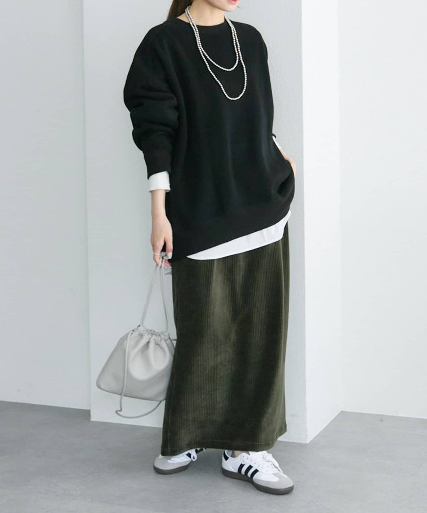 キレイ見えするナロースカートやスラックス合わせで、カジュアルなスウェットのコーディネートも女性らしい仕上がりに。