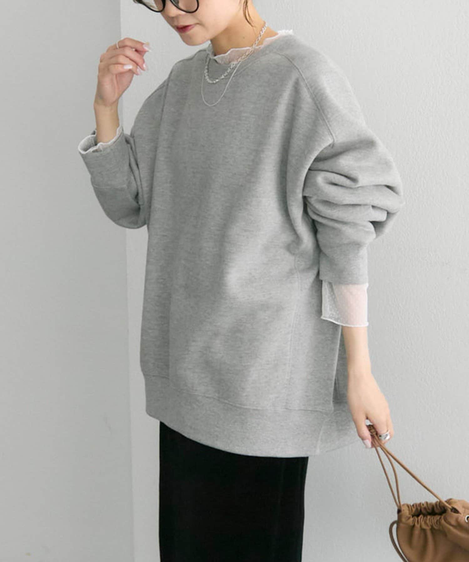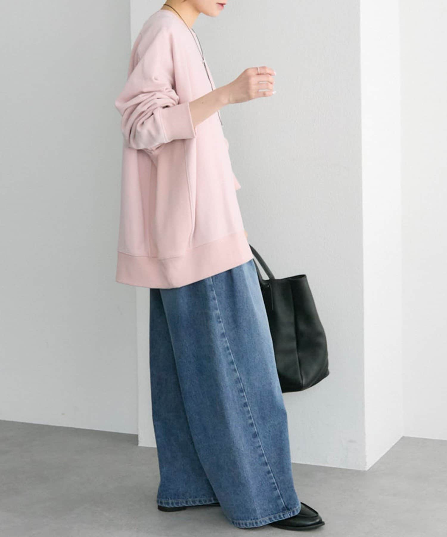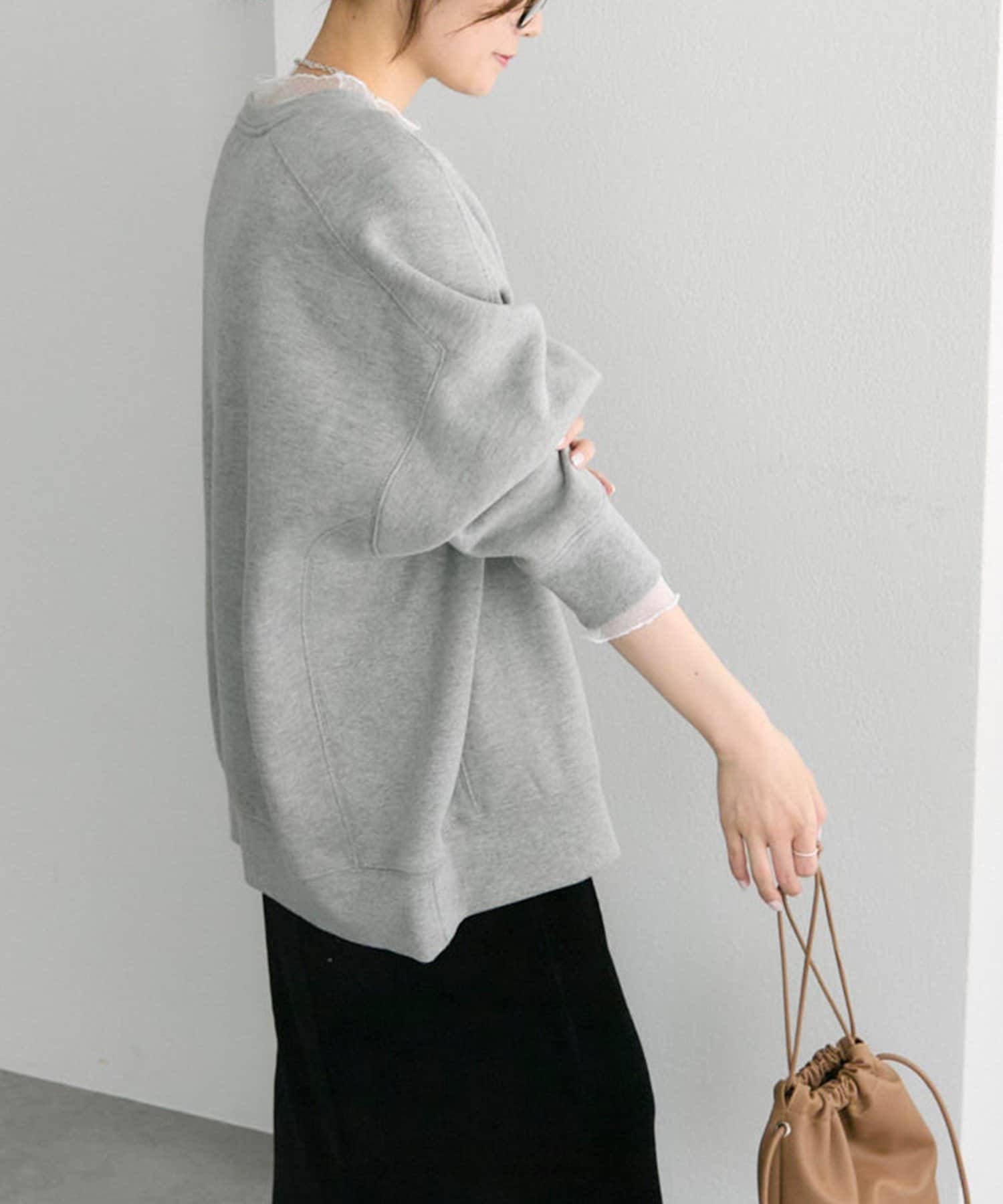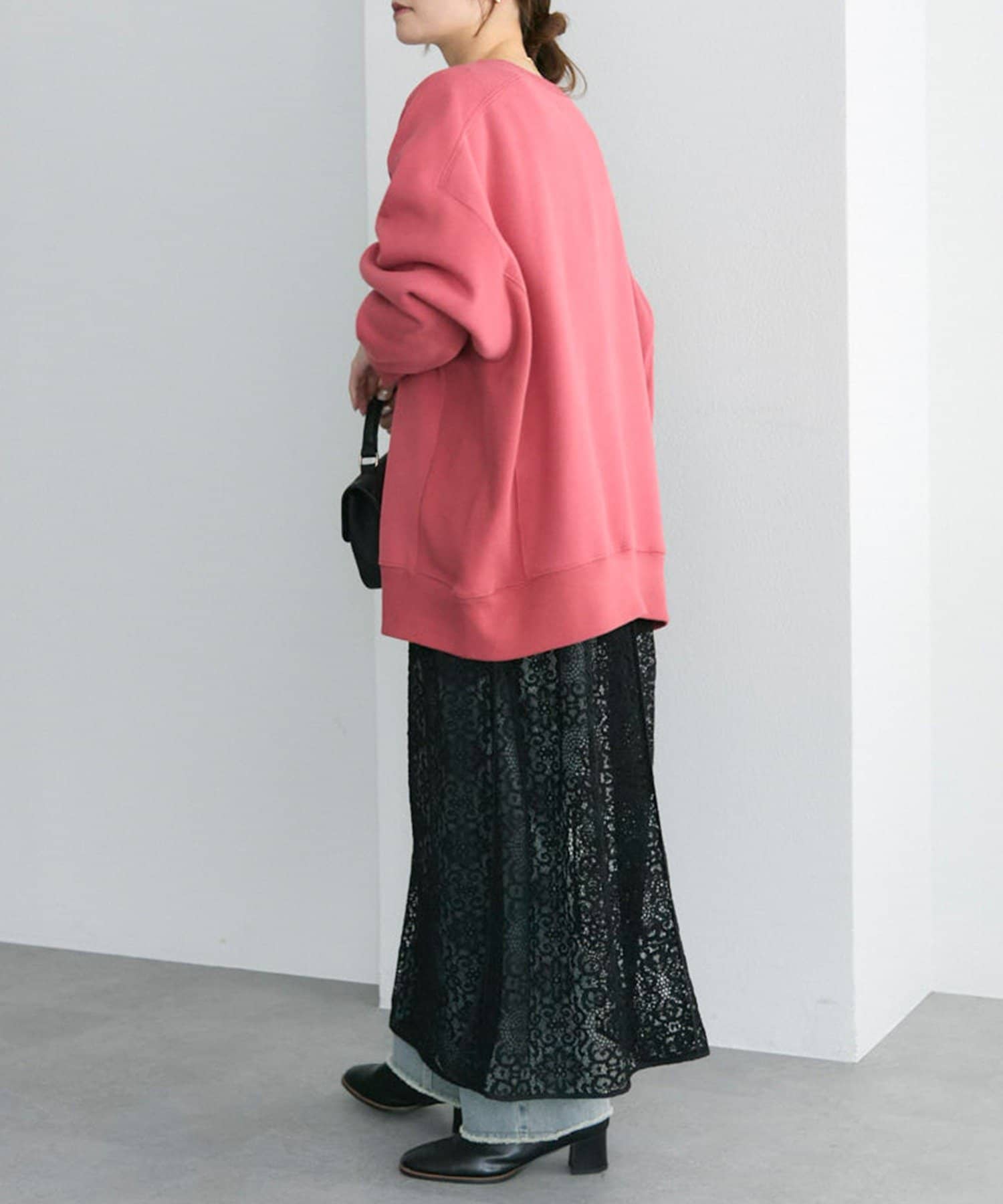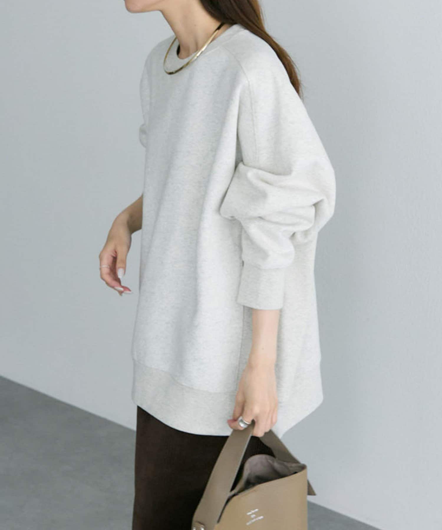 キレイ見えするナロースカートやスラックス合わせで、カジュアルなスウェットのコーディネートも女性らしい仕上がりに。