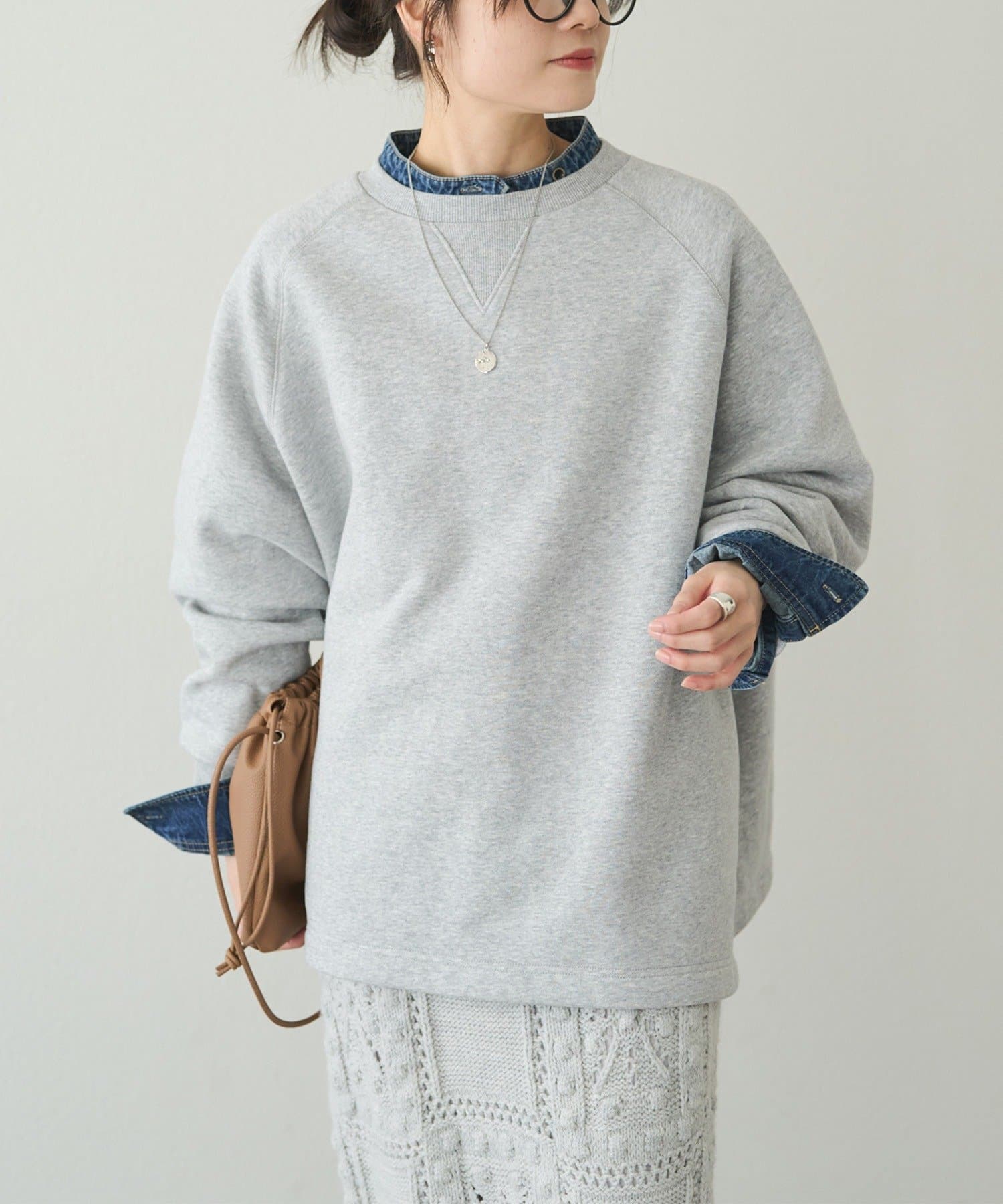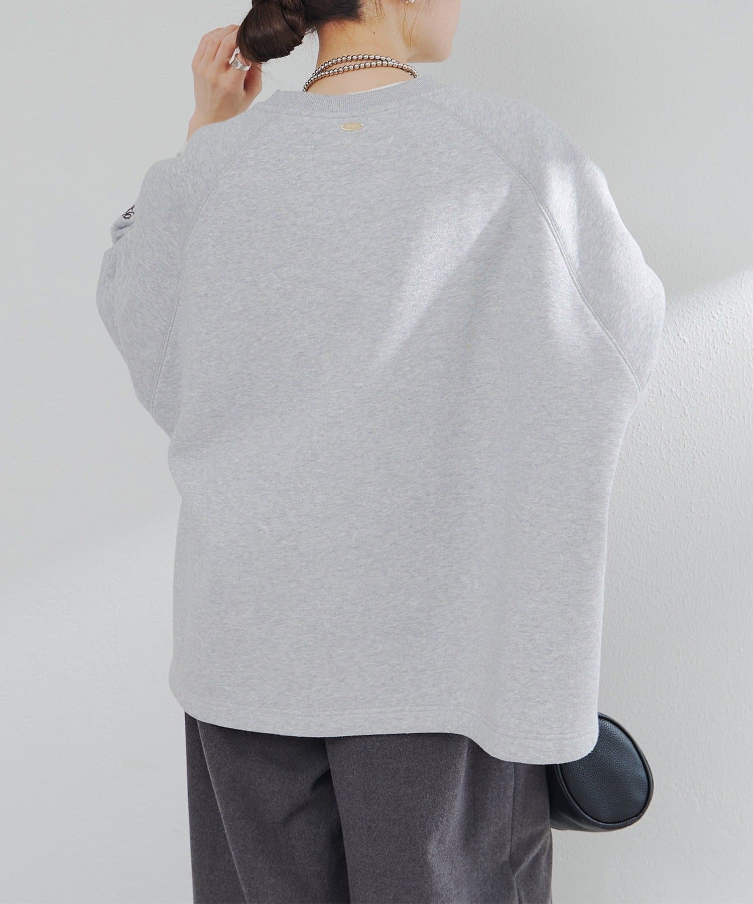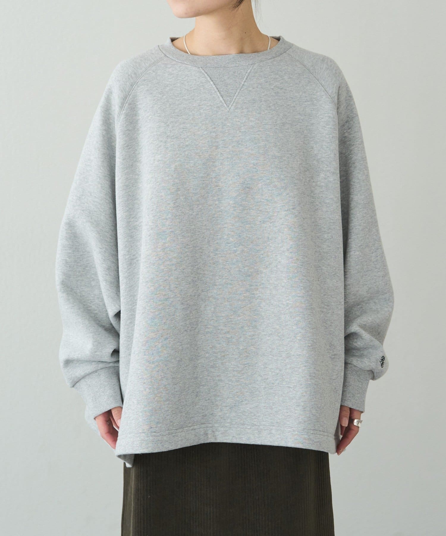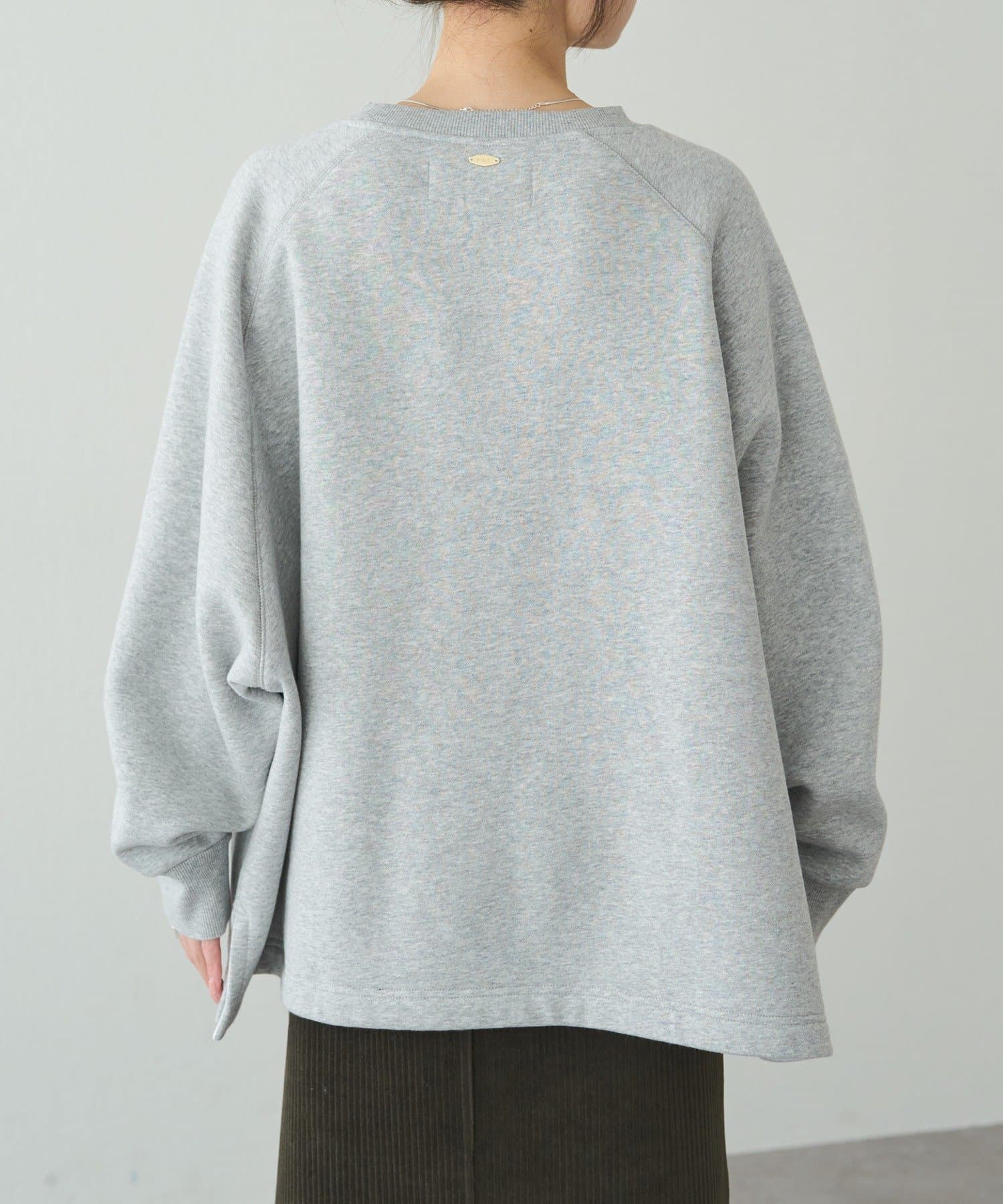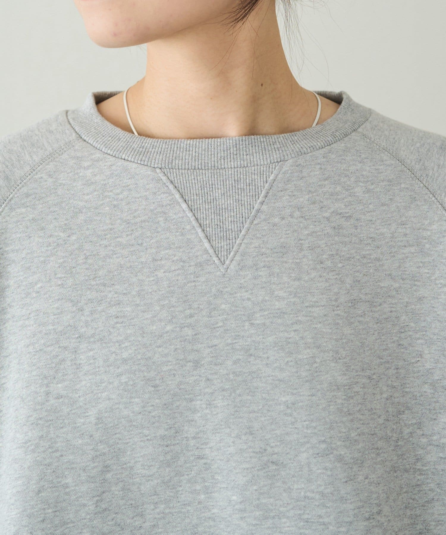 首元のVガゼット、ラグランラインの肩のステッチ、太めの袖リブがスウェットらしいディテールで