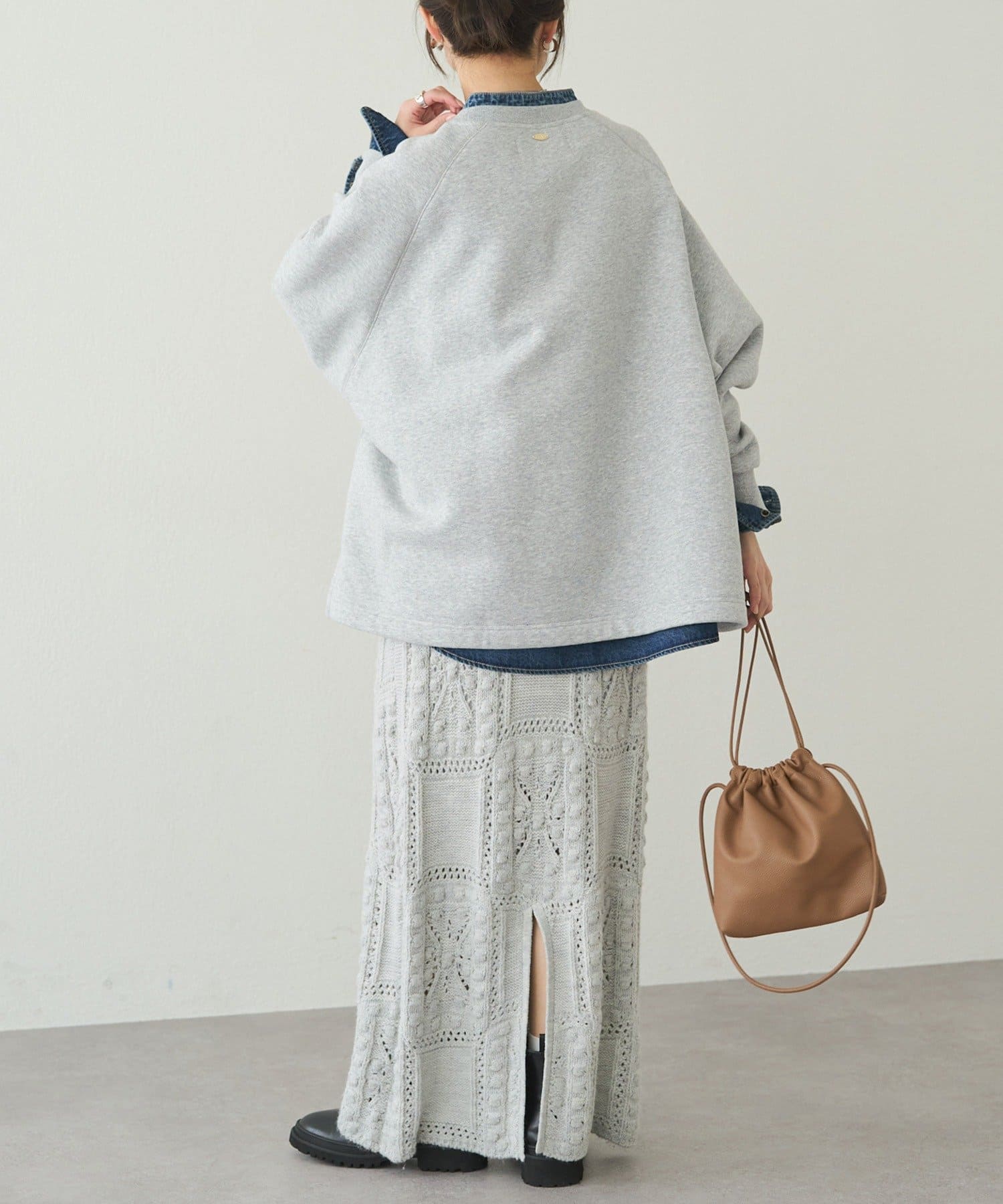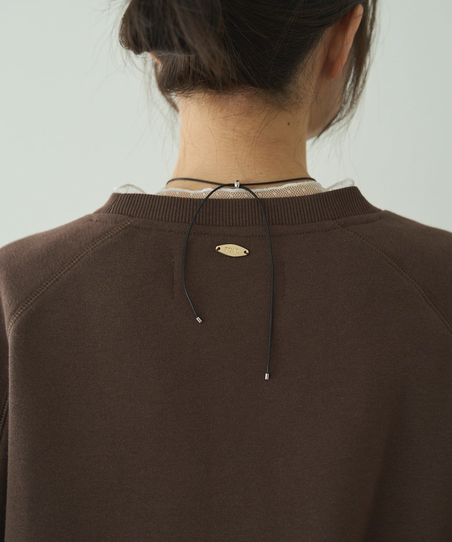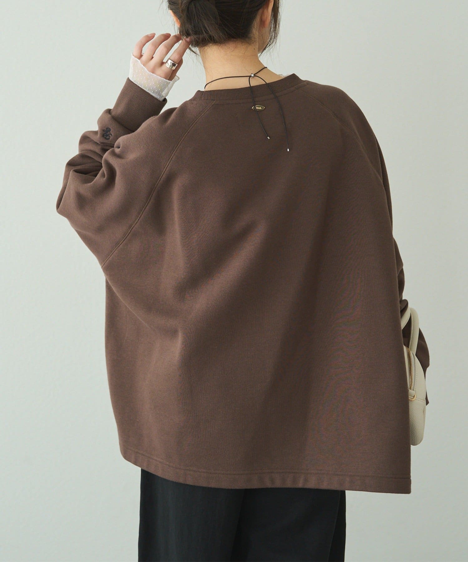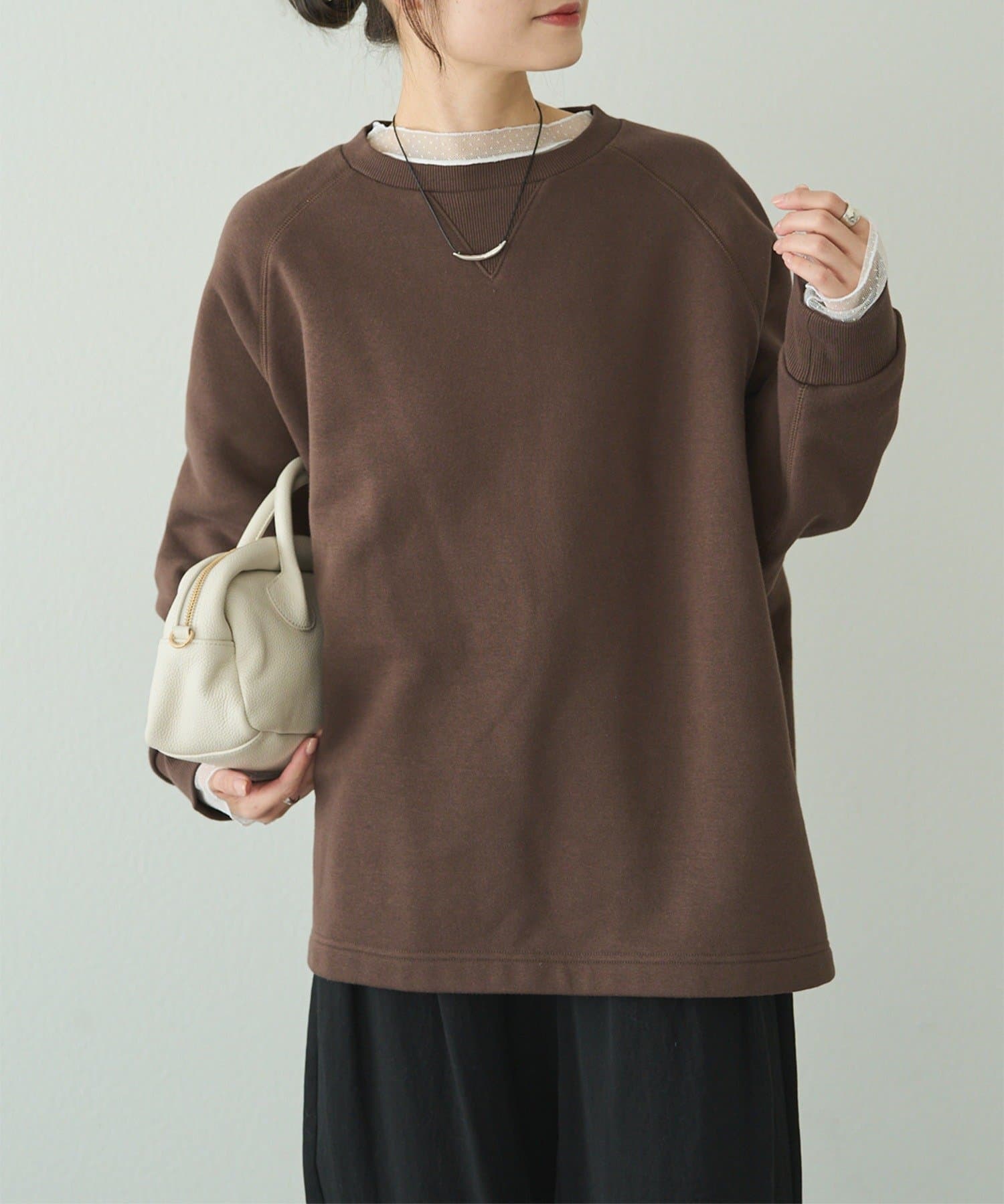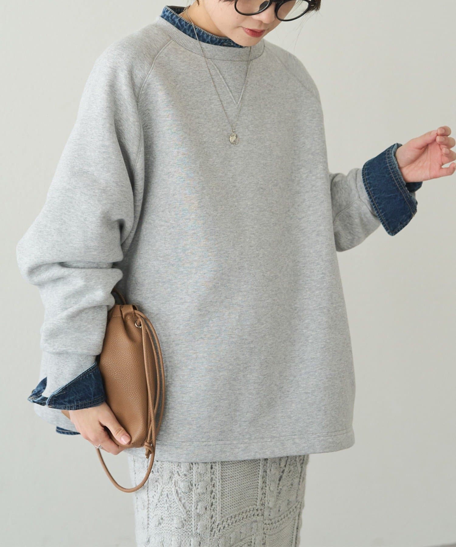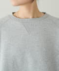 首元のVガゼット、ラグランラインの肩のステッチ、太めの袖リブがスウェットらしいディテールで