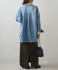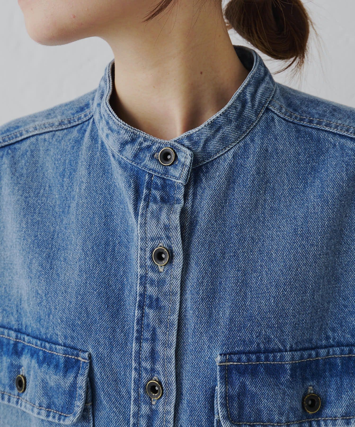 首元を包むようなバンドカラーが顔まわりをシャープに見せ、清潔感と上品さを演出。