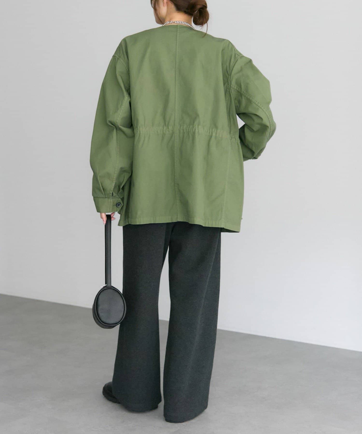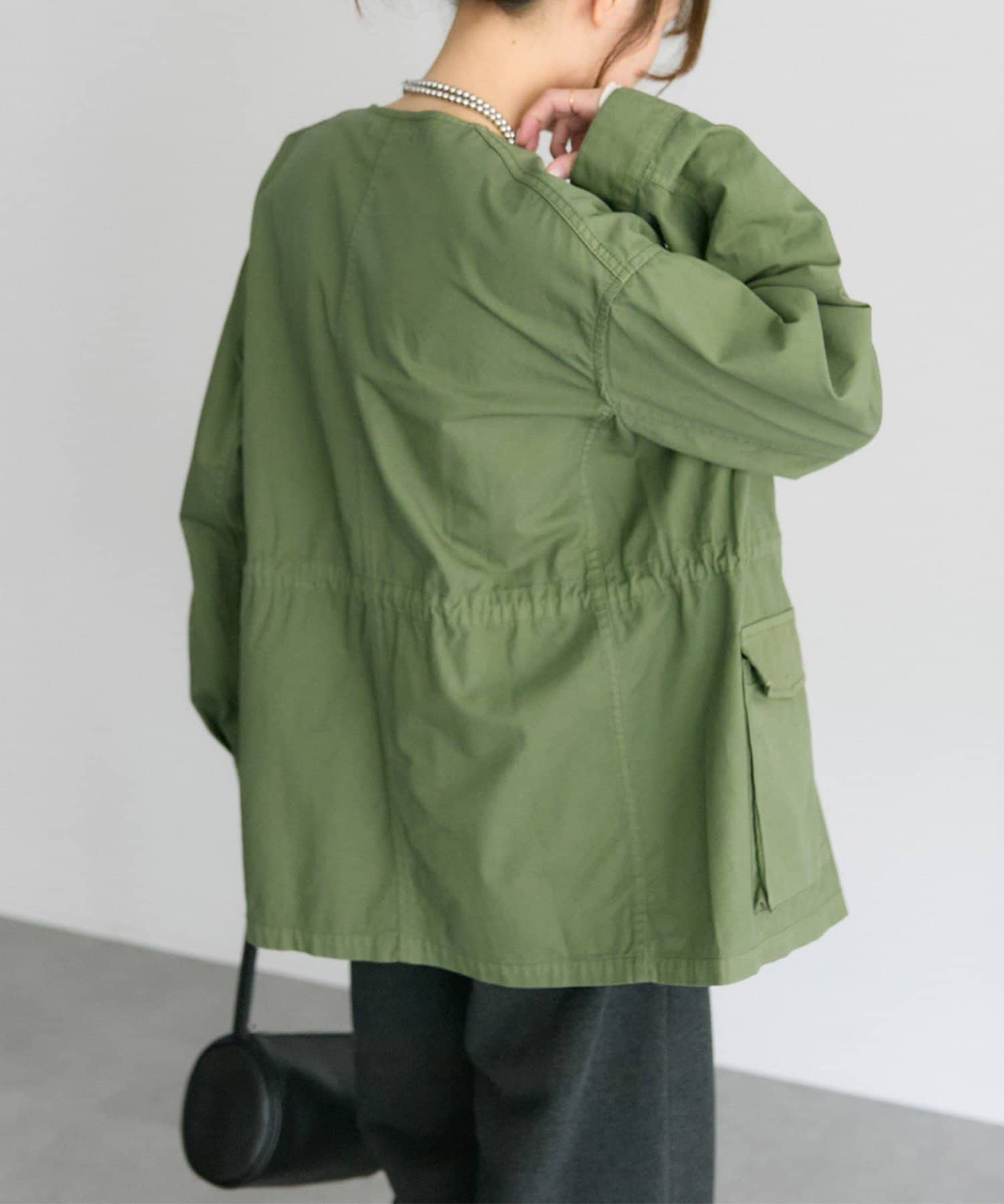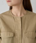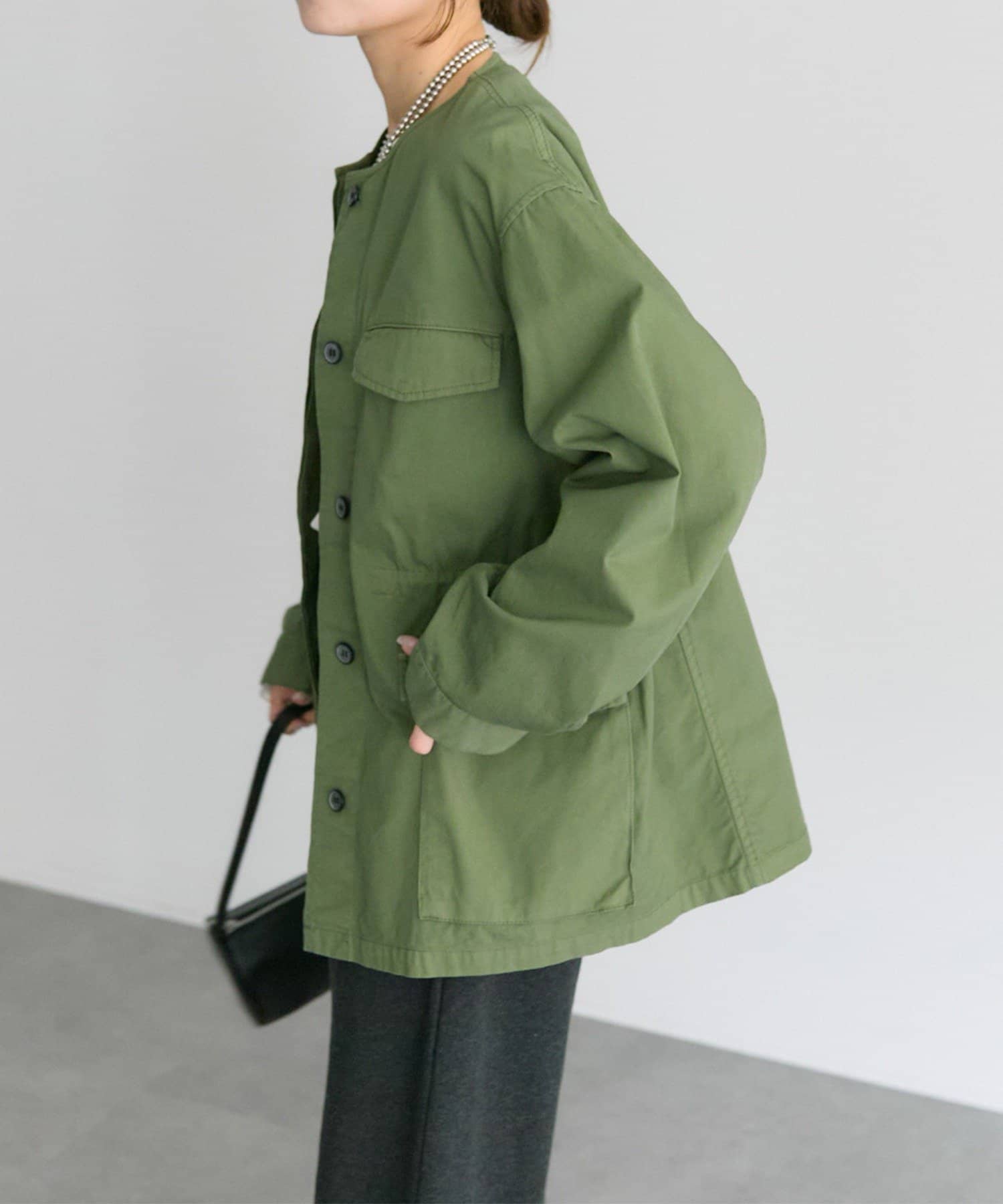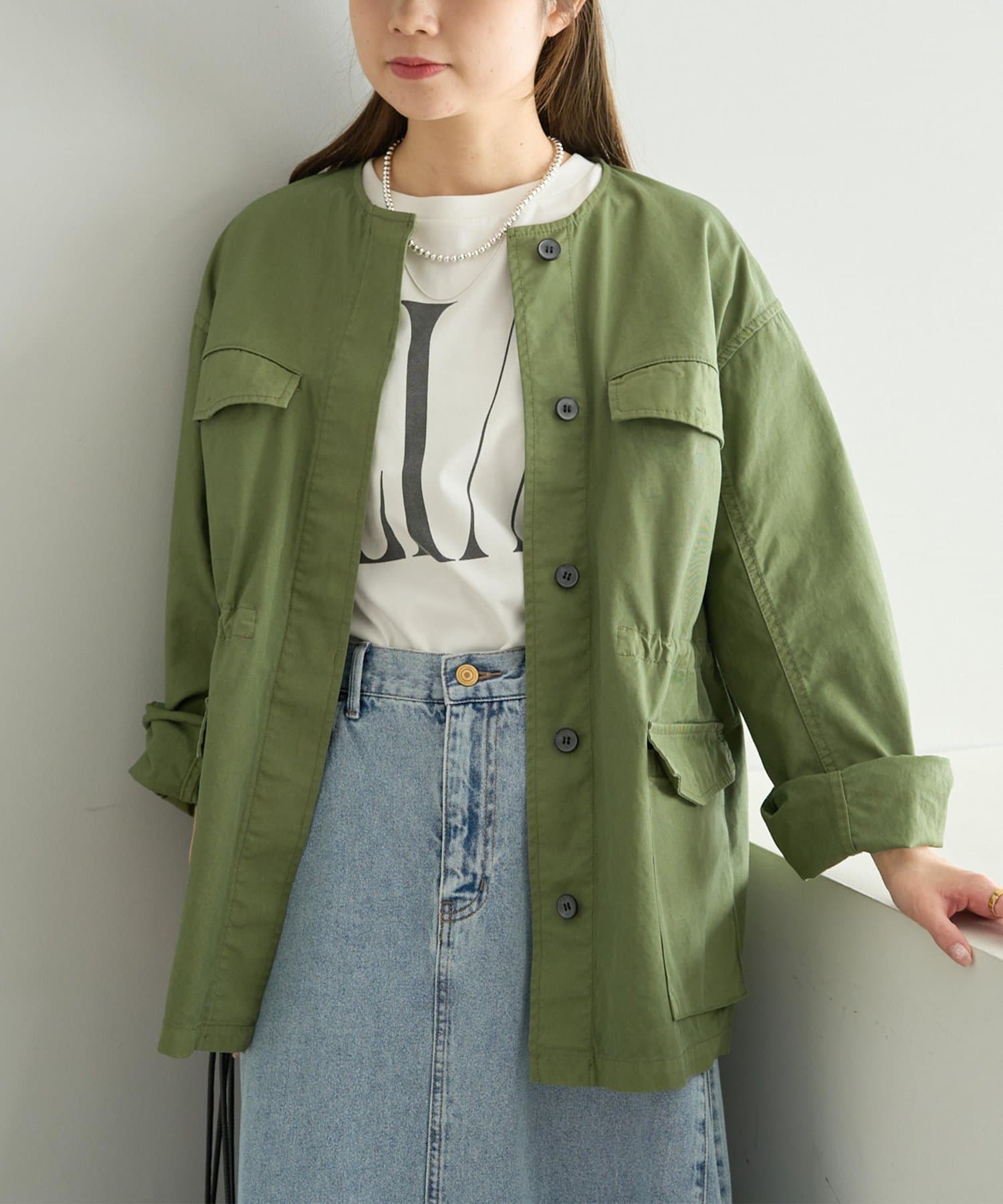 ノーカラーで、堅い印象が和らぎ女性らしいミリタリージャケット。