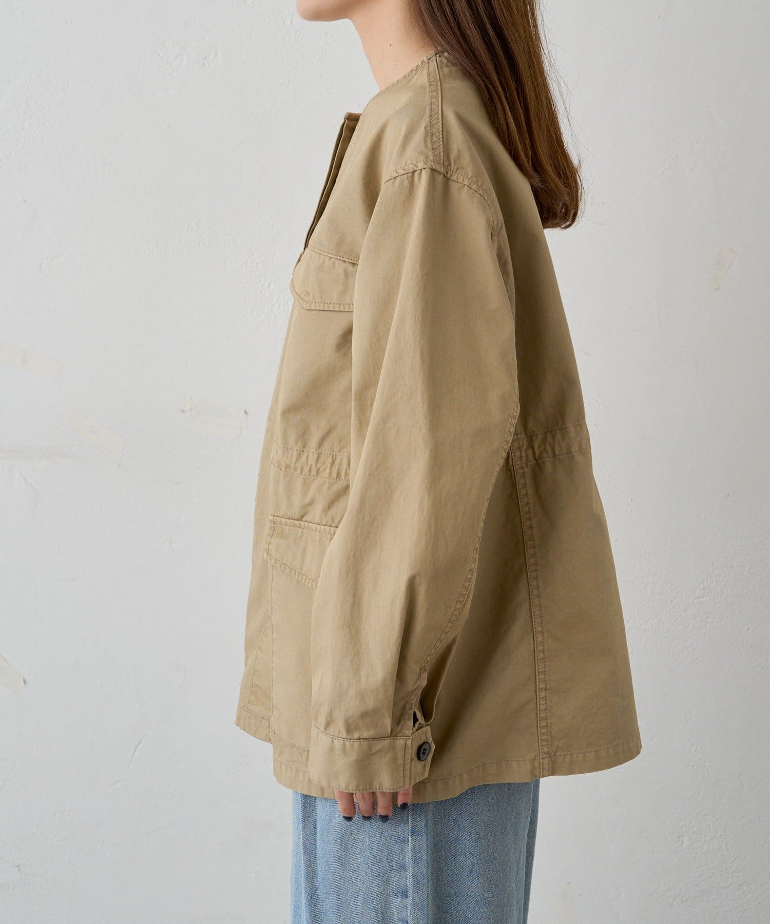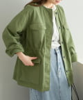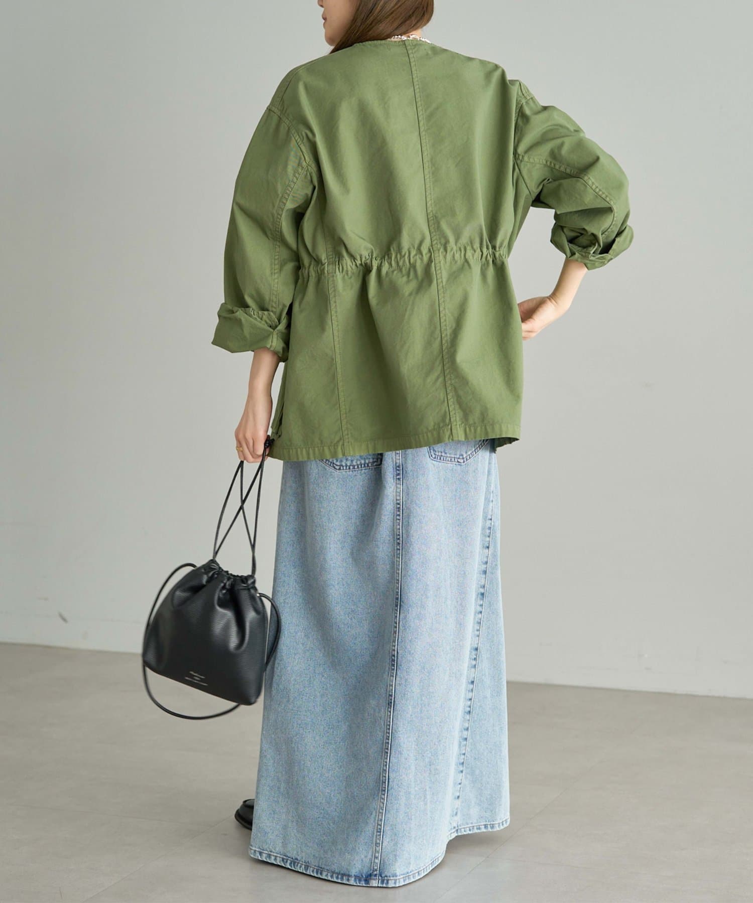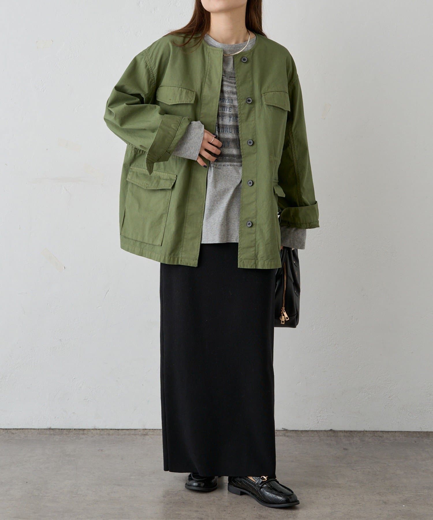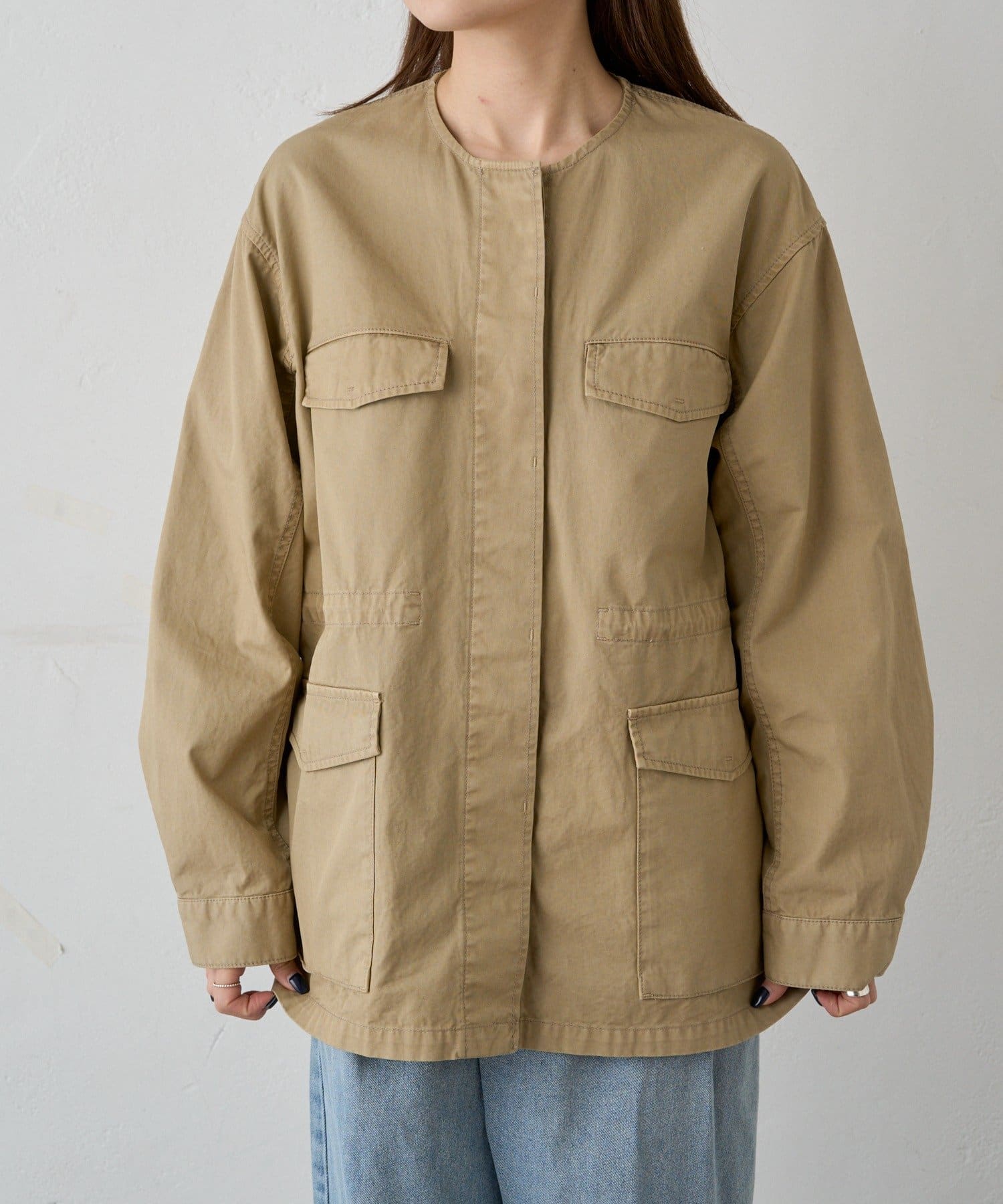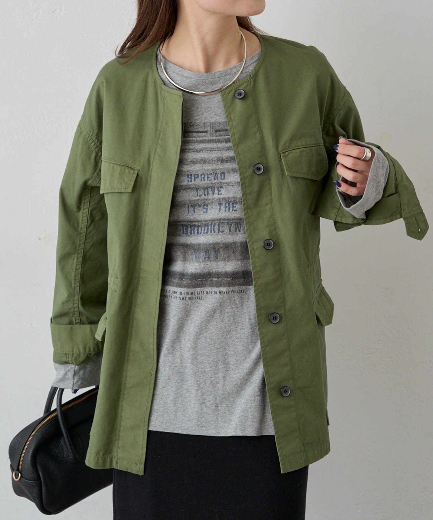 ノーカラーで、堅い印象が和らぎ女性らしいミリタリージャケット。