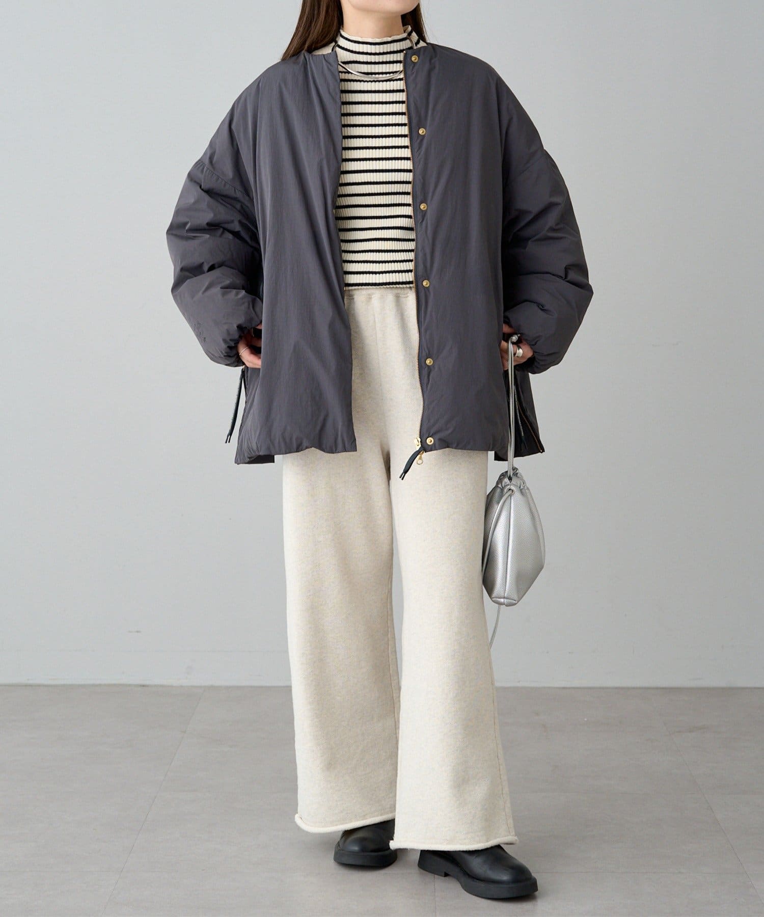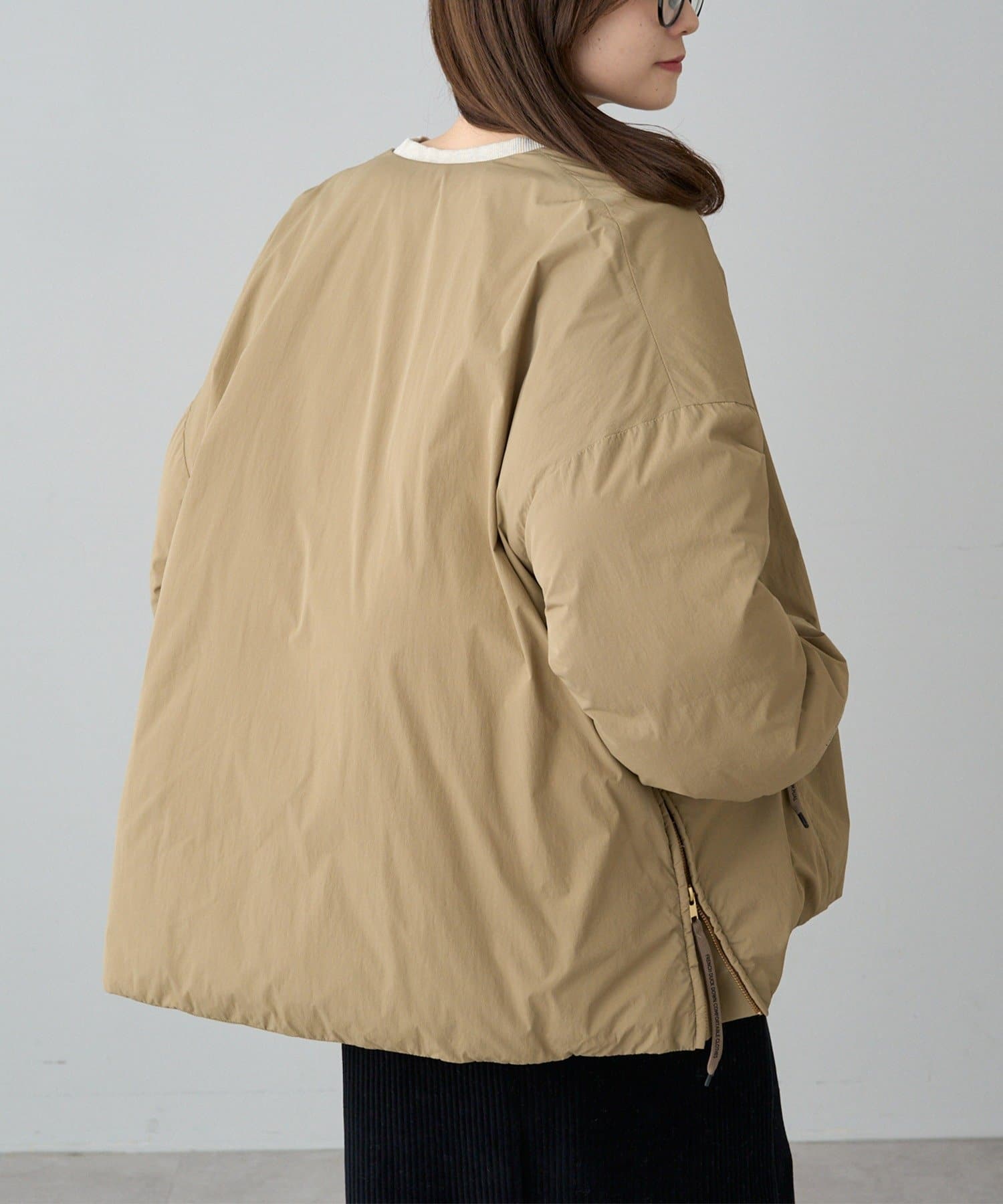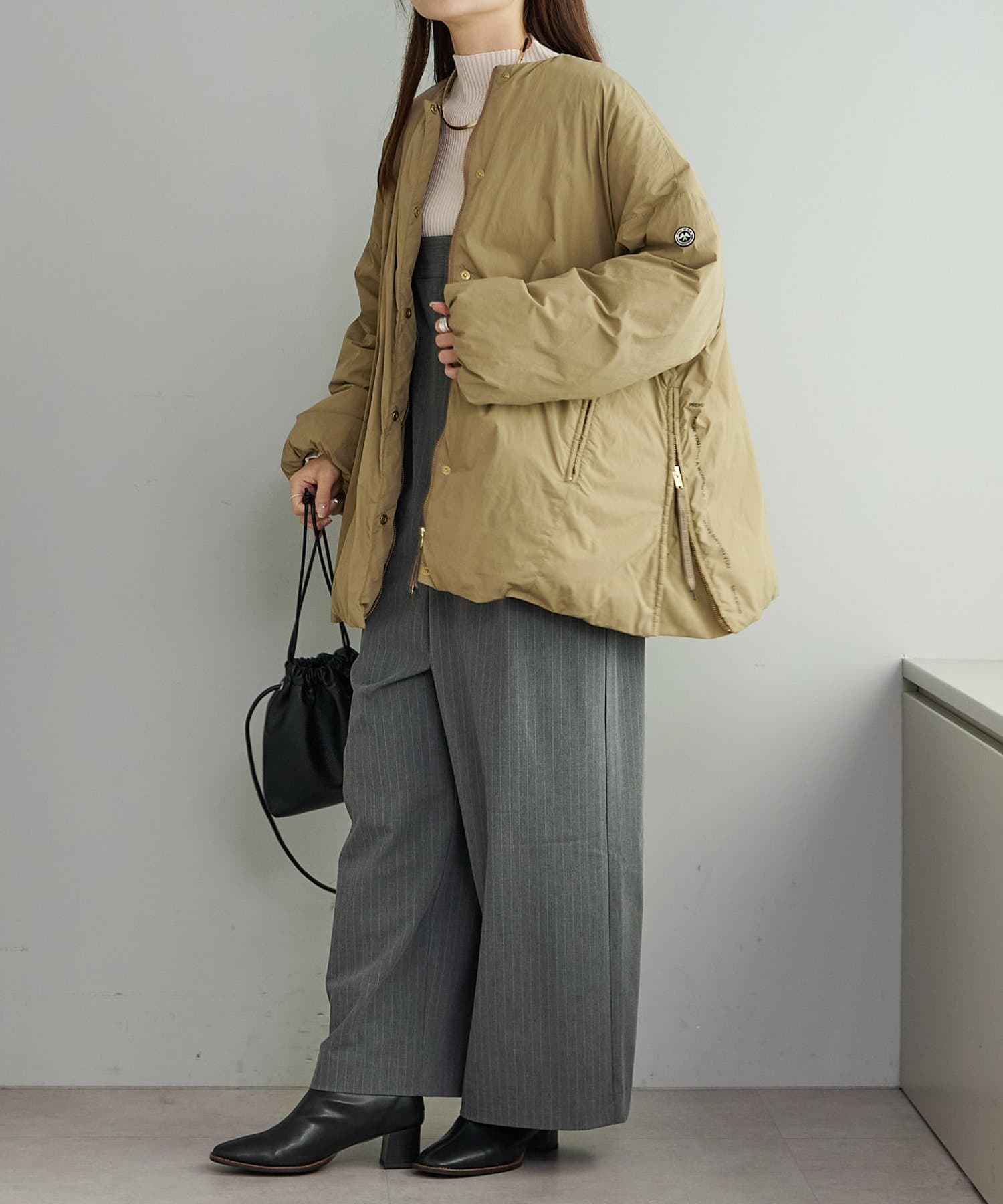 ノーカラーなので、マフラー等の小物使いも自由に楽しめます。