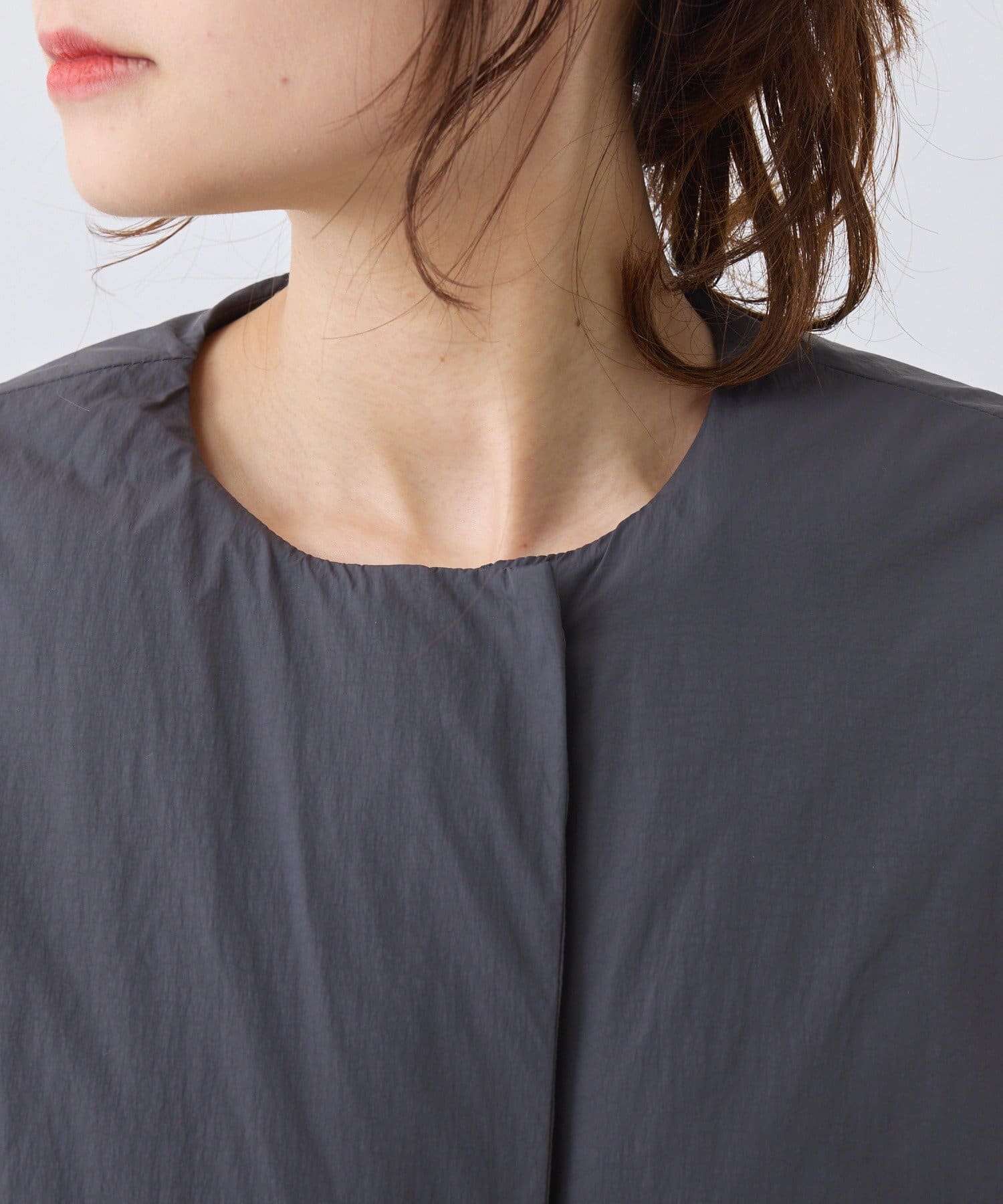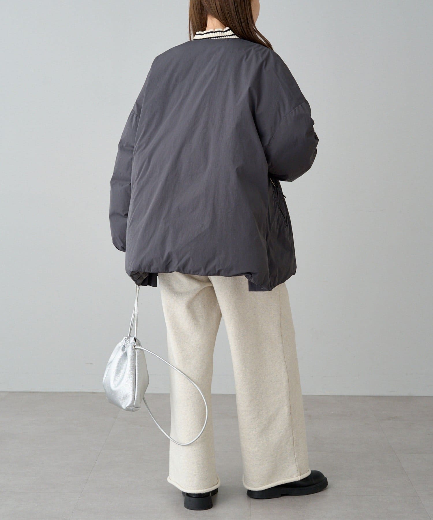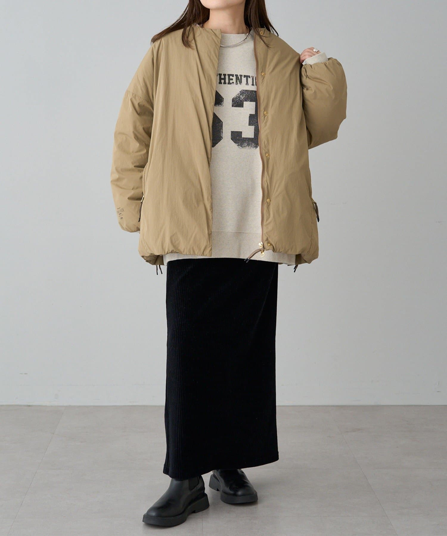 ノーカラーなので、マフラー等の小物使いも自由に楽しめます。