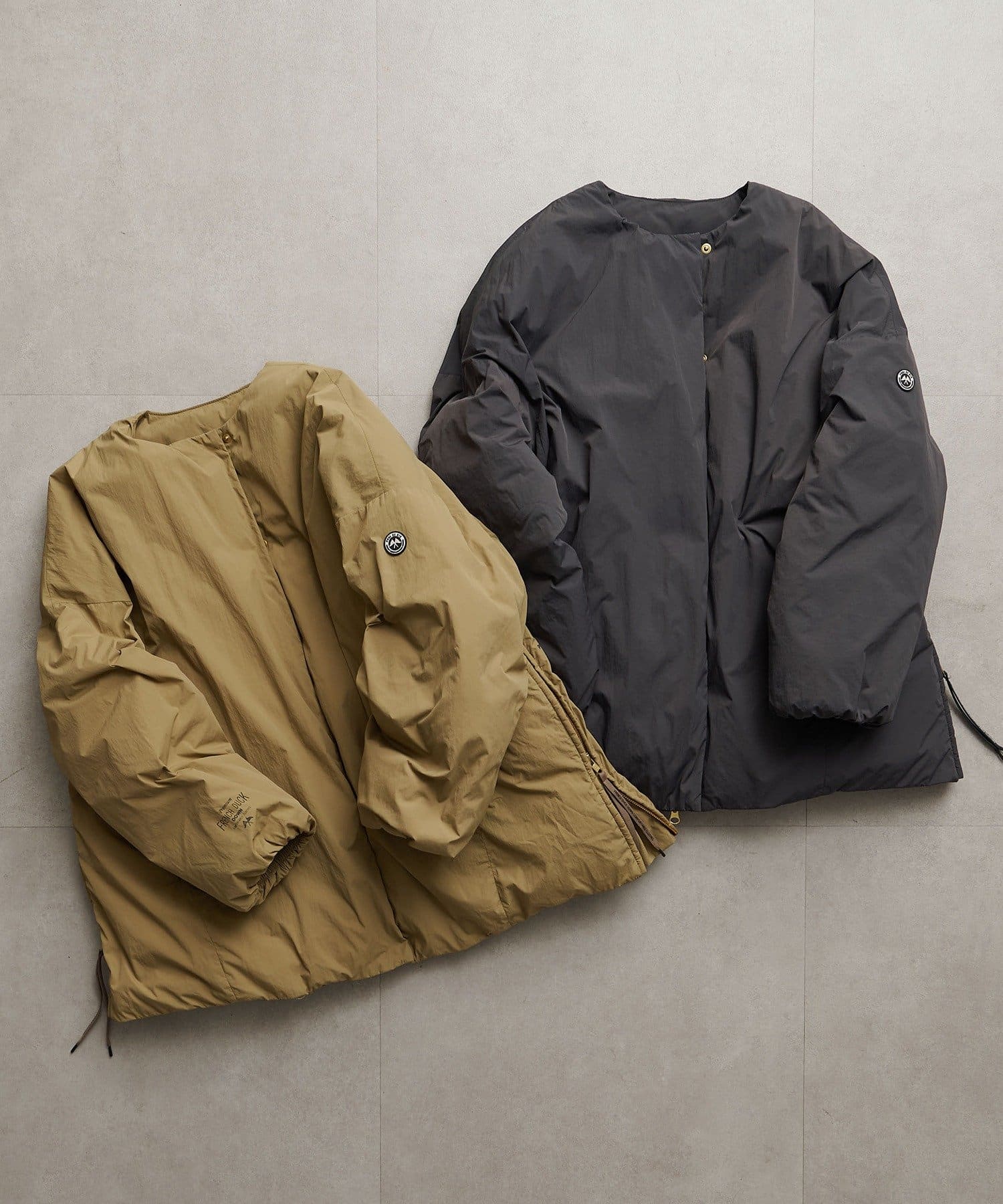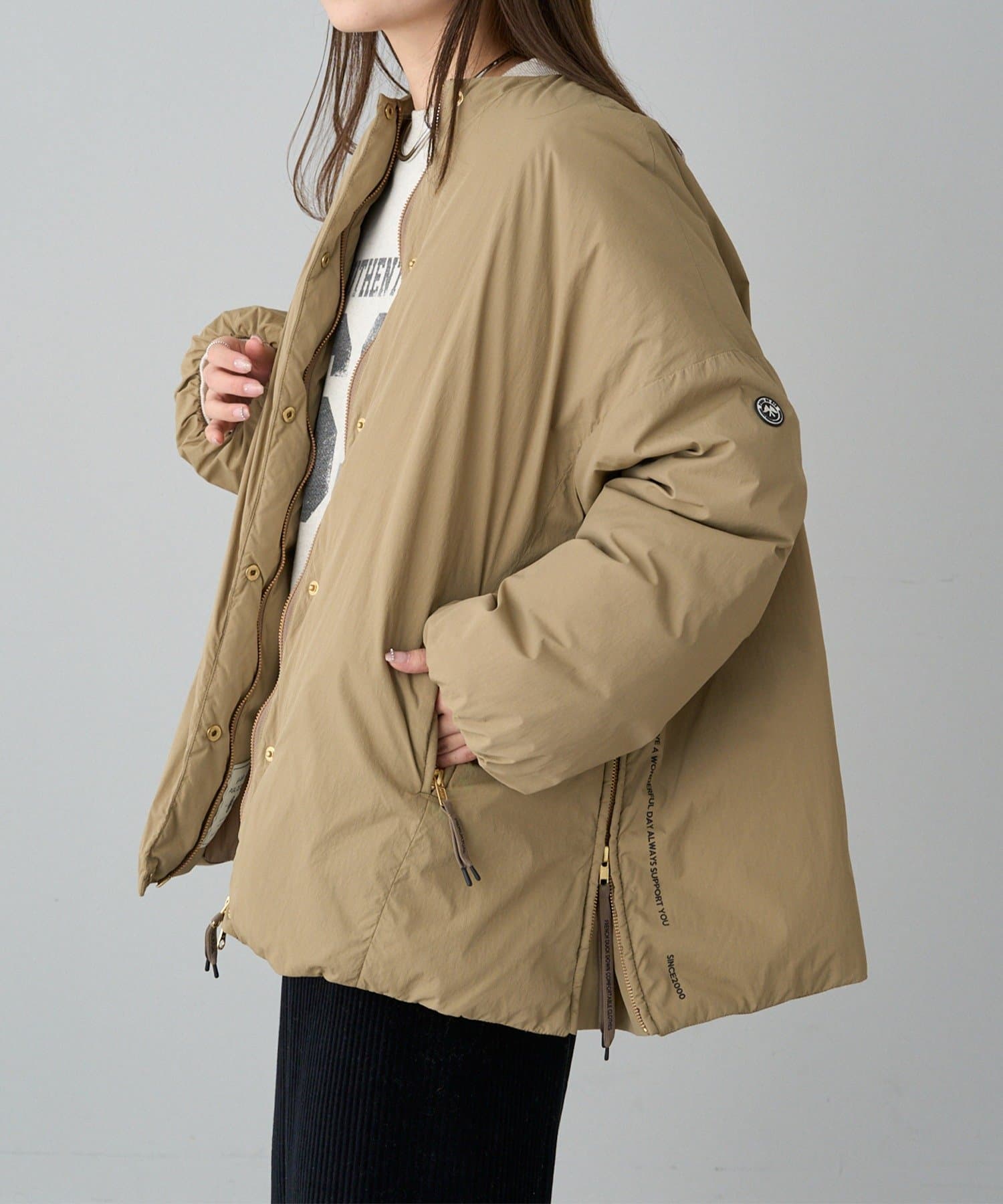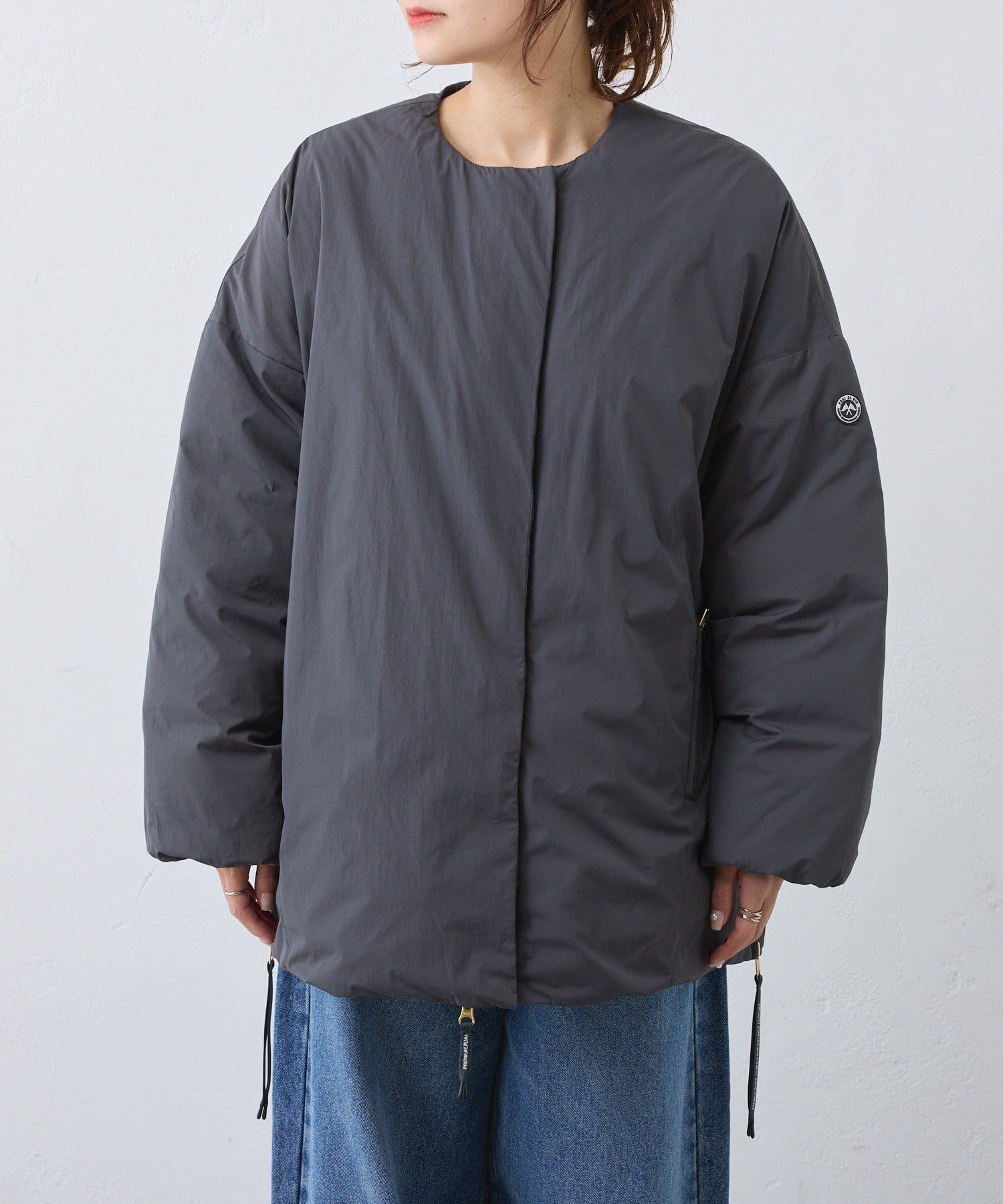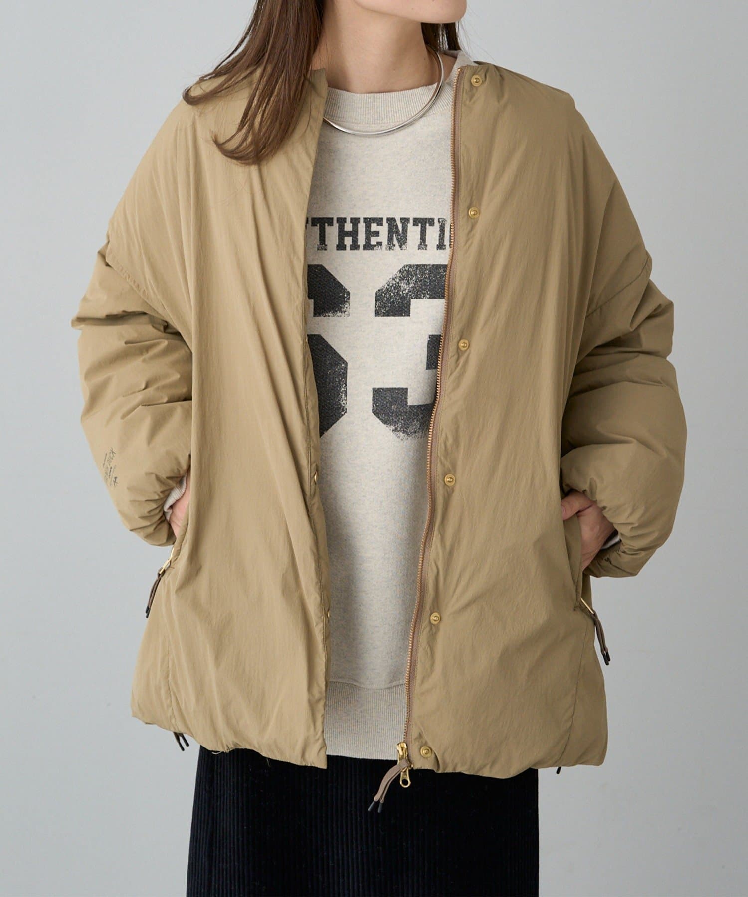 ◇遊び心溢れるディテールにこだわったノーカラーダウンジャケット◇