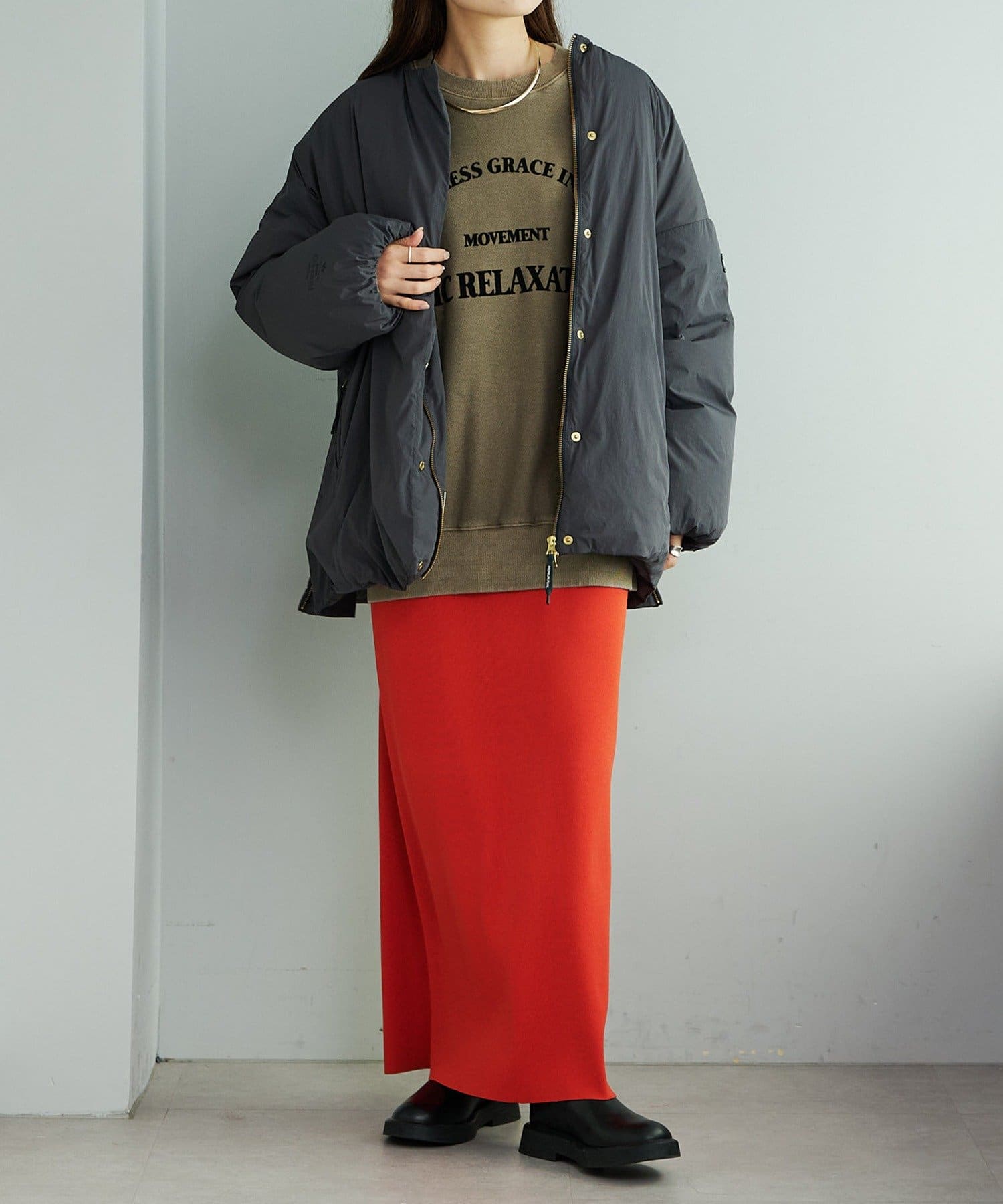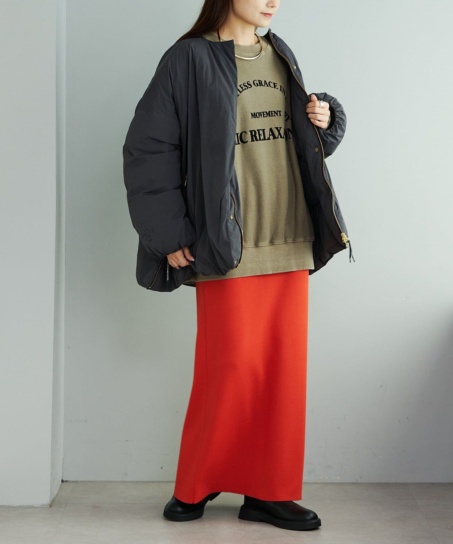 ニットロングワンピースの上にばさっと羽織るスタイリングも