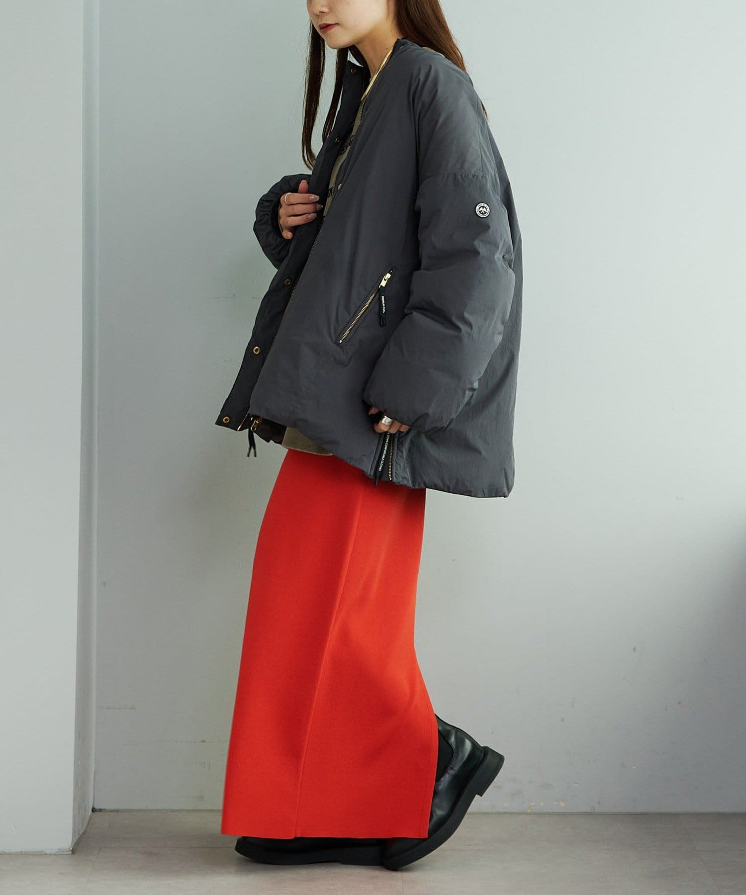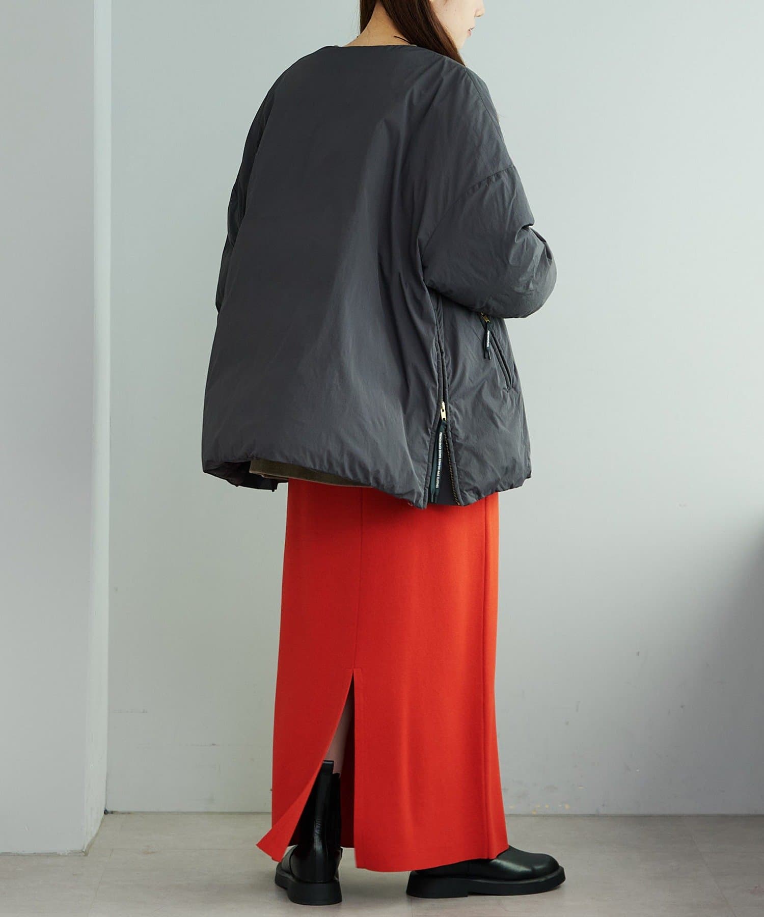 サイドジップを開閉することでシルエットの変化が付けられ、